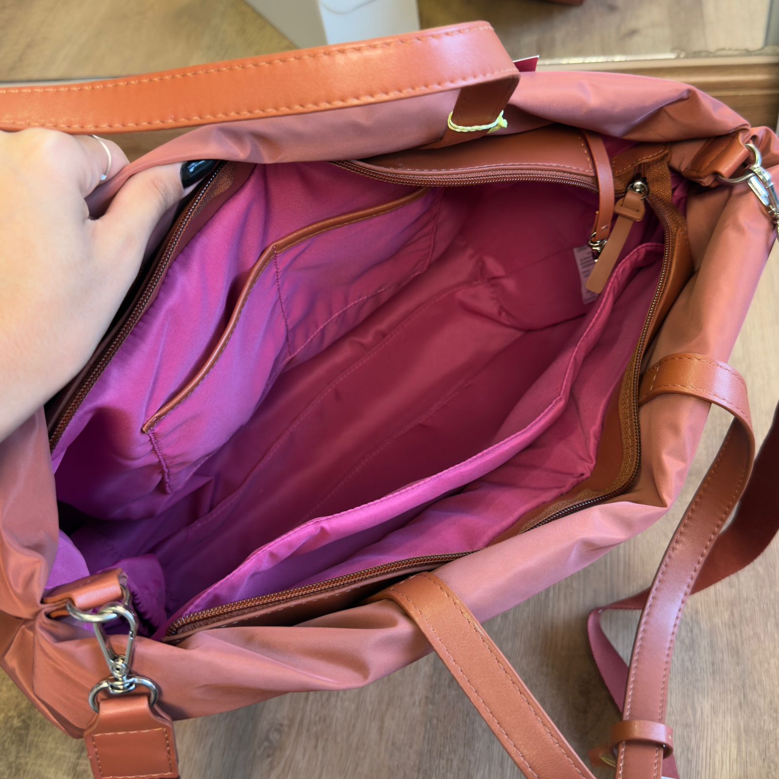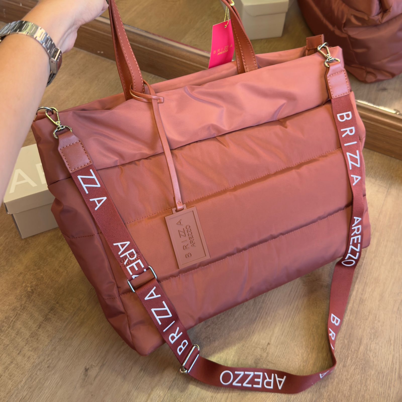 A Bolsa Arezzo GiGi Gigante é confeccionada em nylon marrom de alta qualidade, com design estruturado que alia elegância e funcionalidade. Possui duas alças de mão e uma alça lateral longa, removível e regulável em gorgurão com a inscrição Arezzo Brizza, garantindo conforto e versatilidade no uso. O fecho superior em zíper assegura a segurança dos pertences, complementado por divisórias internas, porta notebook e porta-chaves que organizam seus itens com praticidade. Detalhes como as capas com costuras estofadas e o bag charm emborrachado com o nome da marca valorizam o acabamento premium da peça.