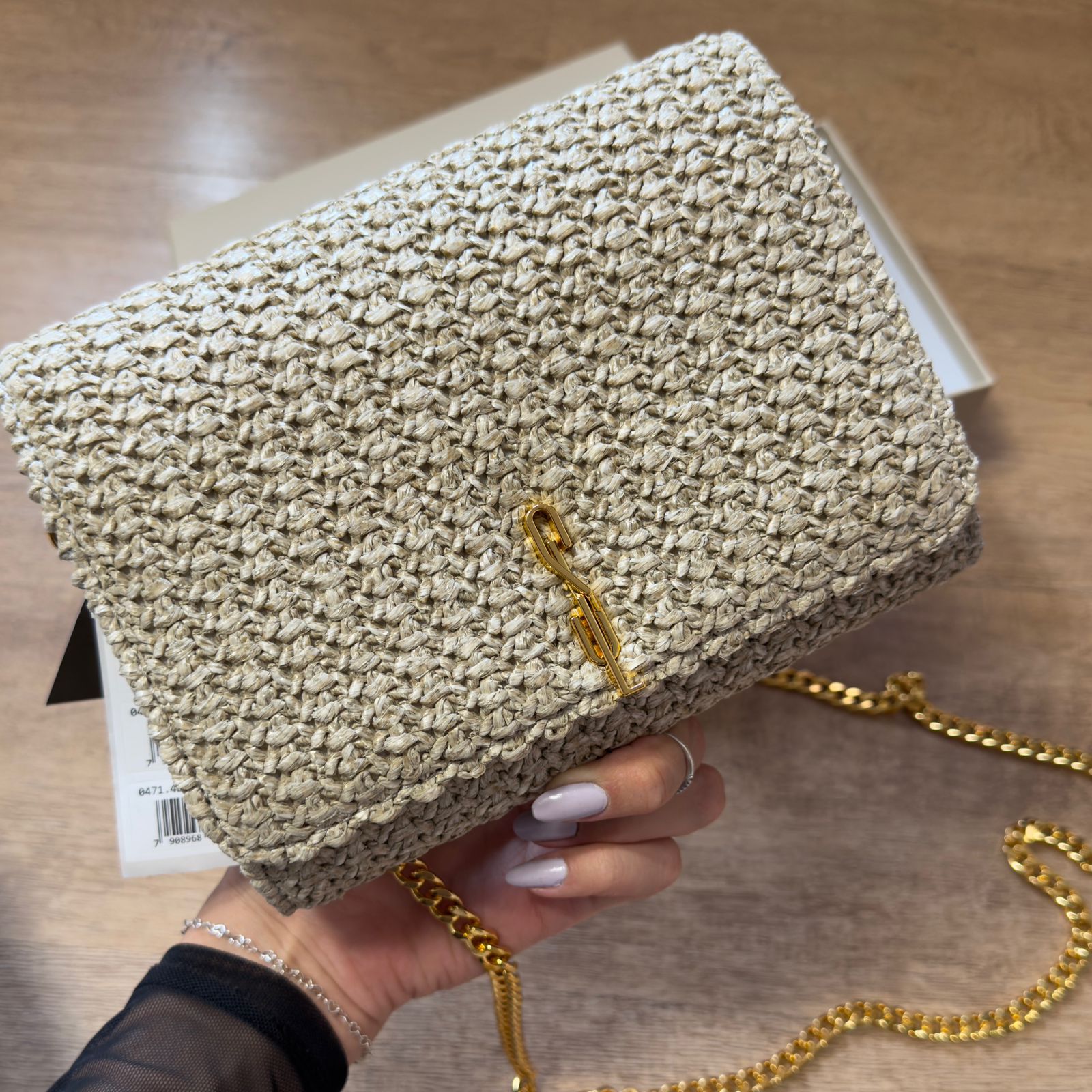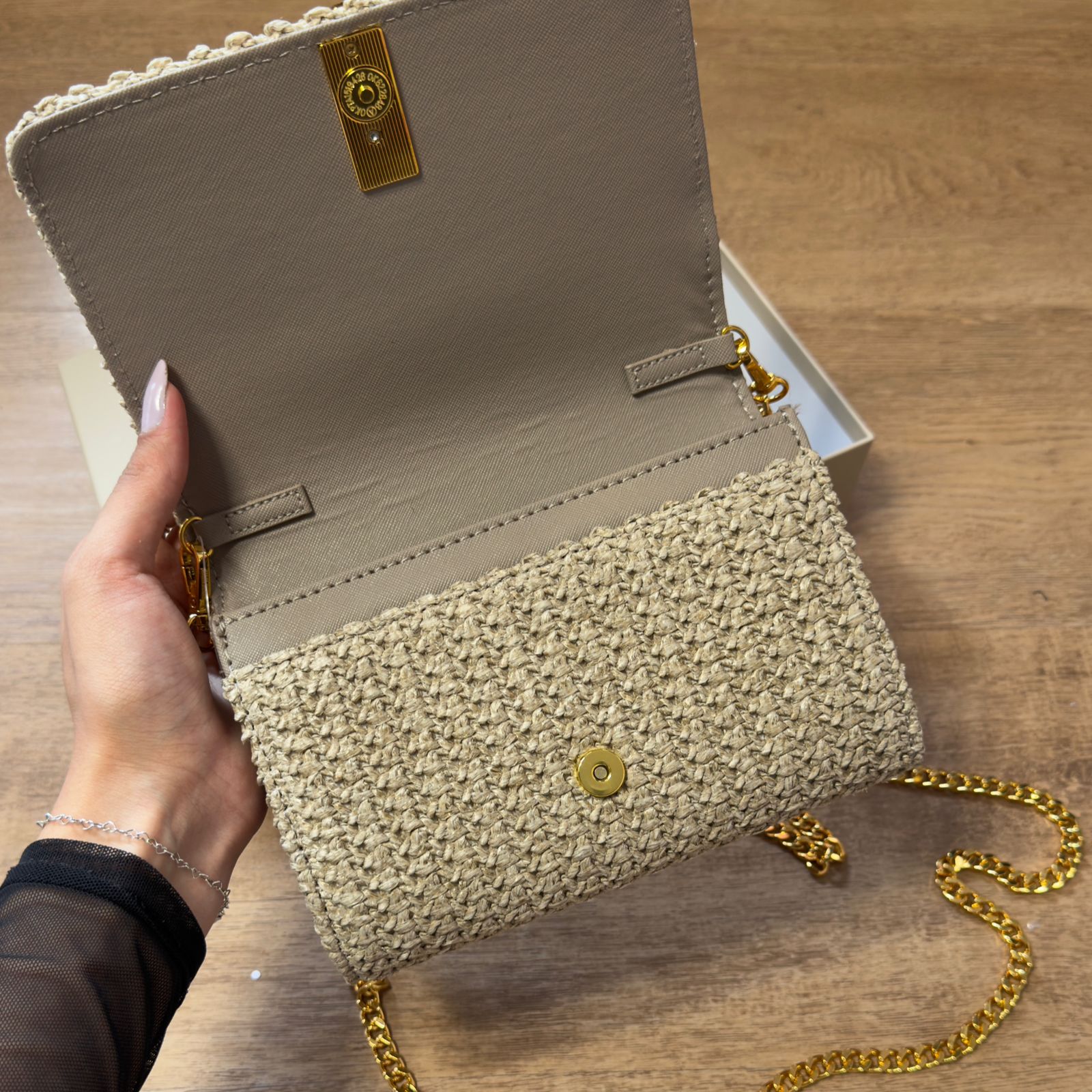 Bolsa carteira confeccionada em tramado e floater, um material natural que confere textura e sofisticação ao acessório. Conta com alça transversal de corrente, proporcionando praticidade e estilo contemporâneo. Perfeita para quem busca uma peça versátil, funcional e cheia de personalidade para o dia a dia ou eventos especiais.