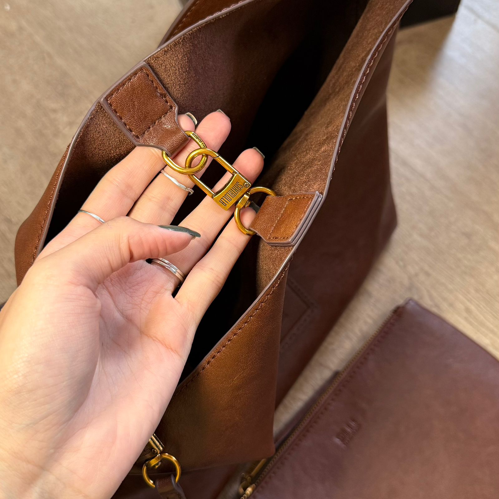 A Bolsa Santa Lolla Marrom Com Clutch é o equilíbrio perfeito entre sofisticação e praticidade. Com um design contemporâneo e acabamento impecável, ela é confeccionada em material floater que traz uma textura levemente granulada, garantindo durabilidade e um toque de elegância. O tom marrom camelo é neutro e atemporal, ideal para compor looks versáteis e estilosos. Acompanha uma clutch removível no mesmo material, perfeita para organizar pequenos itens ou ser usada separadamente em ocasiões mais descontraídas.