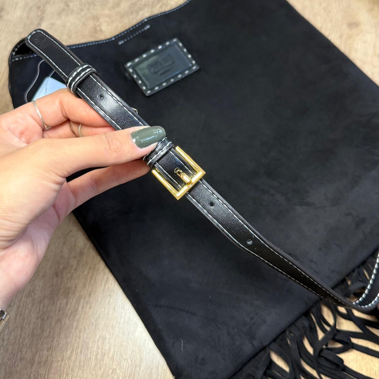Bolsa confeccionada em camurça com acabamento macio e toque aveludado. O modelo traz alça transversal ajustável e detalhe em franjas, que adiciona movimento e estilo boho à peça. Compacta e cheia de personalidade, é perfeita para acompanhar produções casuais com charme e autenticidade.