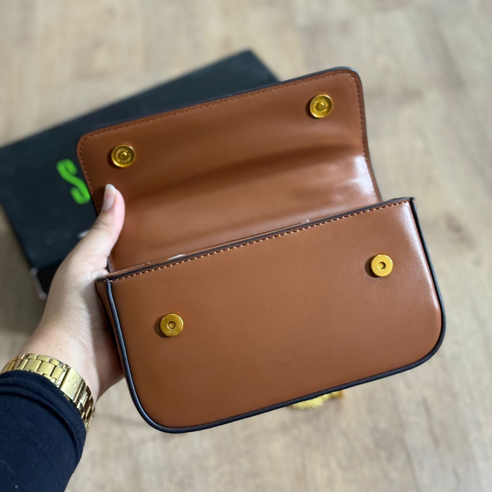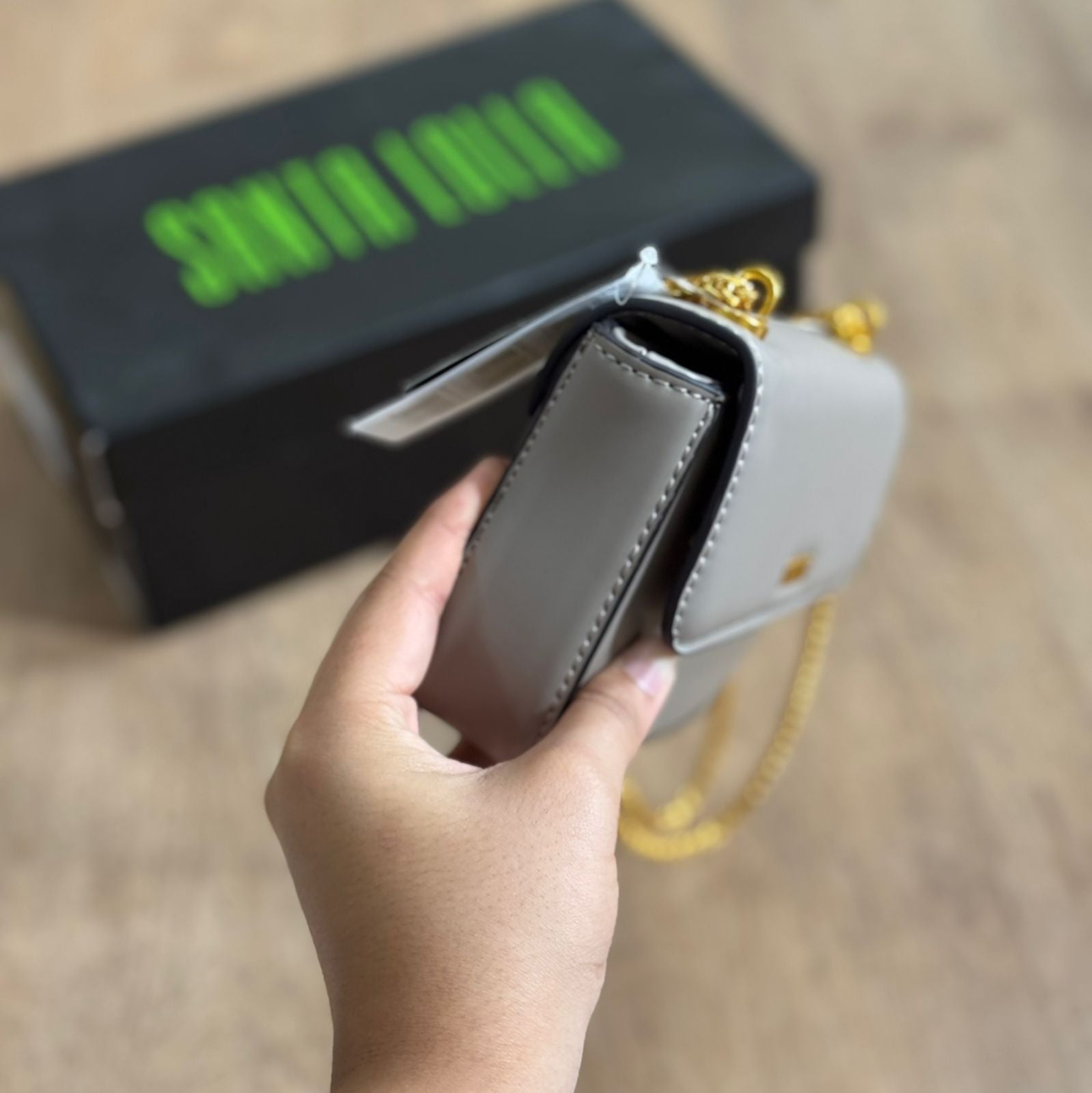 Bolsa confeccionada em material metalizado, com alça transversal em corrente que combina estilo e praticidade. Design compacto e moderno, ideal para carregar itens essenciais com elegância em diferentes ocasiões.