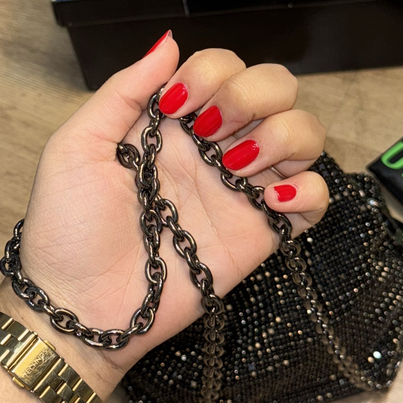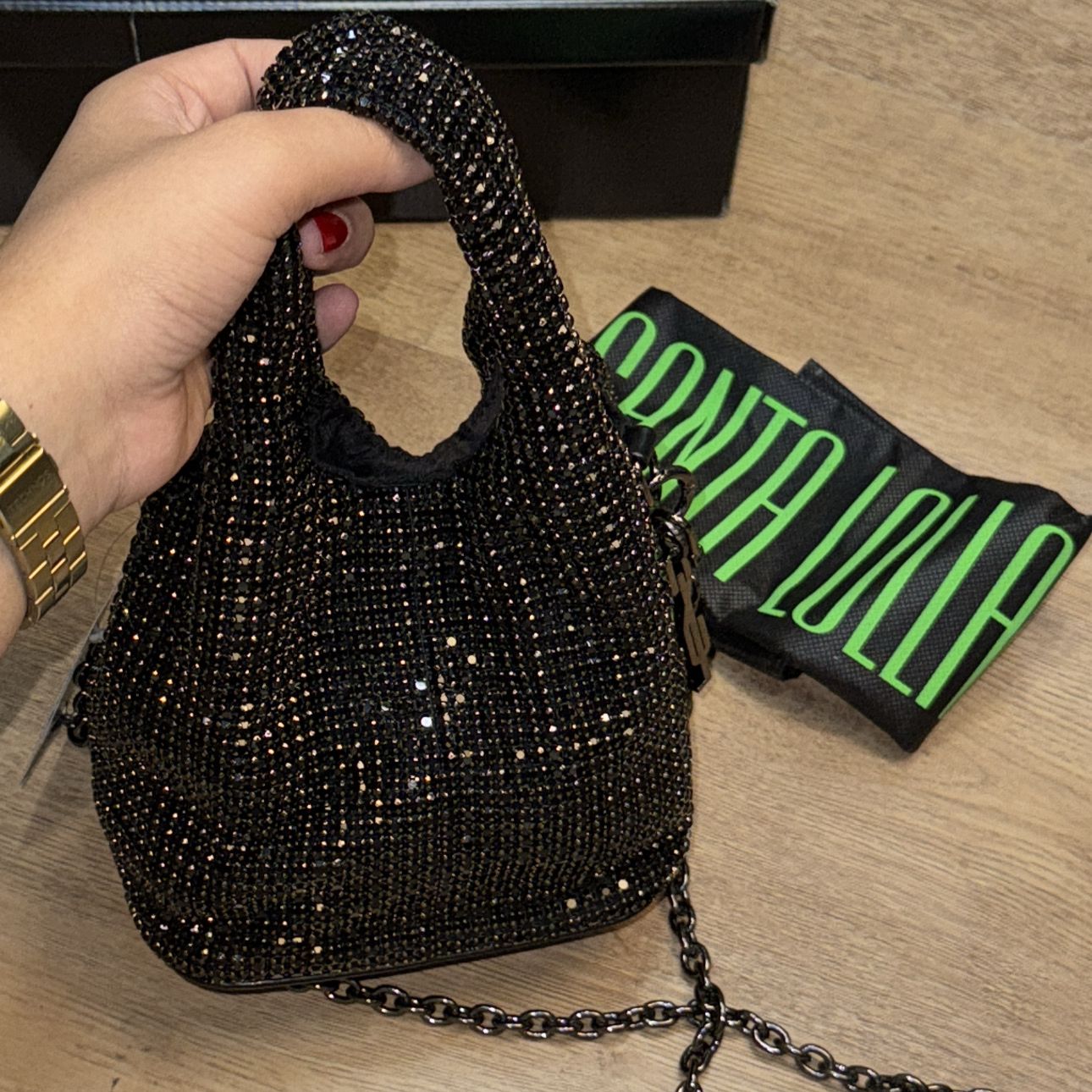 Bolsa confeccionada em malha cristal, com aplicação de strass brilhantes que criam um visual sofisticado e glamouroso. Possui alça de ombro e corrente removível para uso transversal. O design moderno e elegante é perfeito para eventos noturnos e ocasiões especiais.