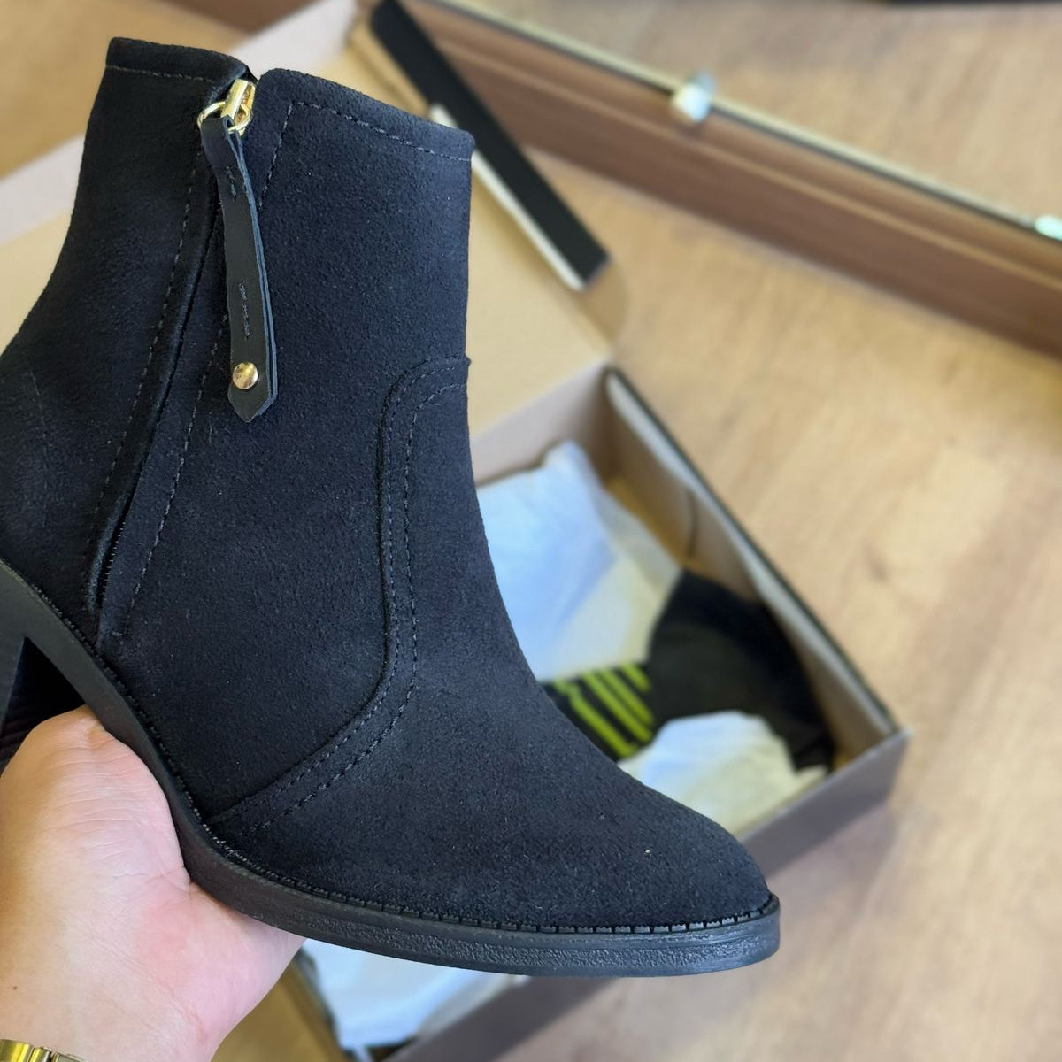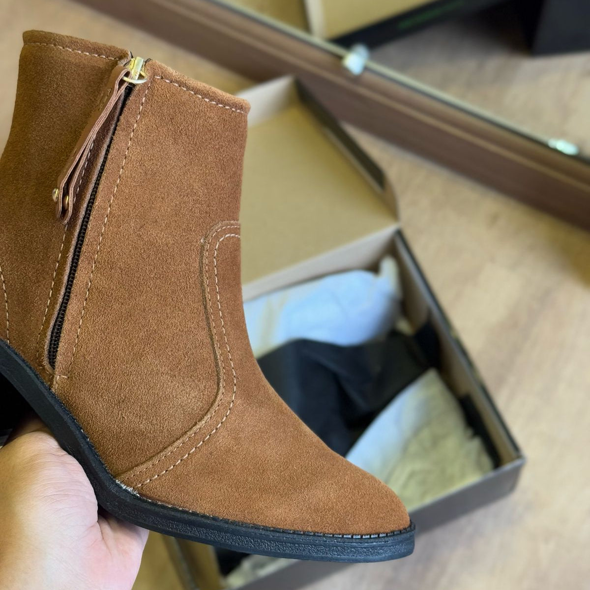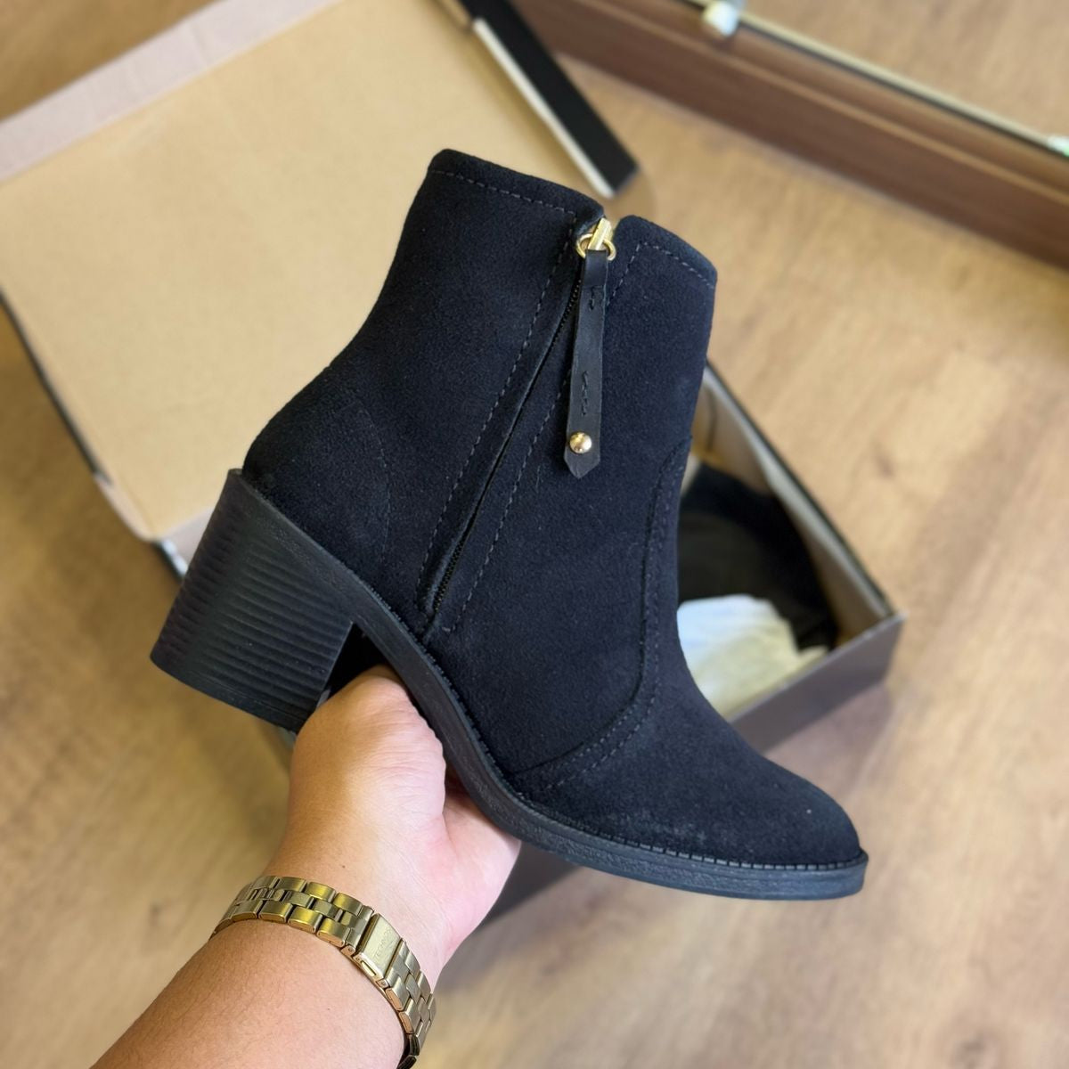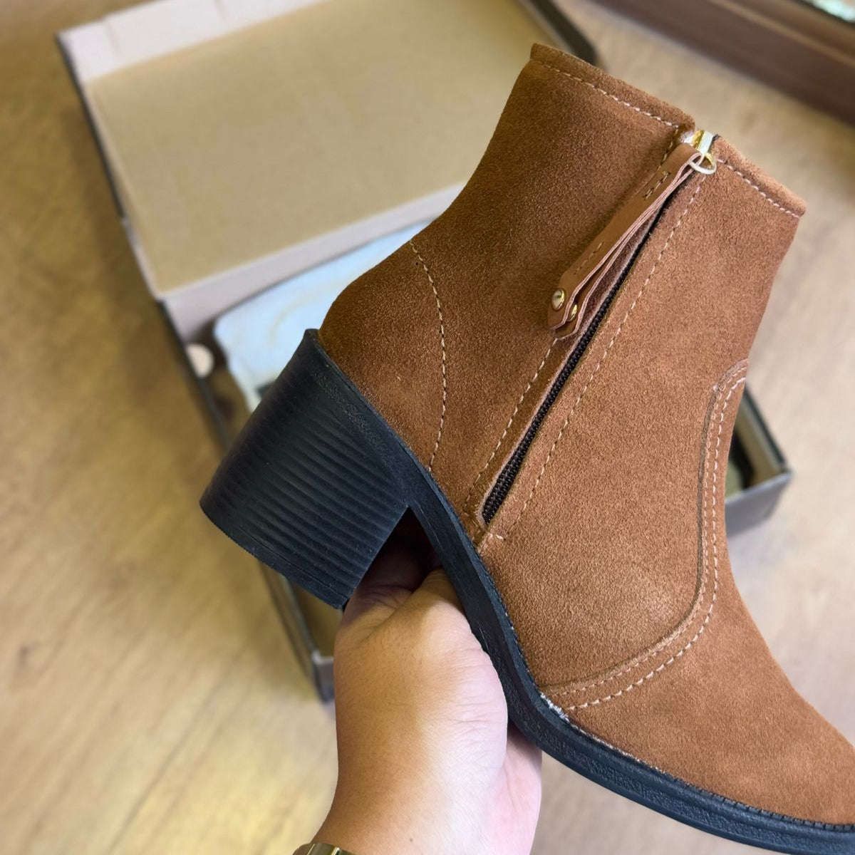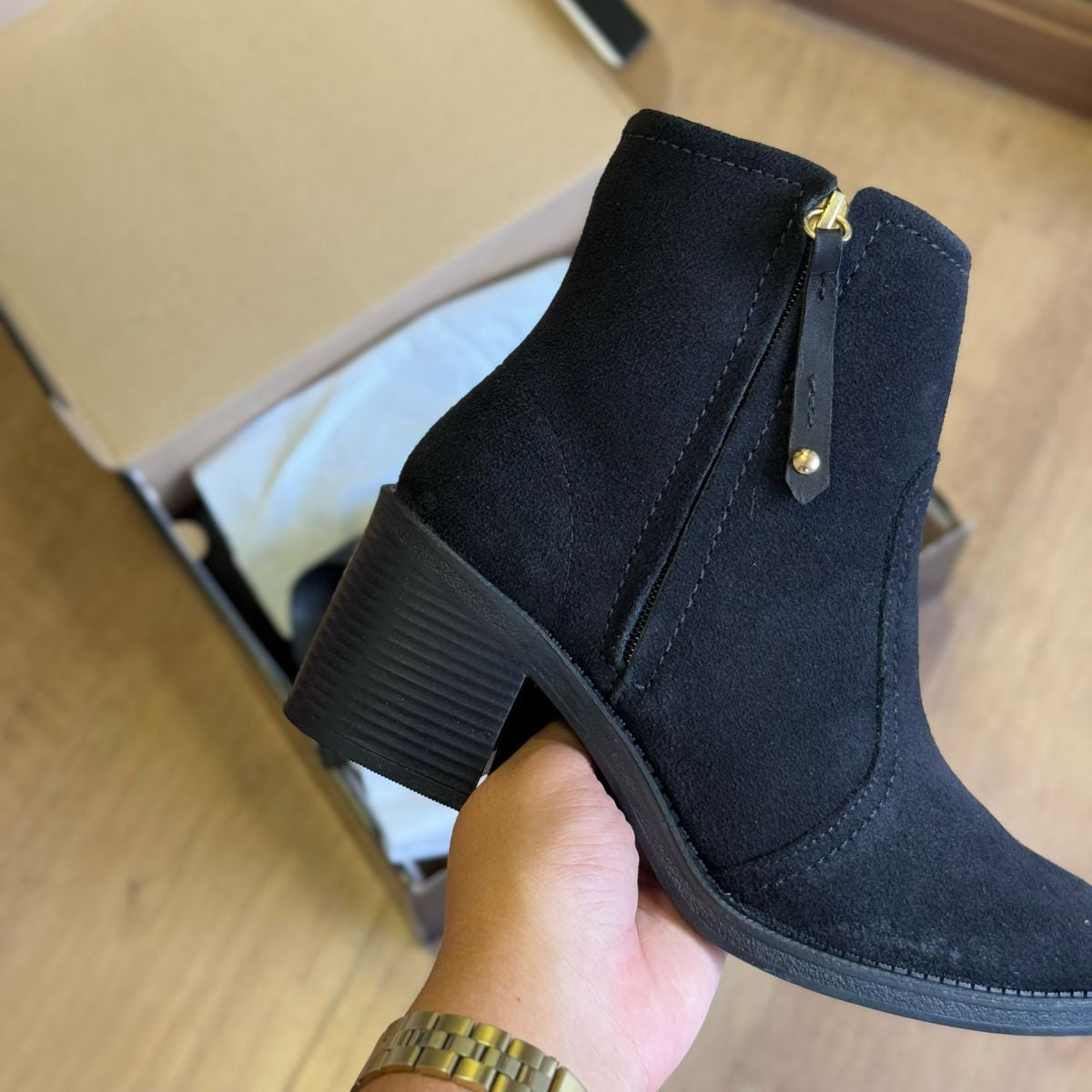 Bota confeccionada em material couro camurça. Possui cano curto, zíper na lateral e salto grosso baixo para proporcionar um visual elegante e confortável. Esse modelo é perfeito para quem busca praticidade e um toque moderno.