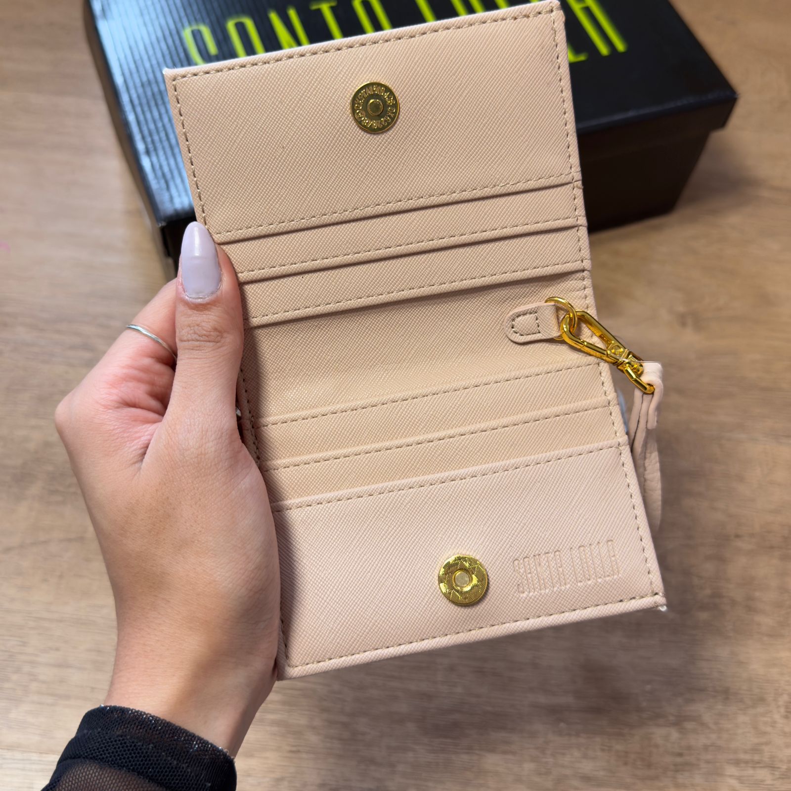 Carteira feminina confeccionada em material têxtil, apresentando um formato pequeno estruturado e retangular. Possui alça fina removível adiciona versatilidade ao acessório, divisórias projetadas para organizar seus cartões de forma prática e eficiente. O fechamento por botão de ímã com detalhe do logotipo que garante segurança aos seus pertences. Ela é uma ótima opção para quem precisa carregar cartões no dia a dia, seja para ir ao trabalho ou para fazer compras com muito estilo.