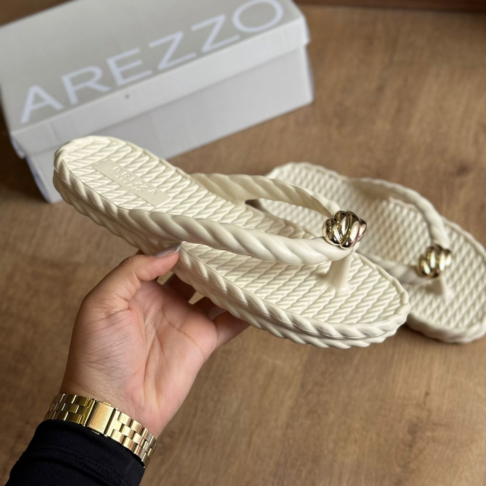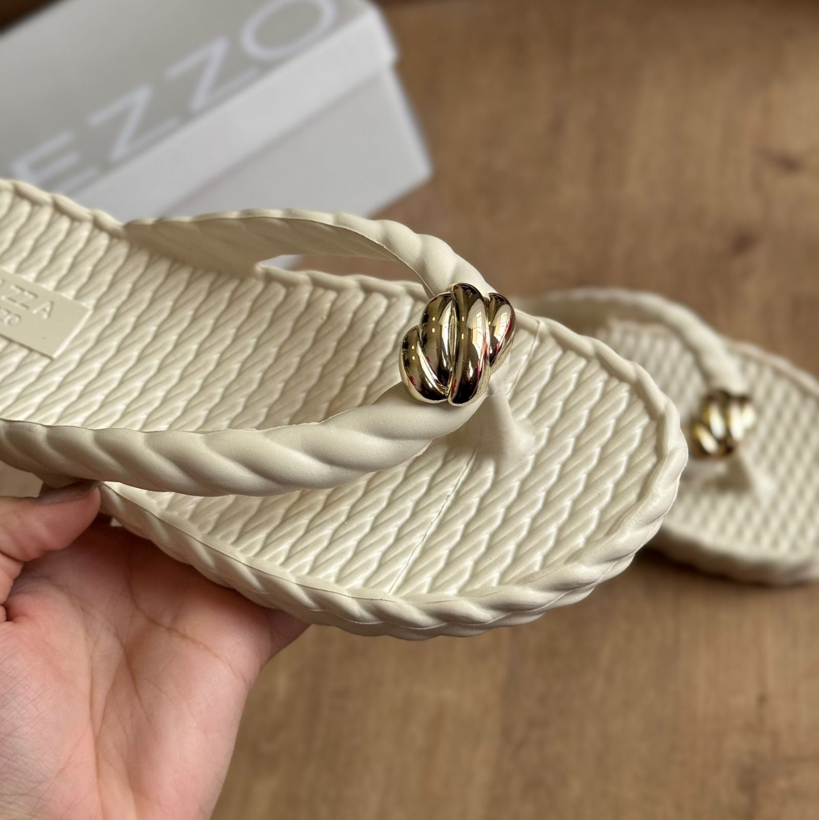 Chinelo de dedo branco em EVA. O sapato tem sola rasteira flat, solado em relevo que imita tiras de cordão torcido e palmilha texturizada com nome da marca. Com formato arredondado na ponta, traz tiras dividindo os dedos e também em forma de cordão torcido, além de metal dourado e texturizado aplicado no centro. Aberto, o chinelo de dedo exibe todo o pé.