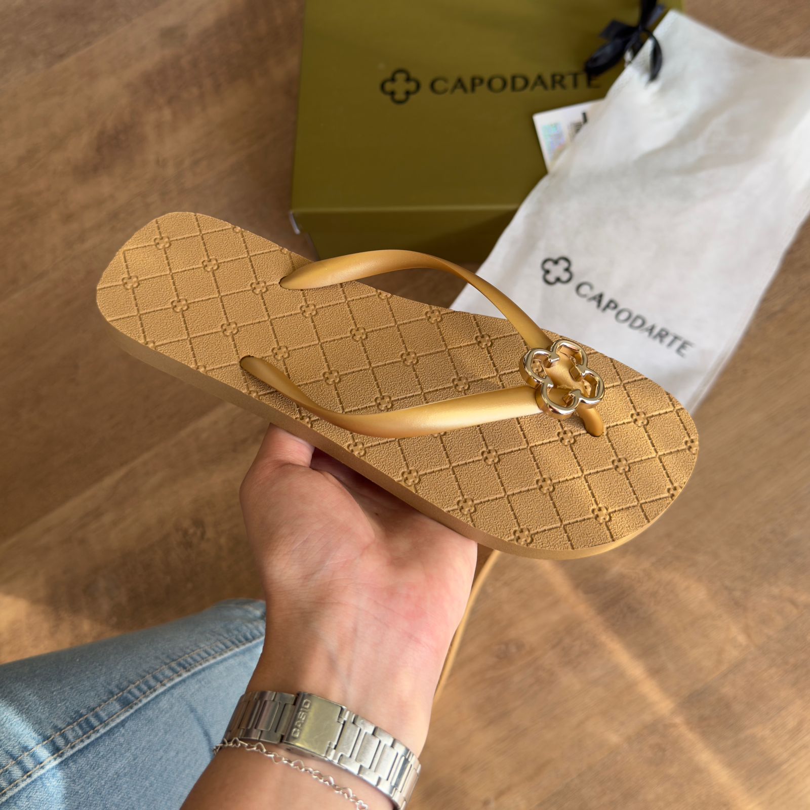 Chinelo de dedo Capodarte Trevo em dourado combina elegância e conforto para o dia a dia. Confeccionado com materiais de qualidade, oferece suporte firme e durabilidade. O design clássico com detalhes em tom dourado agrega sofisticação a qualquer look casual. Ideal para quem busca um calçado versátil que transita entre momentos descontraídos e mais refinados. Perfeito para usar em casa, na rua ou em compromissos informais.