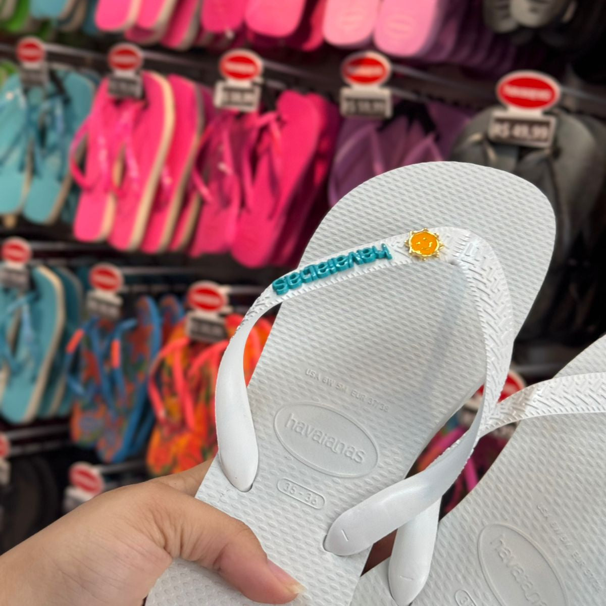 Explore a coleção exclusiva de Havaianas Top com personalizações únicas que refletem sua personalidade. Este modelo apresenta um charmoso detalhe em pingentes coloridos e letras, trazendo um toque especial às tradicionais sandálias. Perfeitas para qualquer ocasião, as Havaianas Top garantem conforto e estilo, seja para um dia na praia ou um passeio casual. Escolha a sua e dê um toque de originalidade ao seu look!