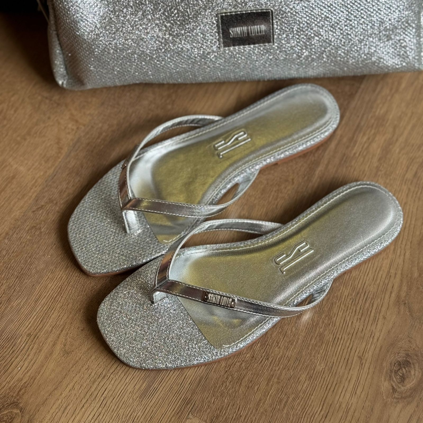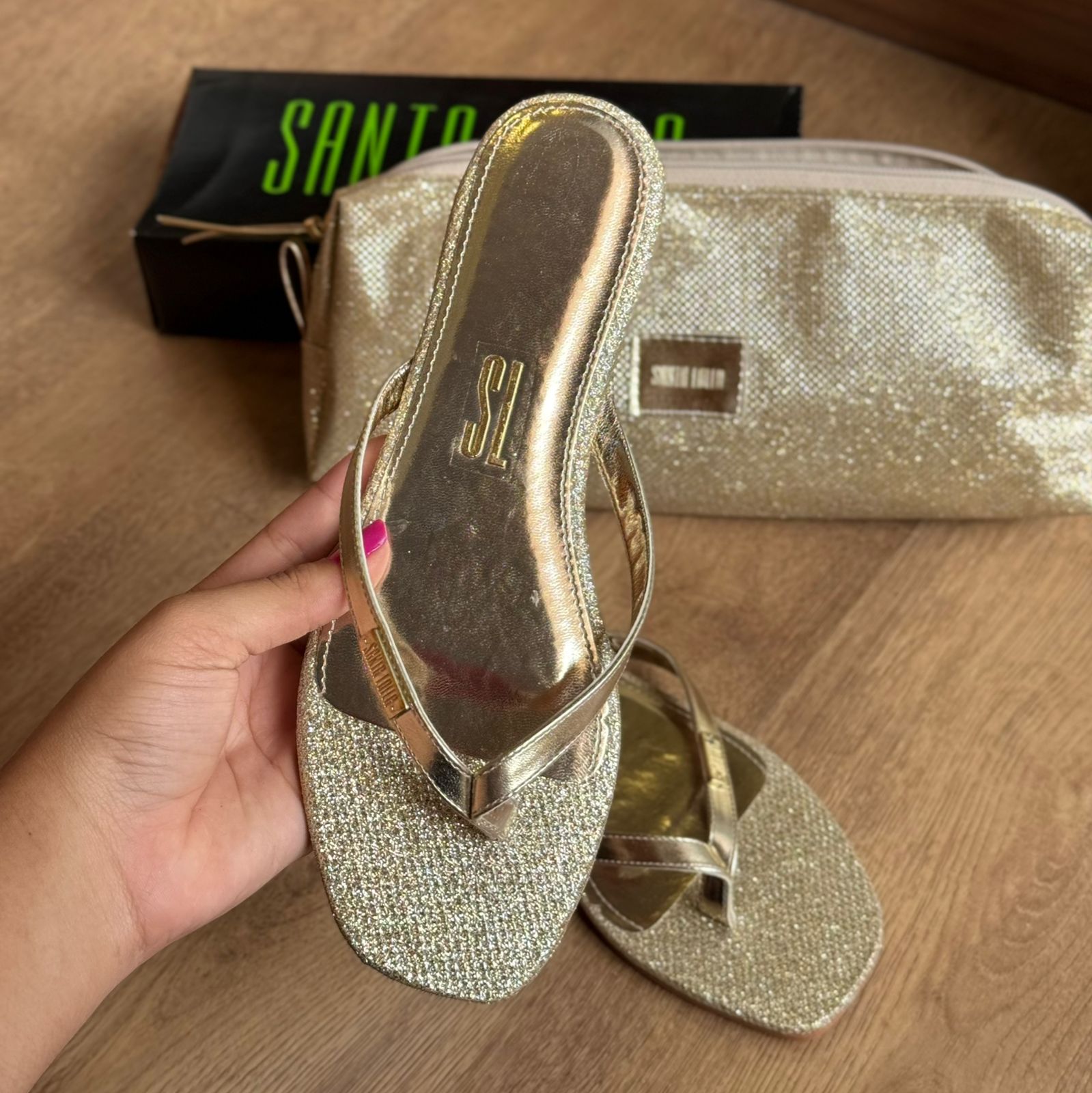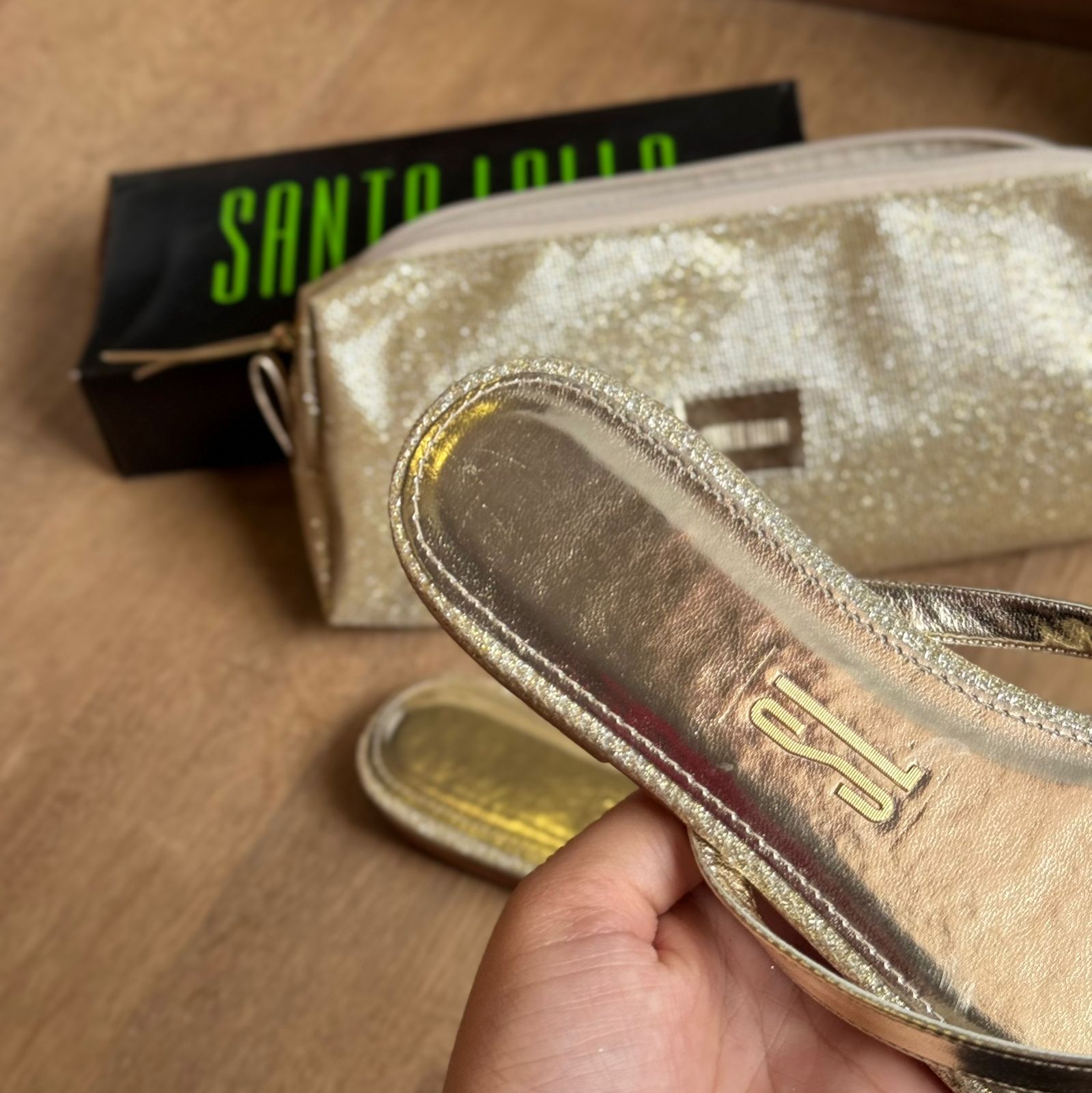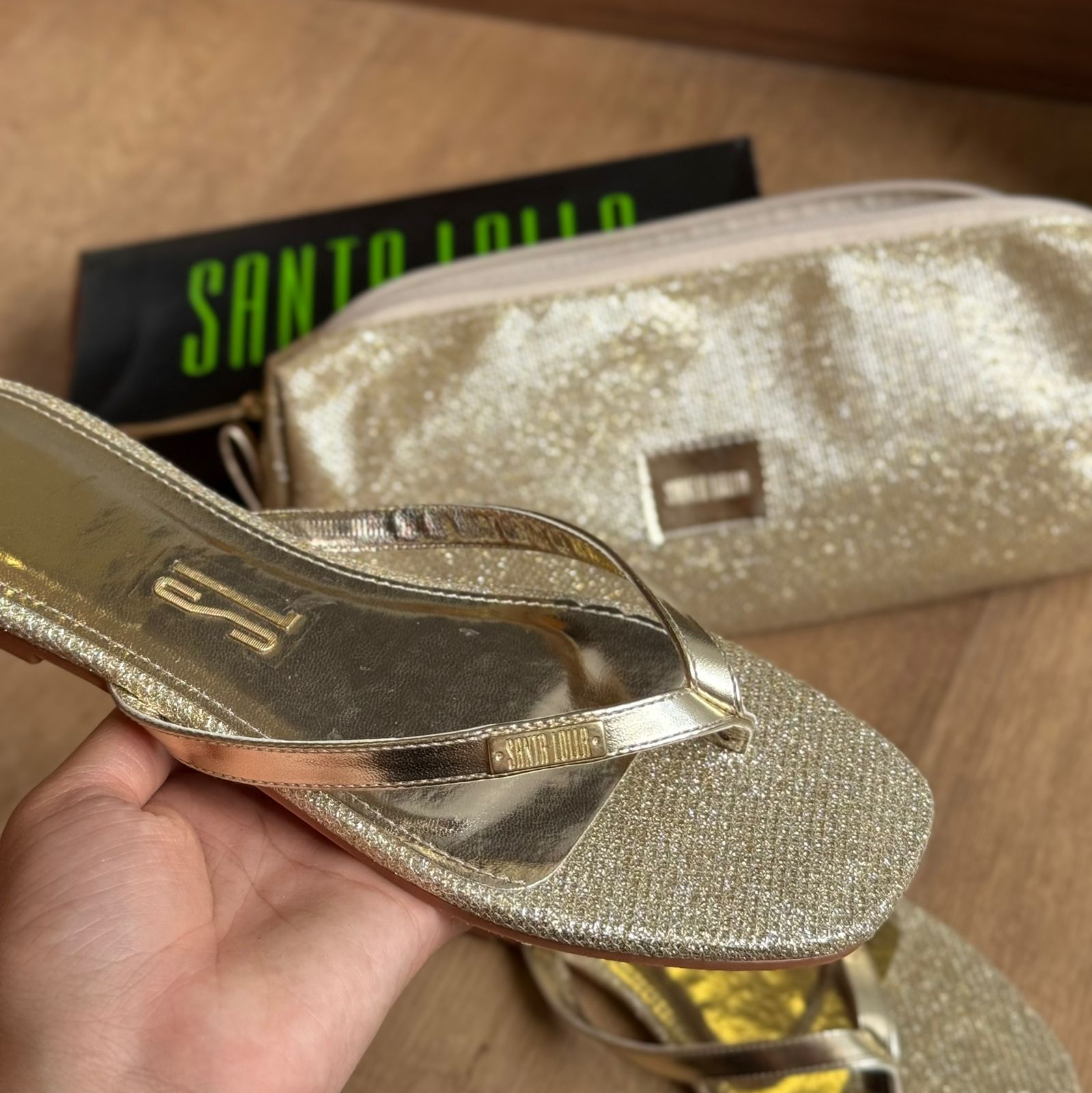 Kit rasteira e necessaire, ambos confeccionados em material metalizado com acabamento em brilho para um visual glamouroso. A rasteira possui bico quadrado e salto flat, proporcionando conforto e estilo, ideal para composições casuais e elegantes. A necessaire é compacta e prática, com fechamento em zíper e acabamento brilhante, perfeito para organizar pequenos itens.