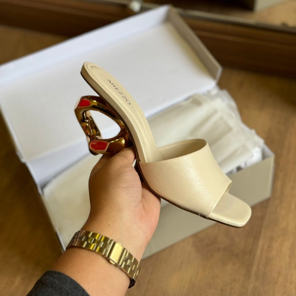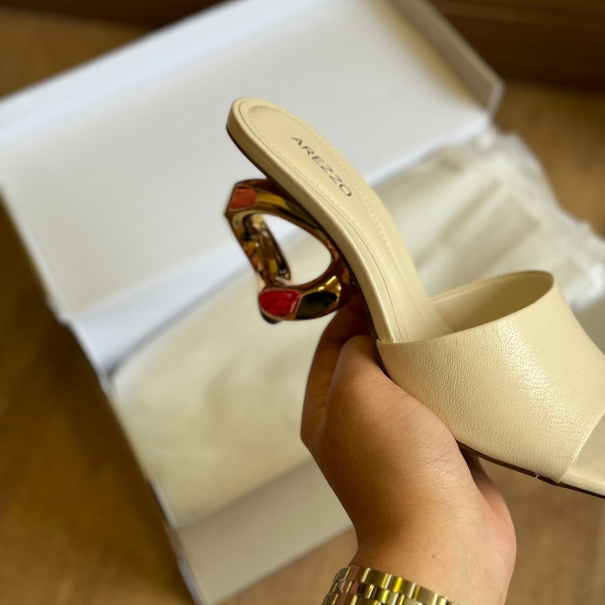 Descrição: O modelo tem salto médio geométrico dourado, em forma de elos torcidos, e bico quadrado. Traz tira larga e única sobre os dedos. Aberta, com palmilha da cor do modelo e gravação do nome da marca. A sandália exibe todo o pé.