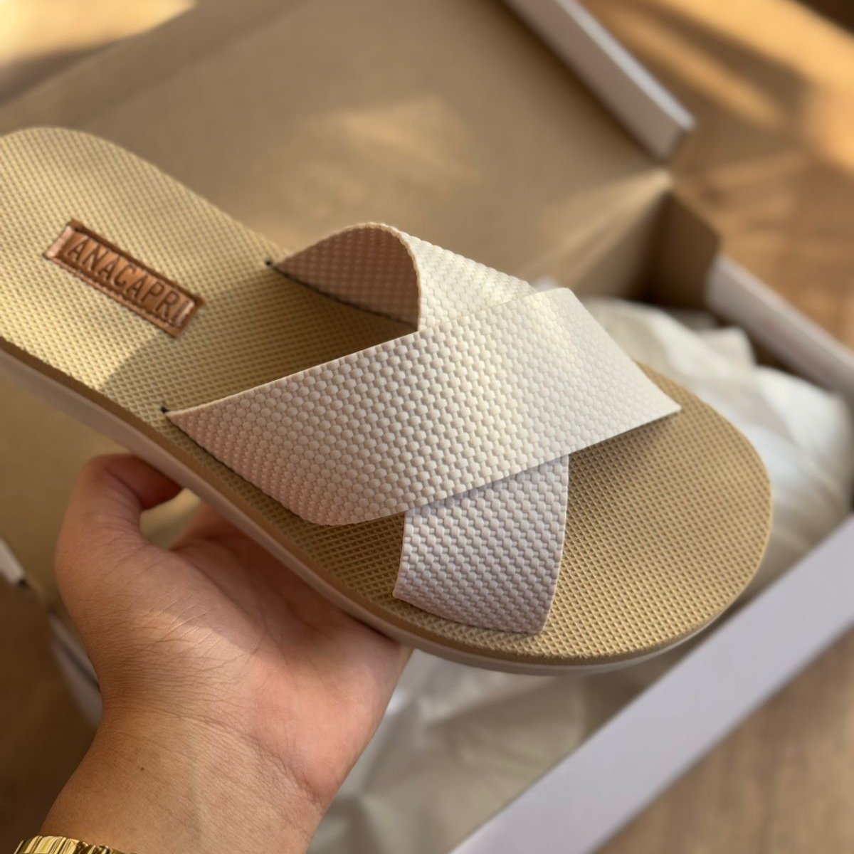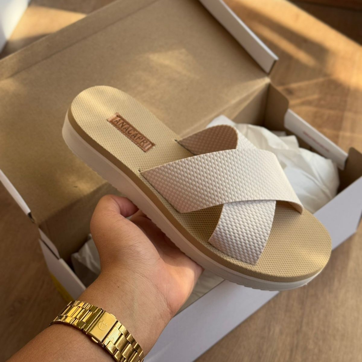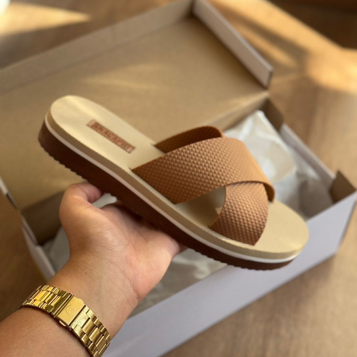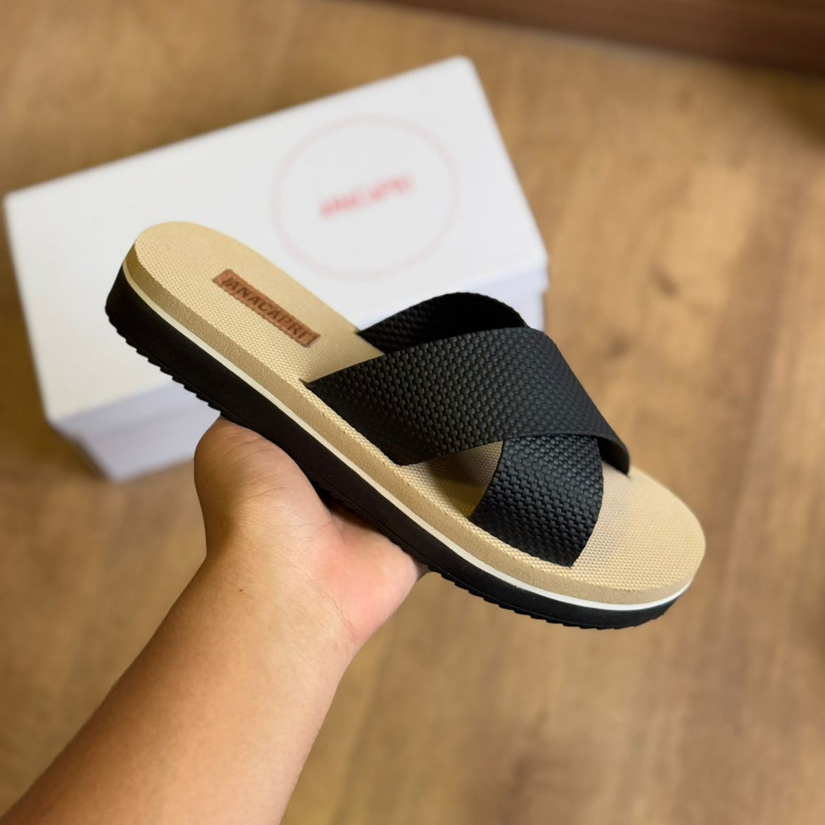 Possui duas tiras largas cruzadas na gáspea. Solado da mesma cor e palmilha nude com o nome da marca. Deixa dedos e calcanhar à mostra.