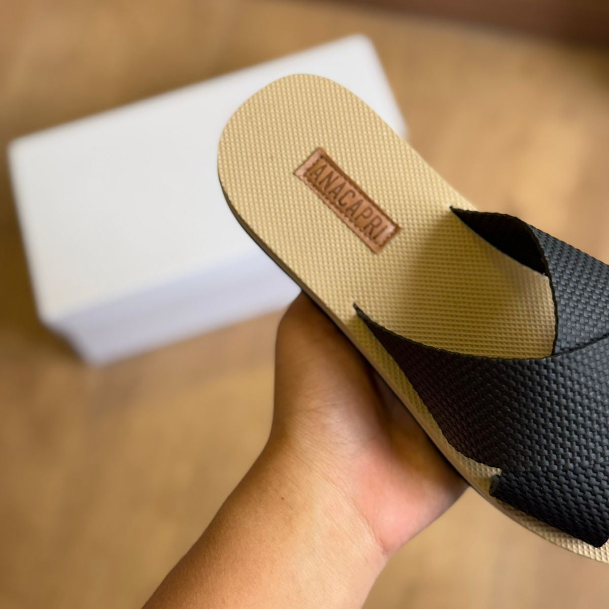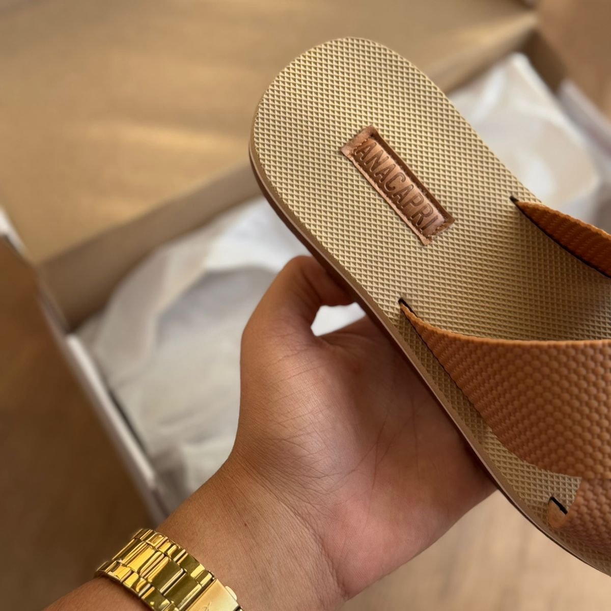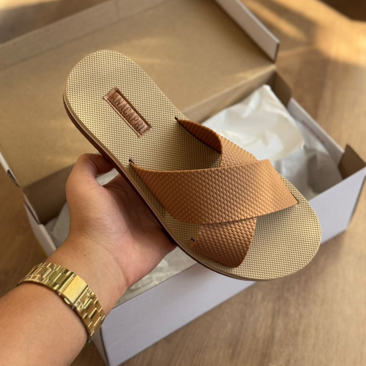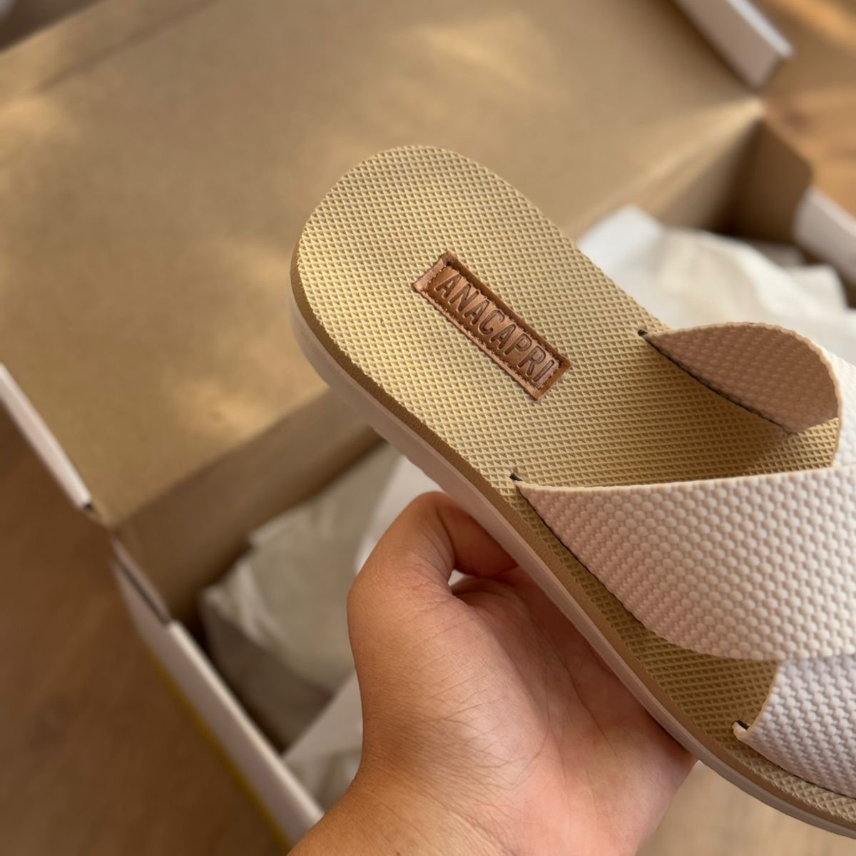 Possui duas tiras largas cruzadas na gáspea. Solado da mesma cor e palmilha nude com o nome da marca. Deixa dedos e calcanhar à mostra.