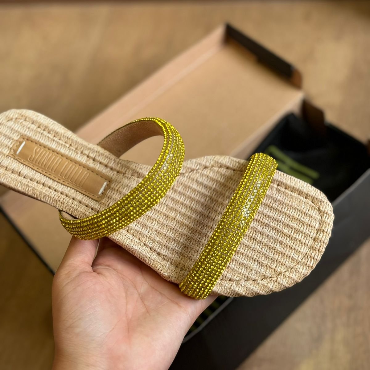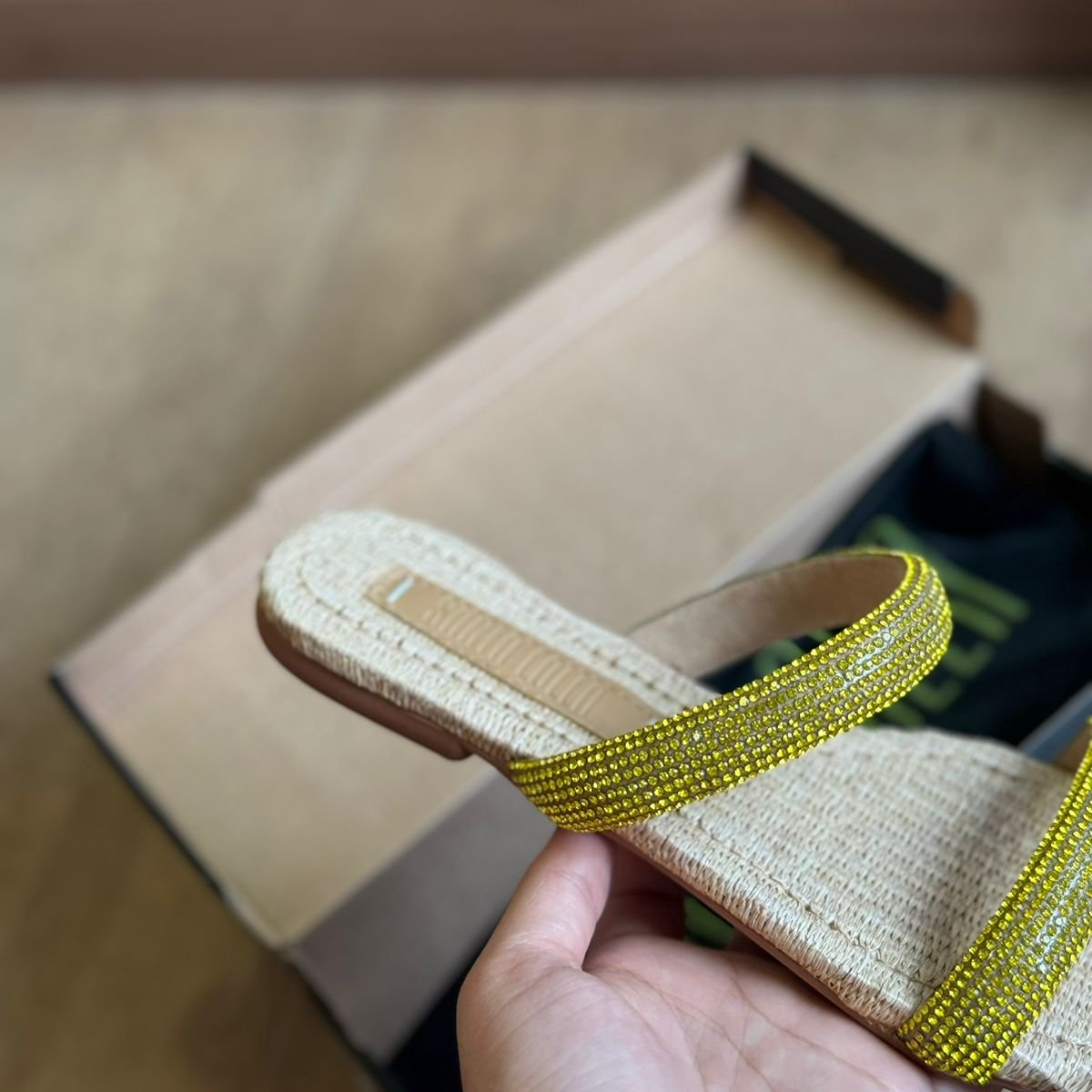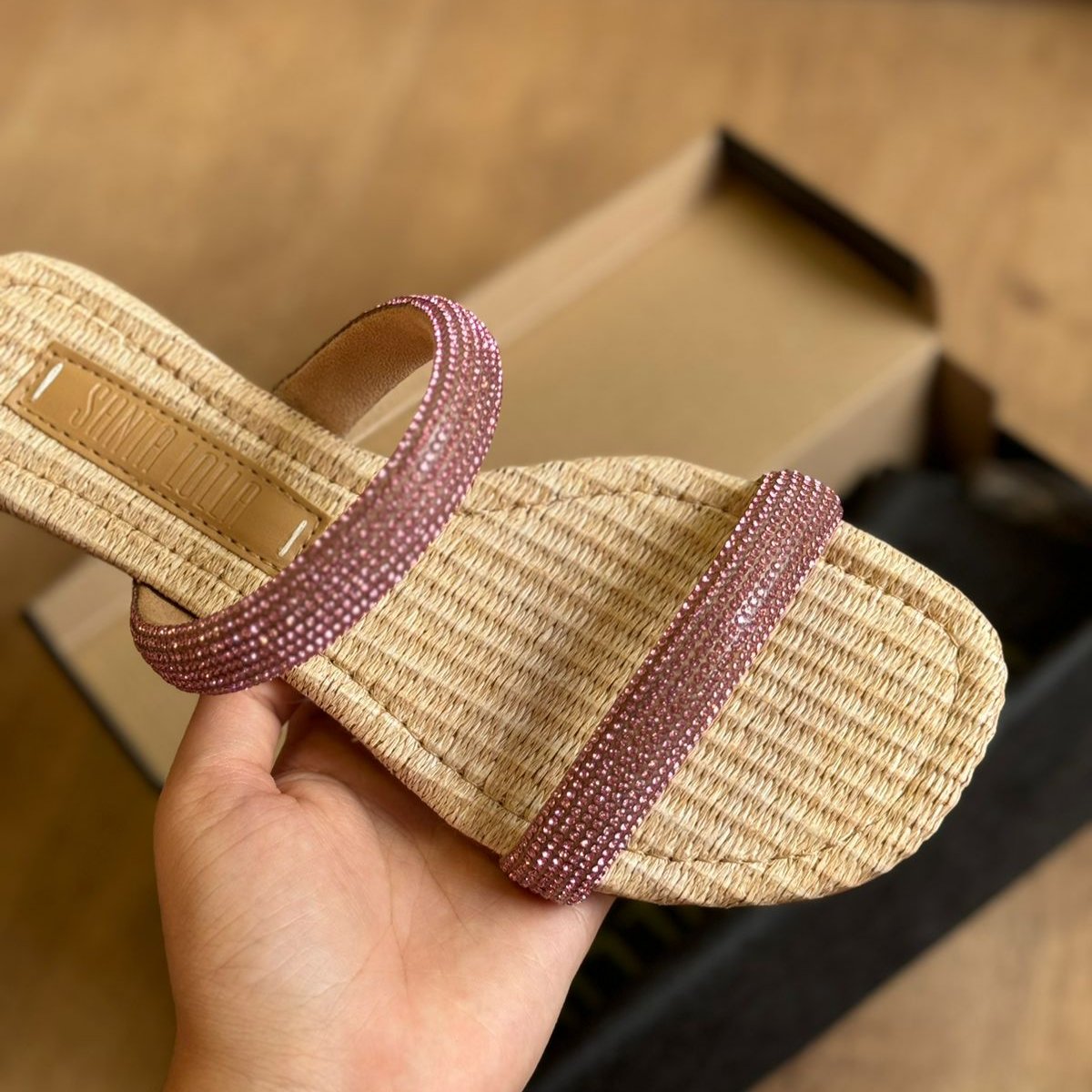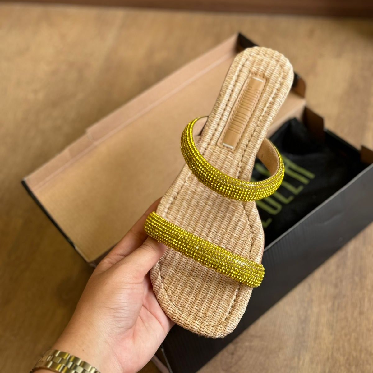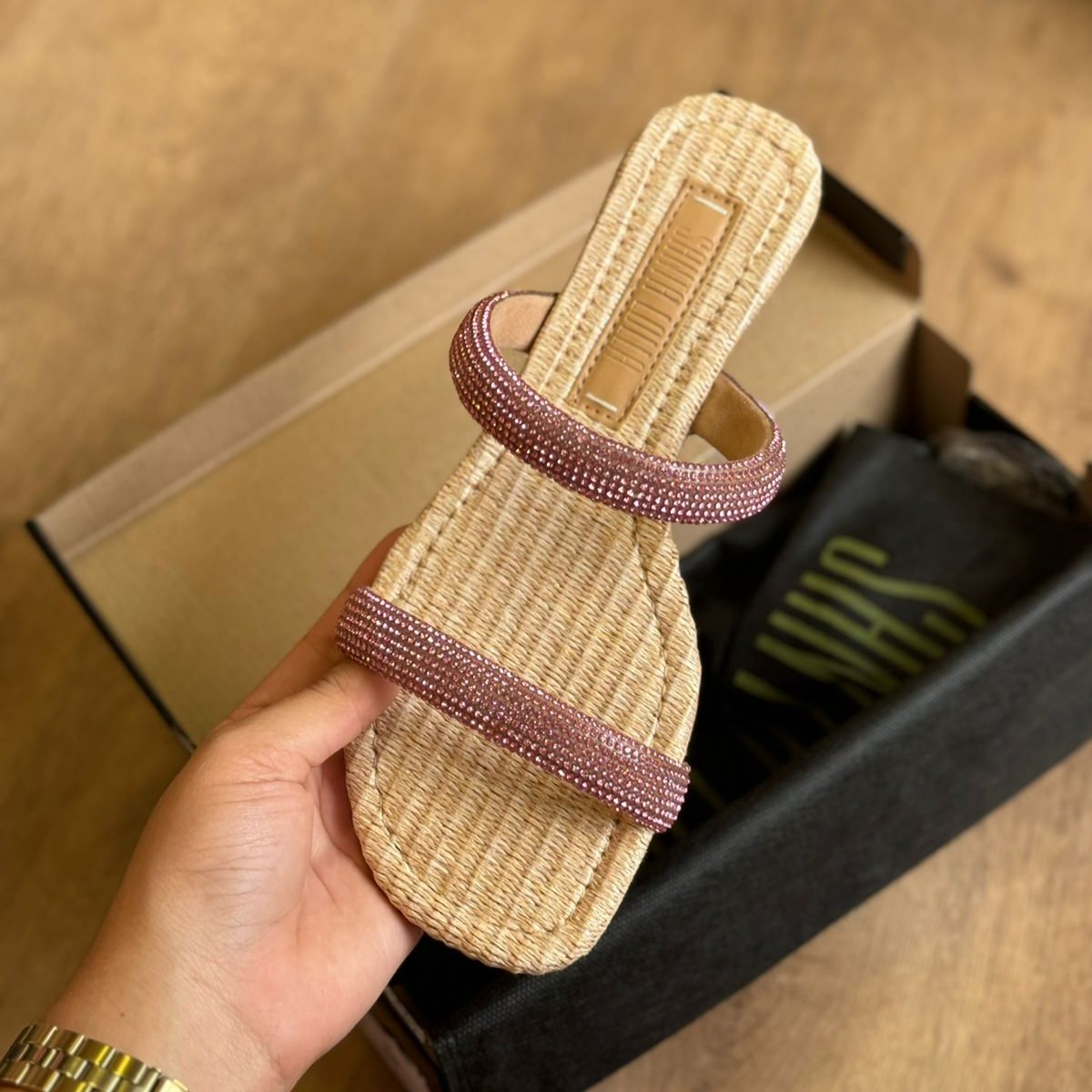 A rasteira possui duas tiras elegantes com aplicação de strass, que acrescentam um brilho sutil ao design. A base é confeccionada em palha trançada, conferindo um toque rústico e leveza ao calçado. Ideal para compor looks frescos e elegantes em dias quentes.