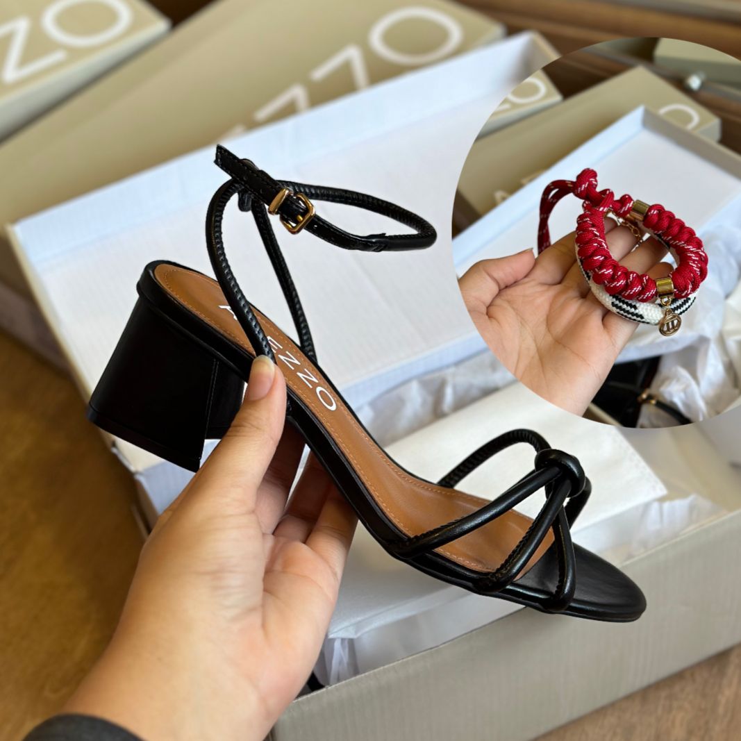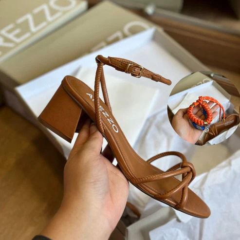 O sapato tem salto médio bloco quadrado e formato arredondado na ponta. Traz três tiras finas sobre os dedos, unidas por enlace central. Possui tira fina que sai das laterais, se cruza no calcanhar, contorna o tornozelo e fecha em fivela lateral. Com palmilha bege e inscrição do nome da marca. Acompanha um conjunto com duas tornozeleiras em cordão colorido, uma delas trançada e com pingente metálico e a outra lisa.