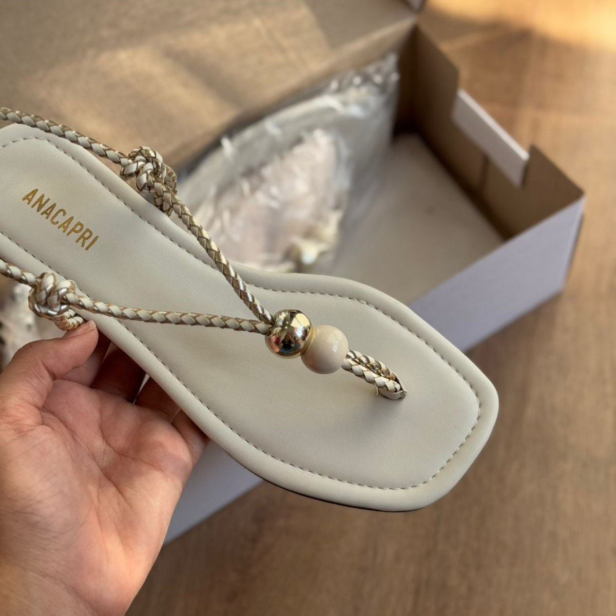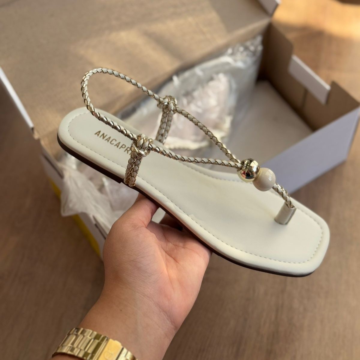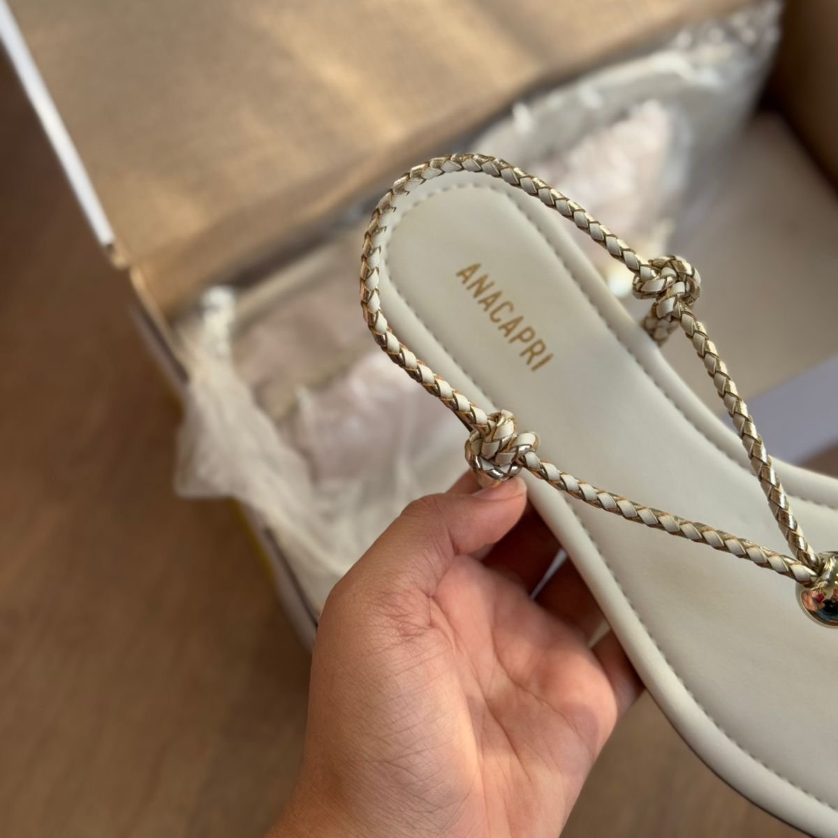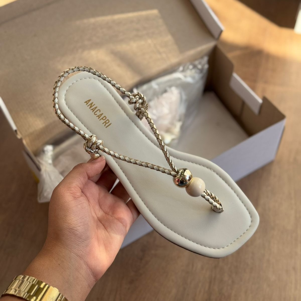 Sandália rasteira de tira trançada, com aplicação de pérolas. O modelo possui solado rasteiro emborrachado com leve saltinho traseiro e biqueira quadrada. Traz cabedal com tira central dupla e efeito trançado, com aplicação de duas pérolas redondas, no mesmo tom da peça. Essa mesma tira passa entre os dedos e segue pelas laterais, contornando o calcanhar - arrematada em nozinhos pelas laterais. Possui palmilha comfy contornada em pespontos delicados e assinatura Anacapri.