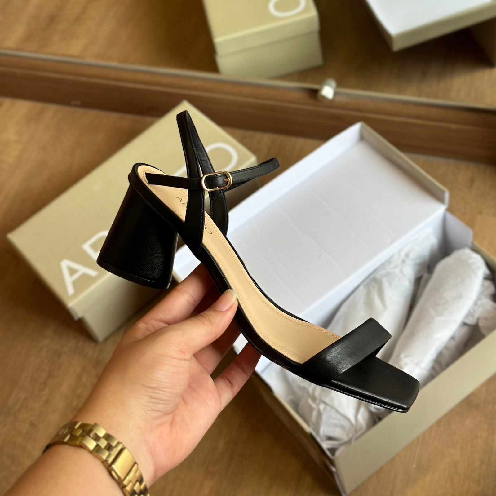 Descrição: O modelo tem salto médio bloco arredondado e bico quadrado. Traz tira média sobre os dedos e duas tiras finas afiveladas em torno do calcanhar e tornozelo. A sandália é aberta e exibe todo o pé.