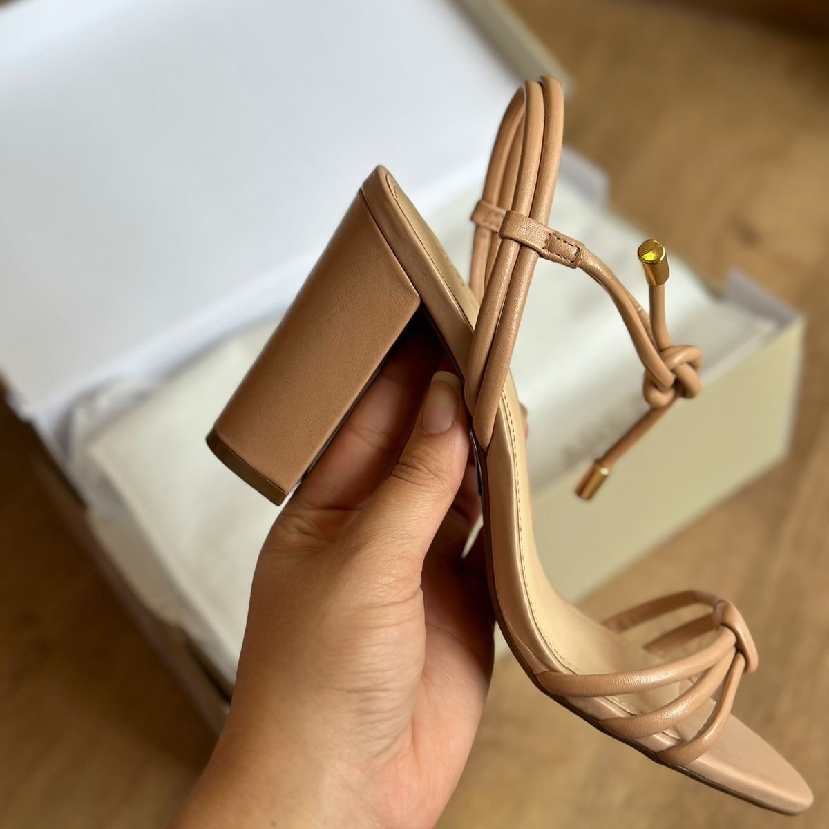 Descrição: O modelo tem salto alto bloco e bico redondo. Traz três tiras finas e bombadas sobre os dedos, unidas por enlace central. Possui tira fina em torno do calcanhar e mais duas tiras bombadas no tornozelo com ponteiras metálicas e fecho em nó frontal. Com palmilha da cor do modelo e inscrição do nome da marca. A sandália exibe todo o pé.