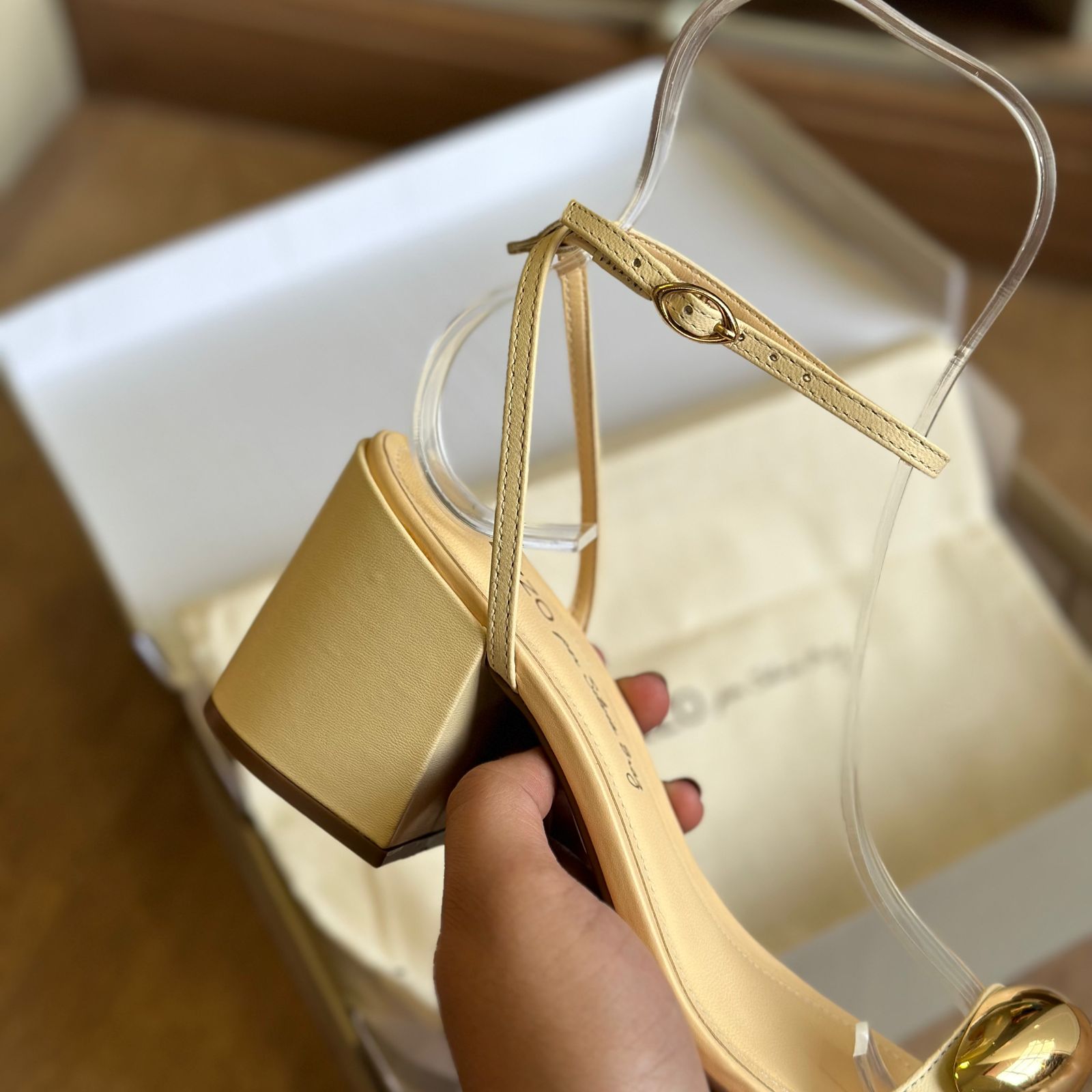 Descrição: O sapato tem salto médio bloco e formato arredondado na ponta. Traz tira sobre os dedos com aplicação de metal dourado, espesso e orgânico. Possui tira fina que sai das laterais, se cruza no calcanhar, contorna o tornozelo e fecha em fivela lateral. Com palmilha da cor da sandália e inscrição do nome da marca. A sandália exibe todo o pé.