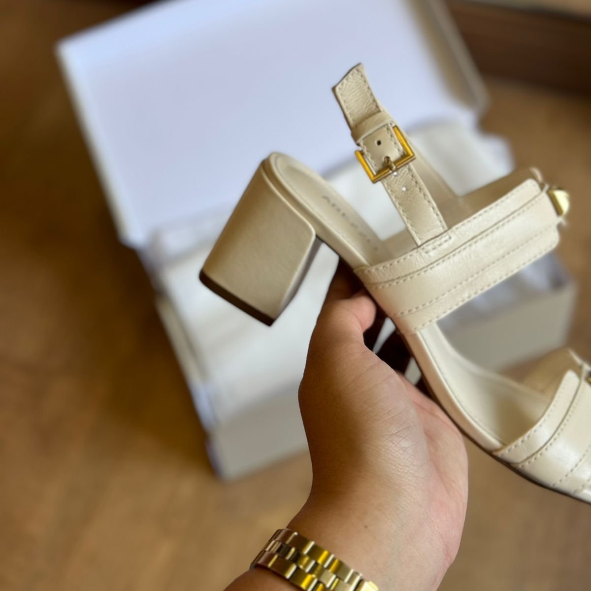 Descrição: O sapato tem salto médio bloco e formato quadrado na ponta. Traz tiras médias sobre os dedos e na parte superior do pé recortadas, conectadas por tira fina e com aplicação de tacha no centro. Possui ainda tira no calcanhar que fecha em fivela lateral. Com palmilha da cor da sandália e inscrição do nome da marca.
