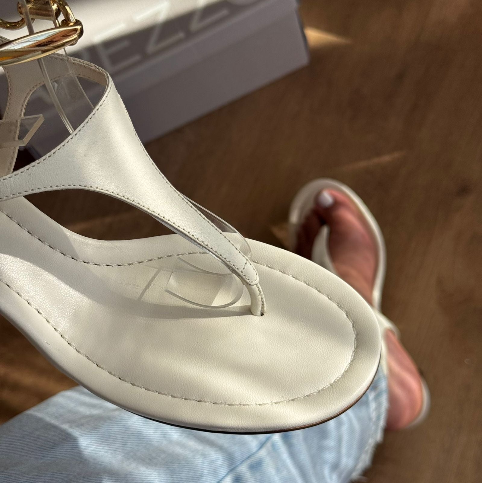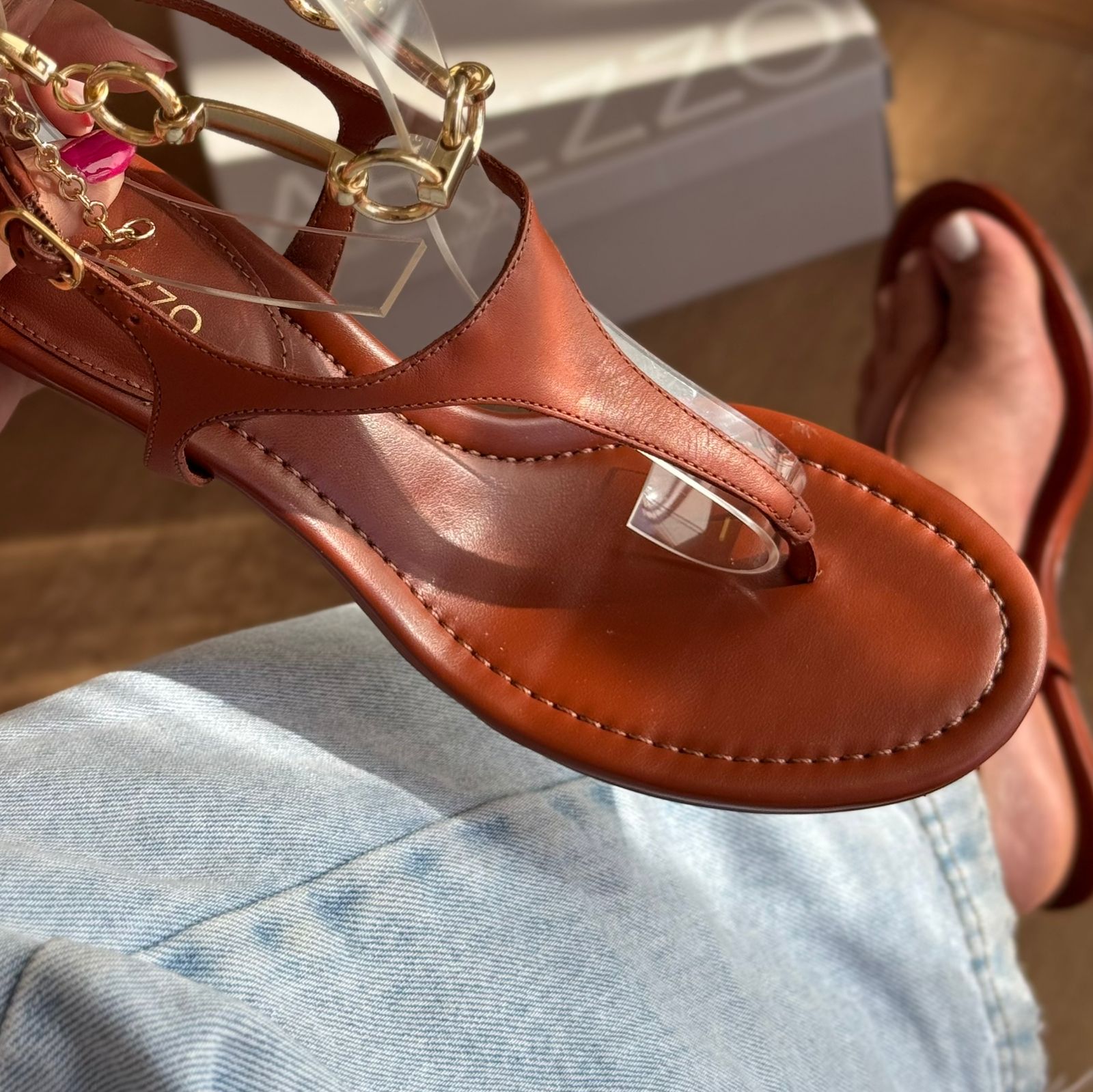Sandália feminina dourada de couro. O sapato tem salto baixo fino e formato arredondado na ponta. Traz tira fina dividindo os dedos e tira afivelada em torno do tornozelo. Com palmilha da cor da sandália e inscrição do nome da marca. Acompanha tira tornozeleira em metal dourado com elos, presa na parte de trás.