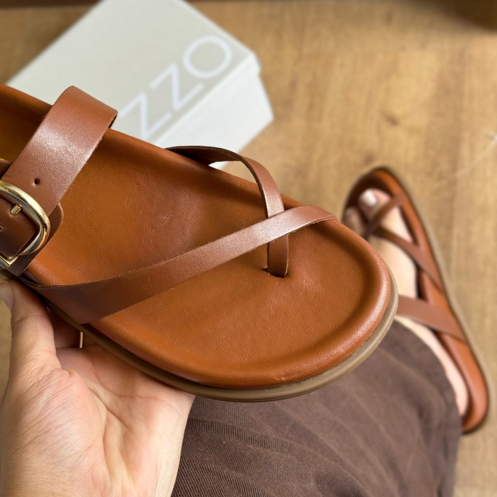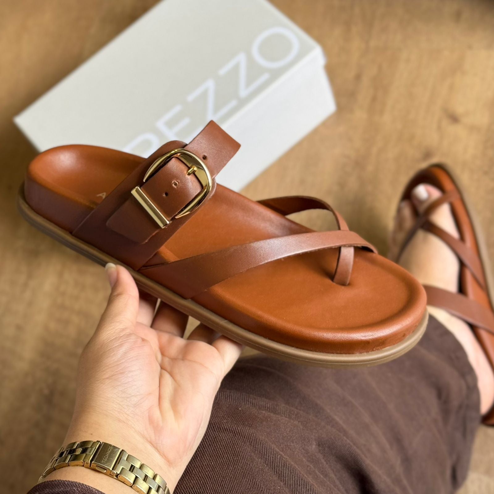 Sandália papete em couro. O sapato tem palmilha com formato anatômico e inscrição do nome da marca. Possui solado flatform, base emborrachada e formato arredondado na ponta. Traz duas tiras finas cruzadas e dividindo os dedos, além de tira larga na parte superior do pé com fivela metálica lateral ajustável. Aberta, a sandália exibe todo o pé.