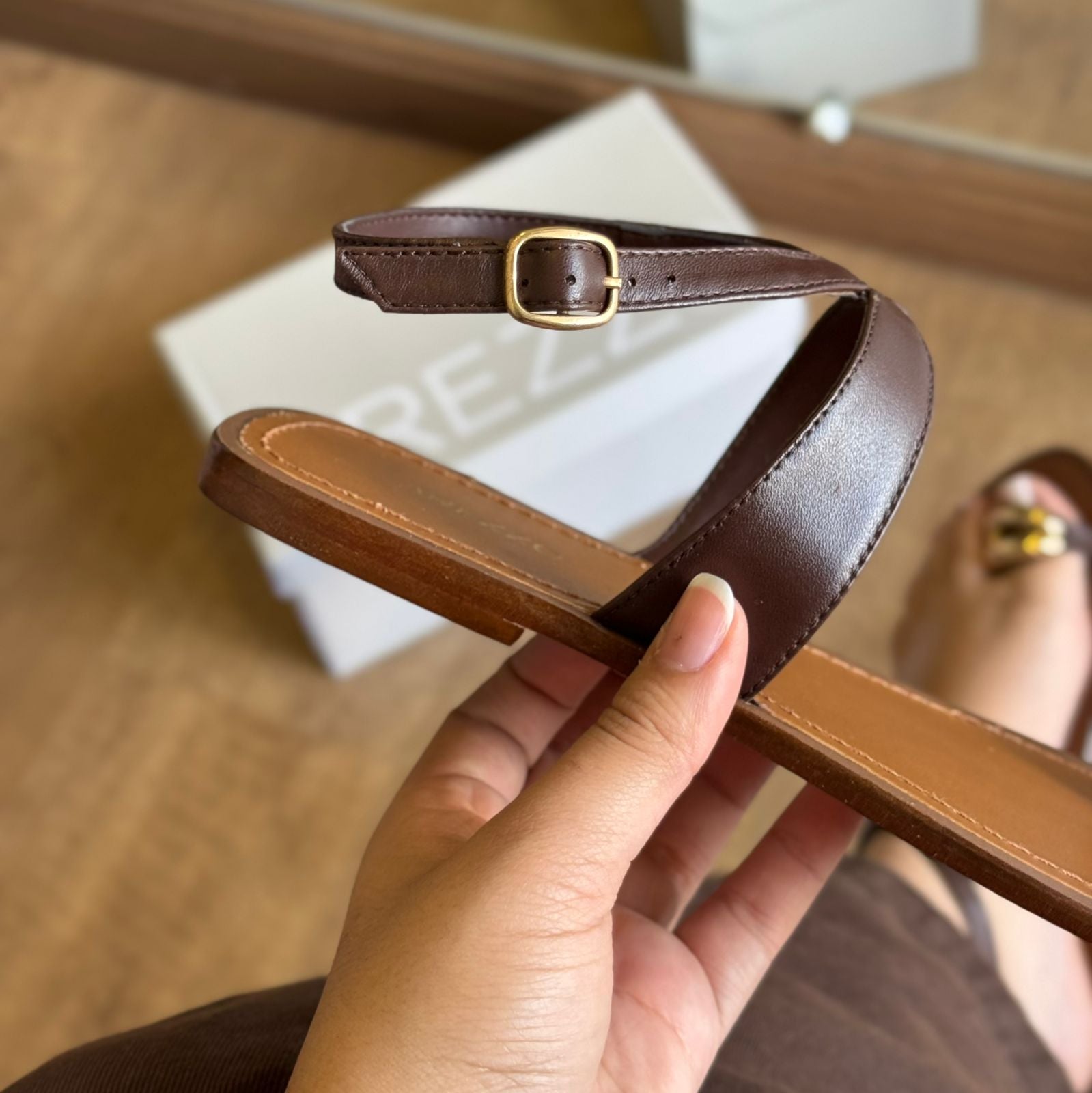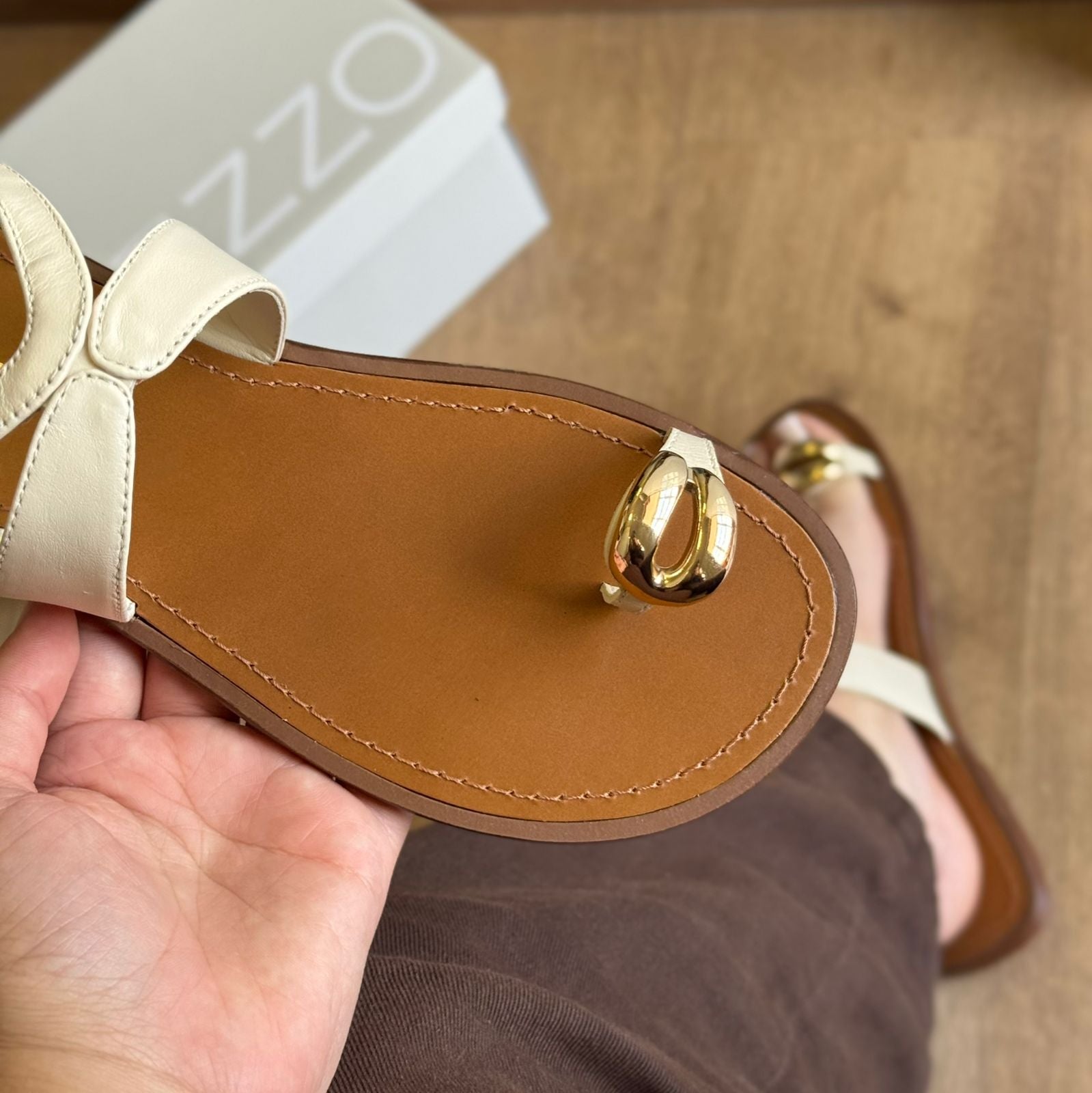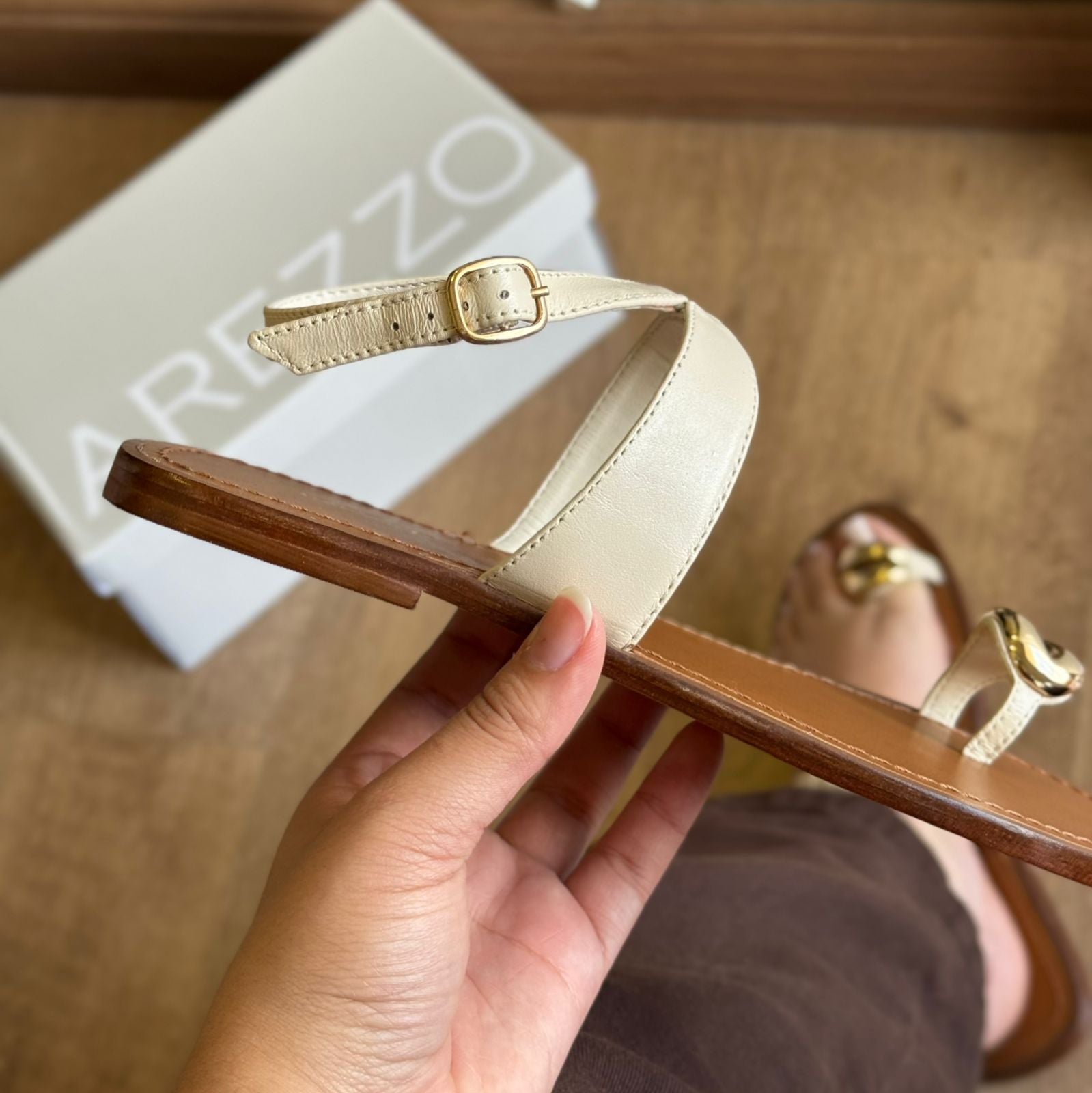 Sandália feminina de couro. O sapato tem salto rasteiro e formato arredondado na ponta. Traz tira fina que divide os dedos, estilo dedeira, com aplicação de metal dourado, espesso, vazado e orgânico. Possui tira fina na parte superior do pé, recortada e conectada a tira fina em torno do tornozelo, com fecho em fivela metálica lateral. Com palmilha de recouro, contorno em pesponto e nome da marca.