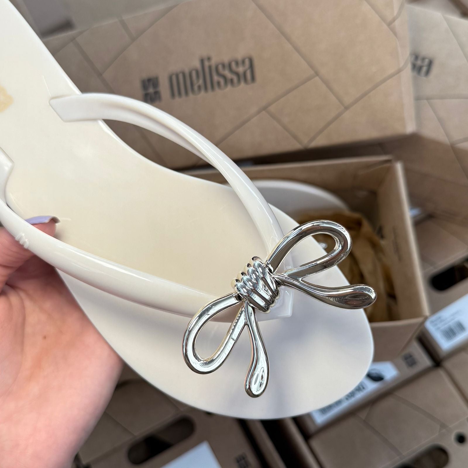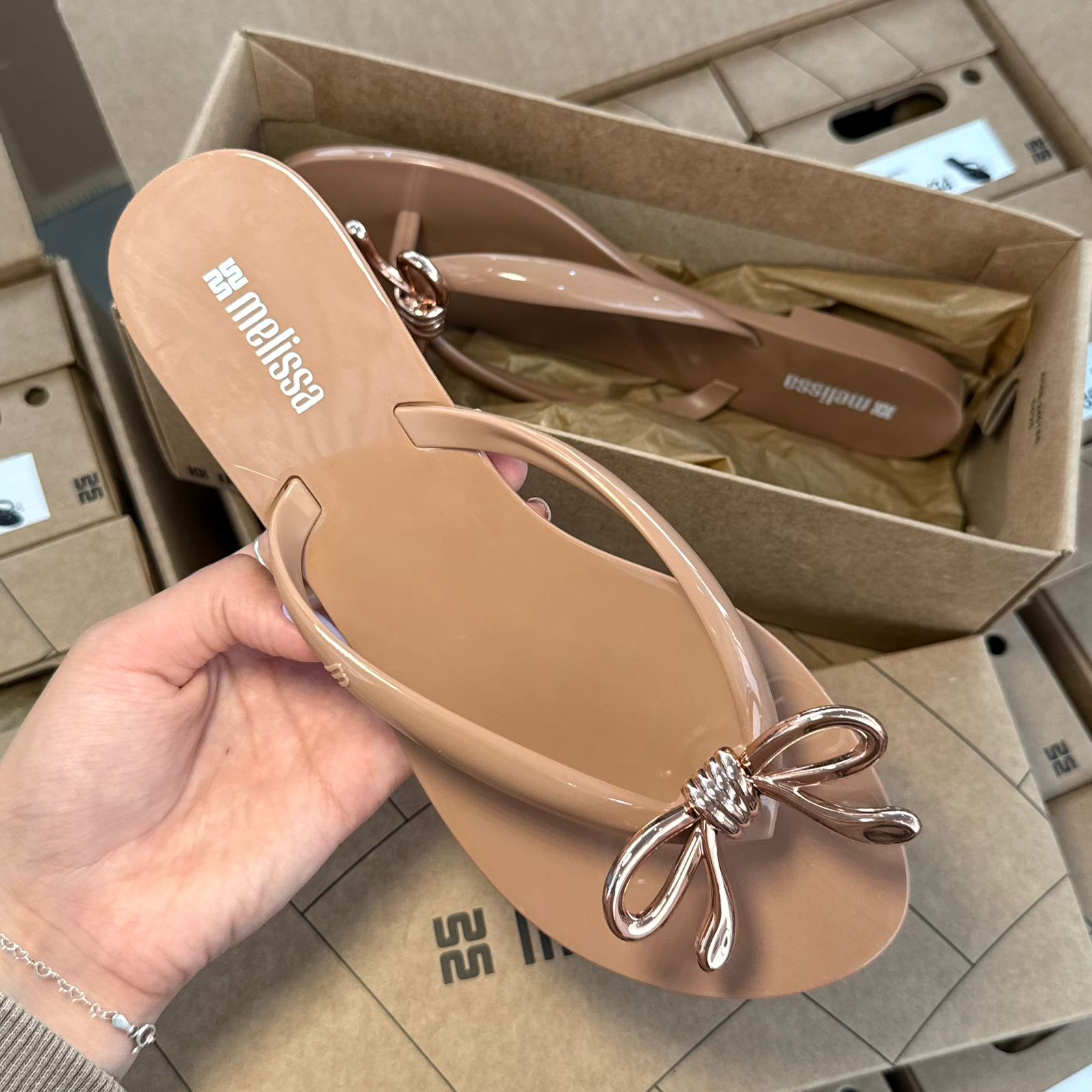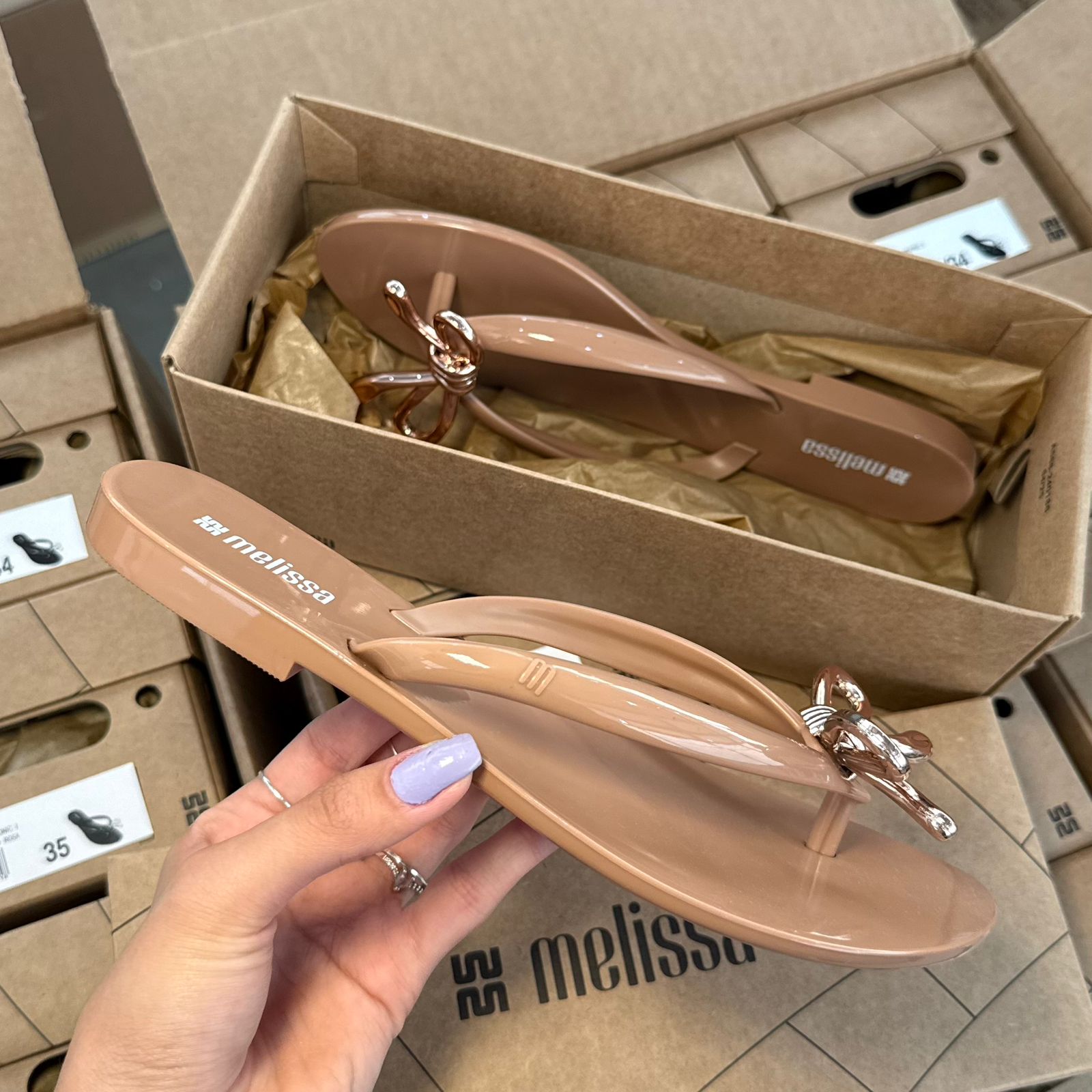 Conforto e estilo se encontram na Melissa Harmonic Iris, um chinelo feminino feito em Melflex®, material flexível que envolve os pés com maciez e resistência. Seu design moderno ganha destaque com um delicado laço metálicos no cabedal, trazendo um toque sofisticado para o visual casual.