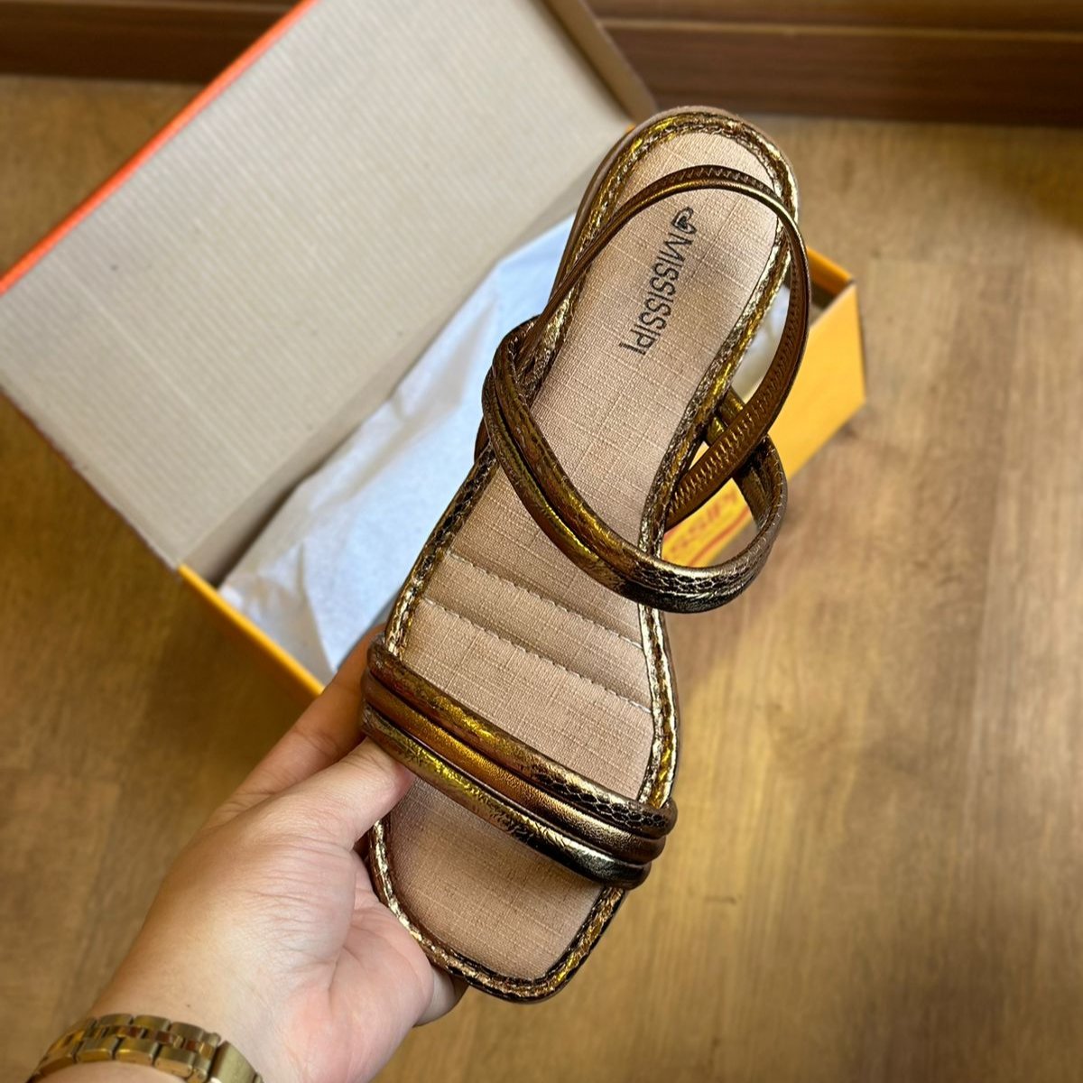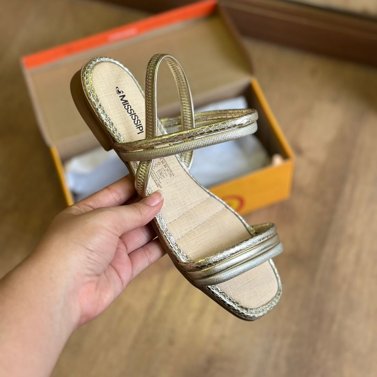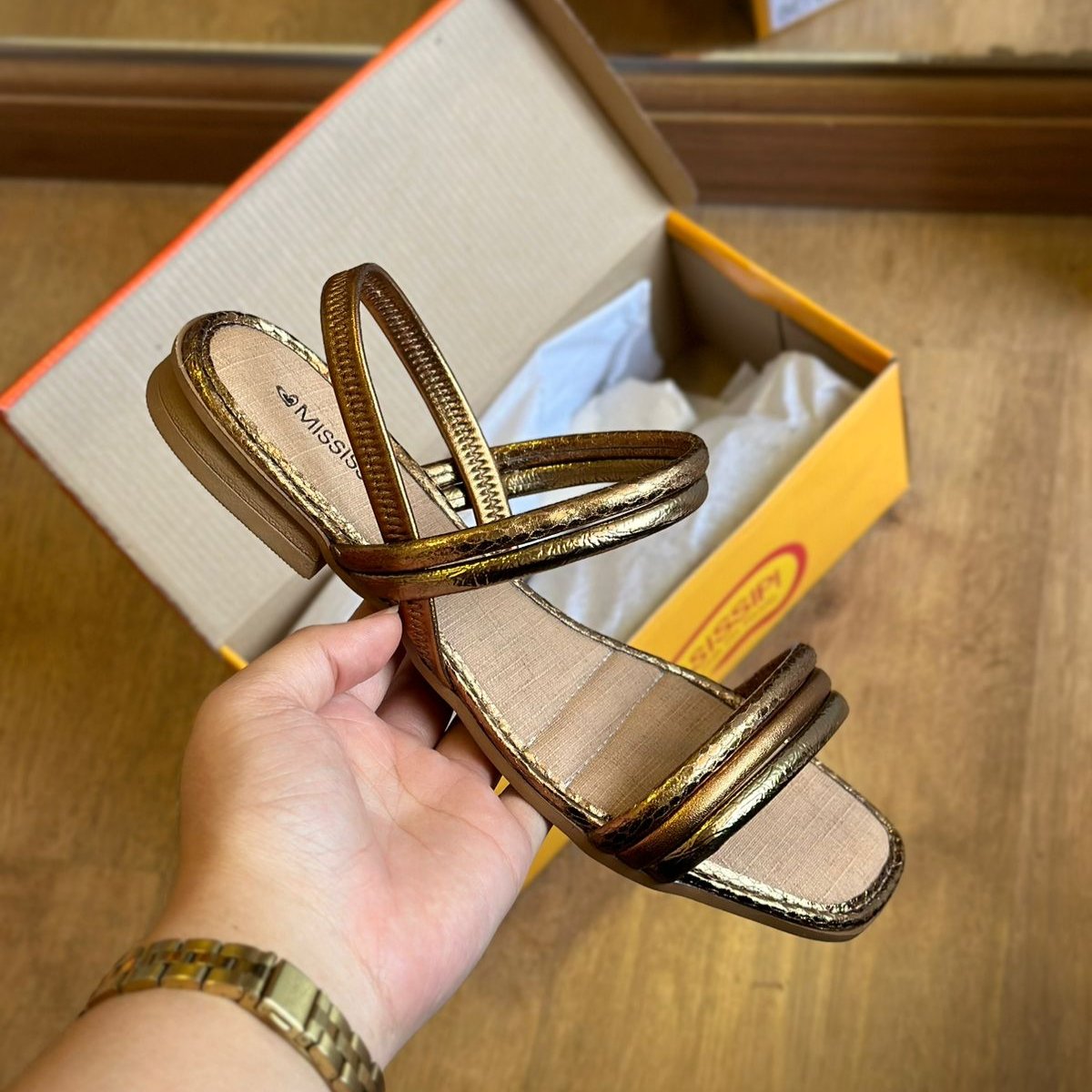 Parabéns! Seu look vai brilhar com a Sandália Mississipi Rasteira Metalizada MC322. Com detalhes metalizados, ela traz um toque de elegância e diversão para seus pés. Ande com estilo e conforto com essa sandália que vai fazer sucesso por onde passar.