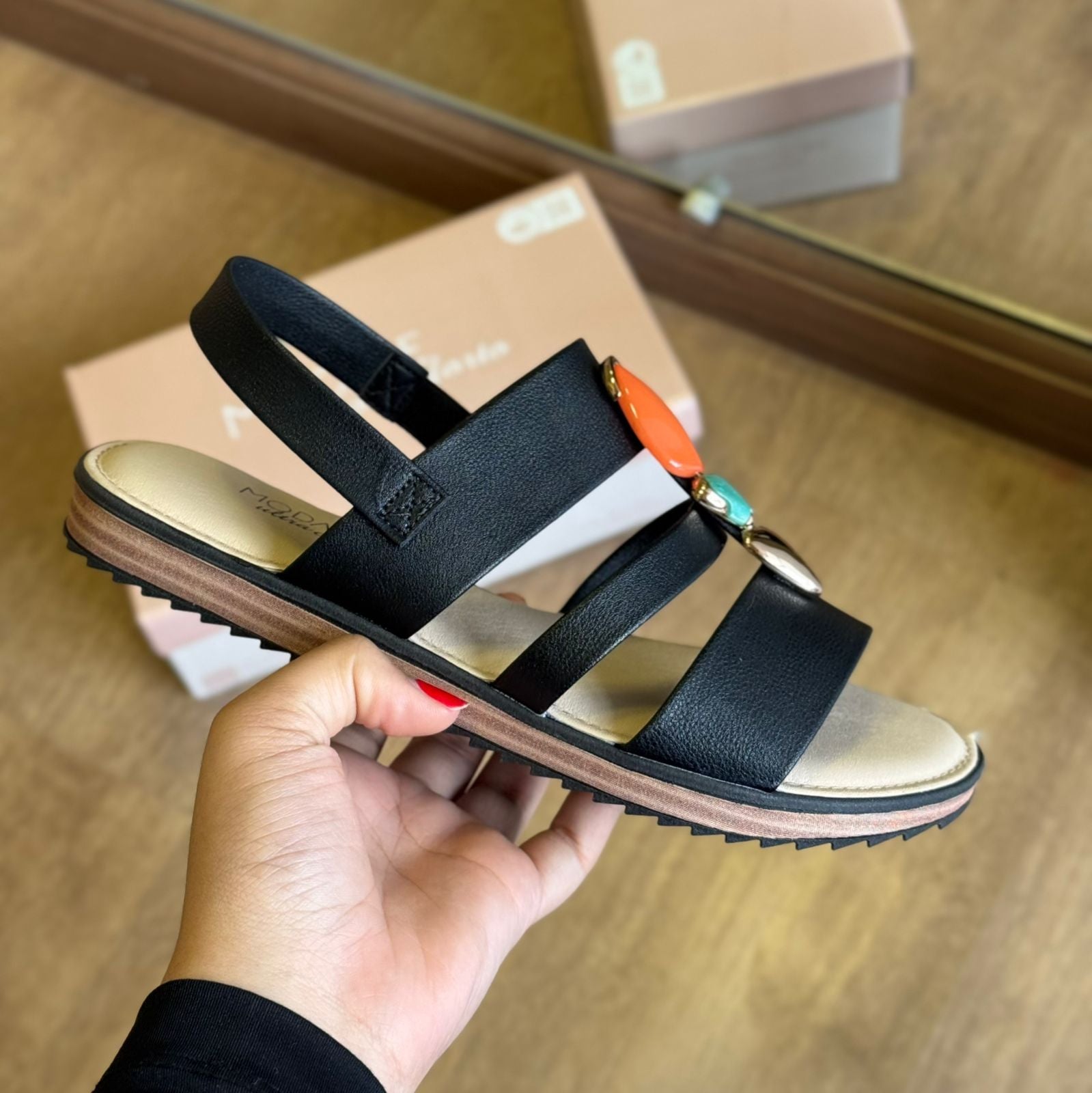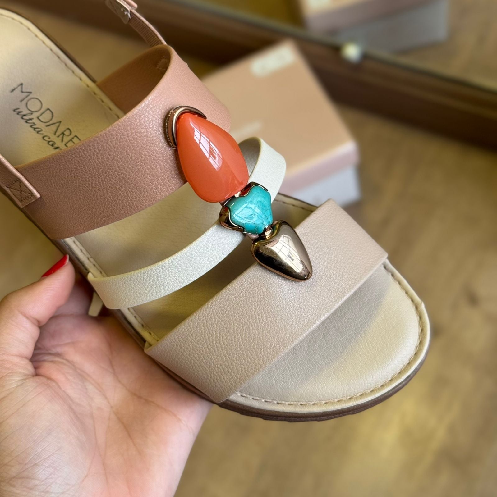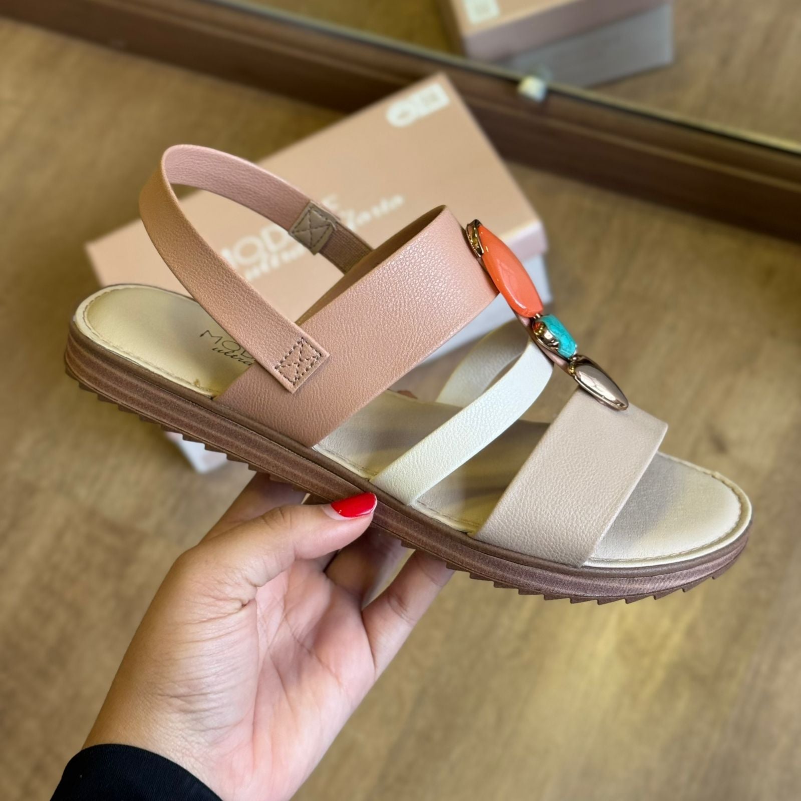Elegante e confortável, esta sandália é ideal para quem busca praticidade e estilo no dia a dia. O modelo conta com detalhes delicados em pedrarias no cabedal, que adicionam um toque de brilho e sofisticação ao visual.
