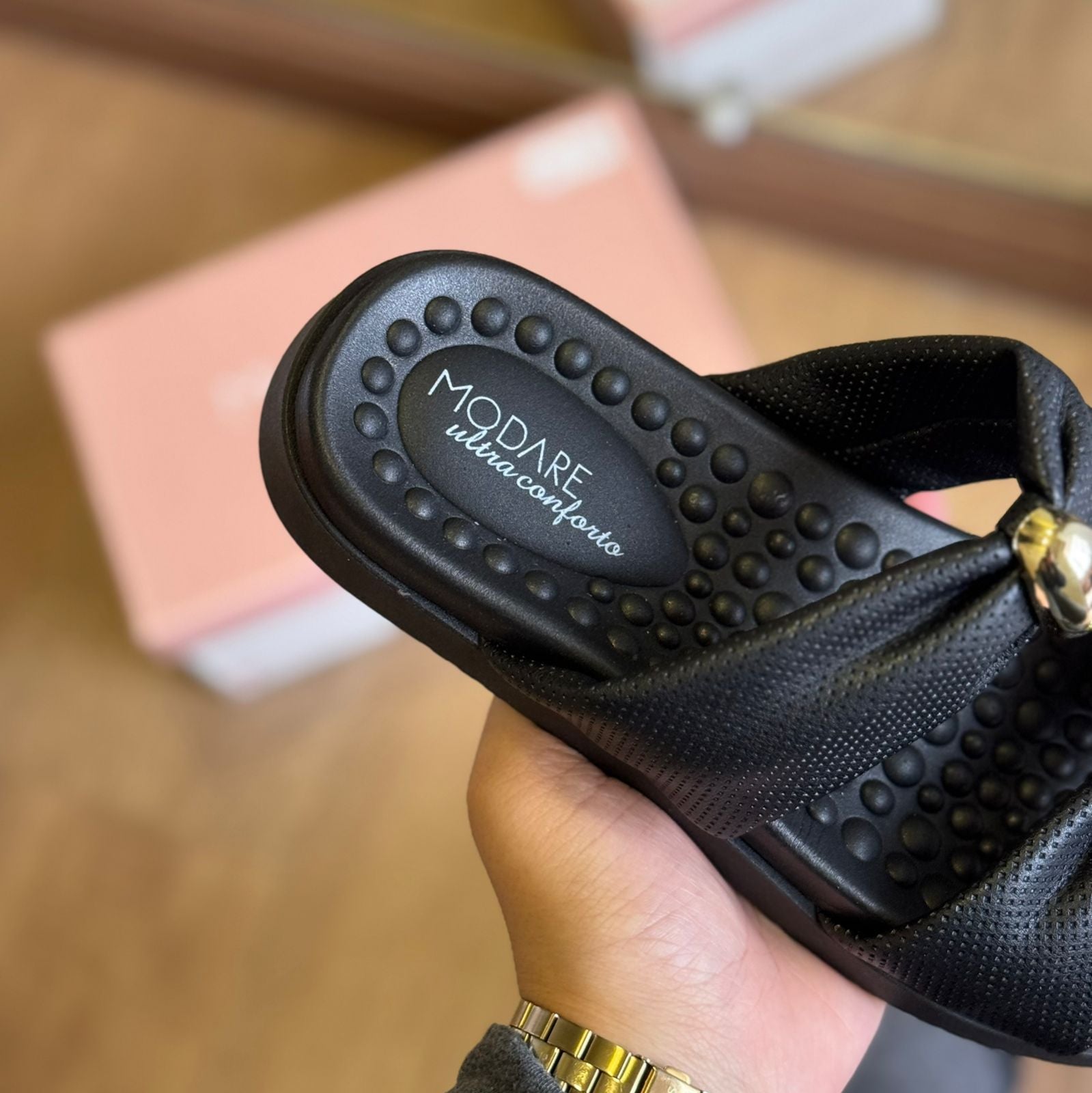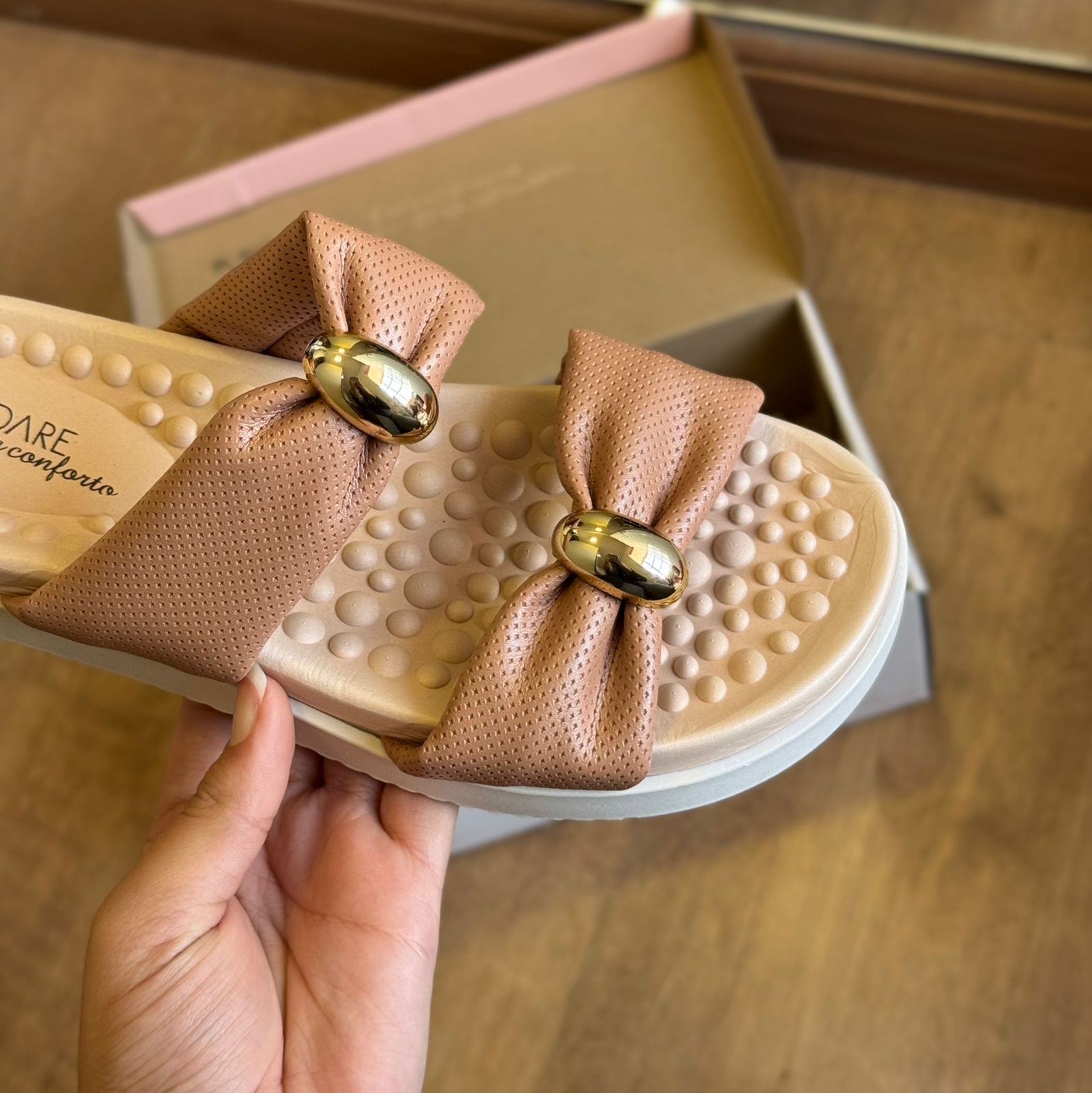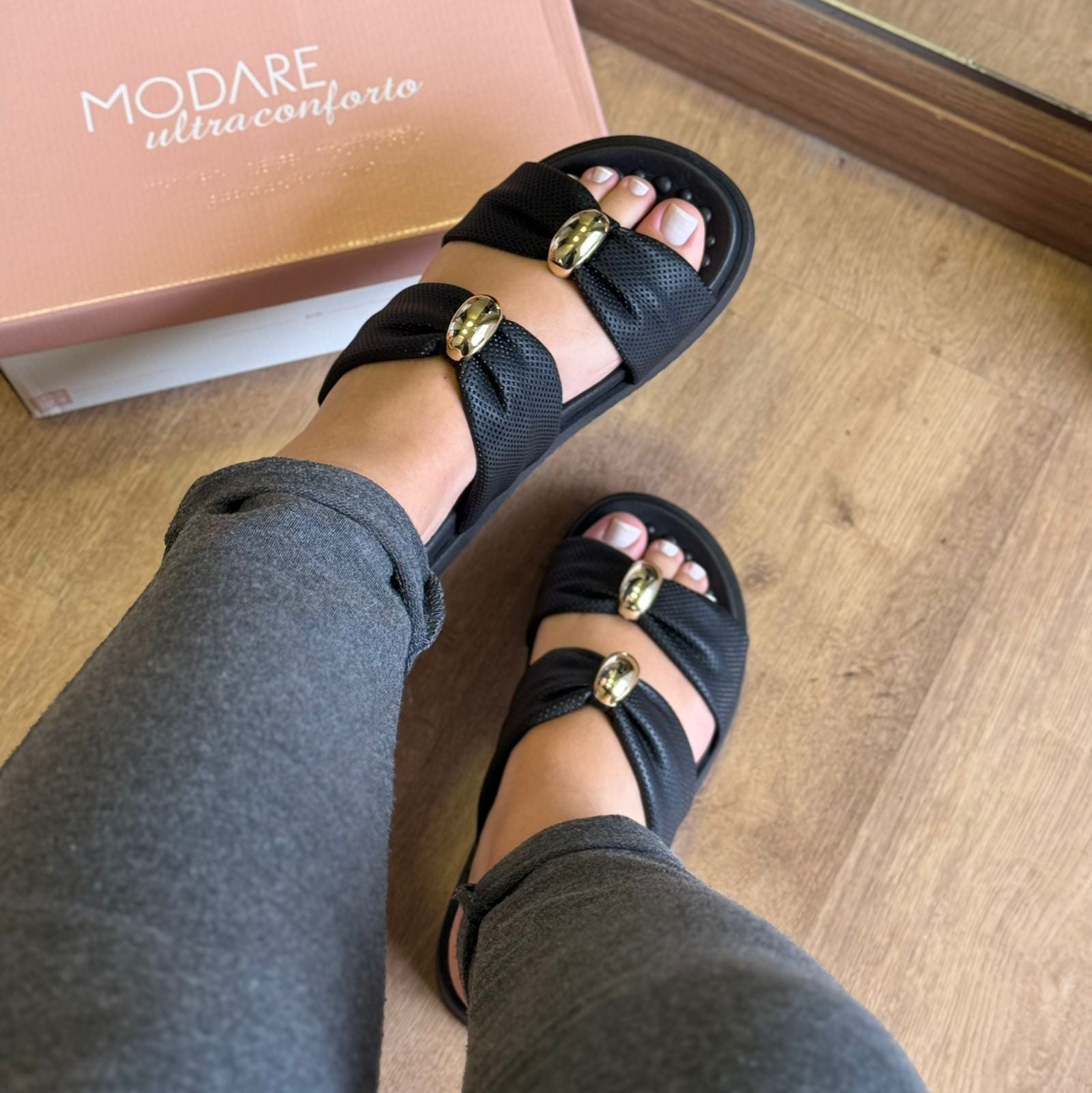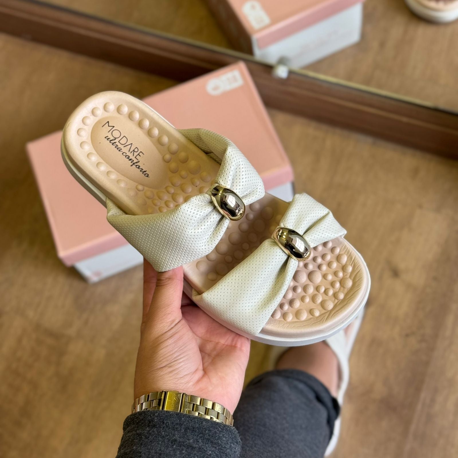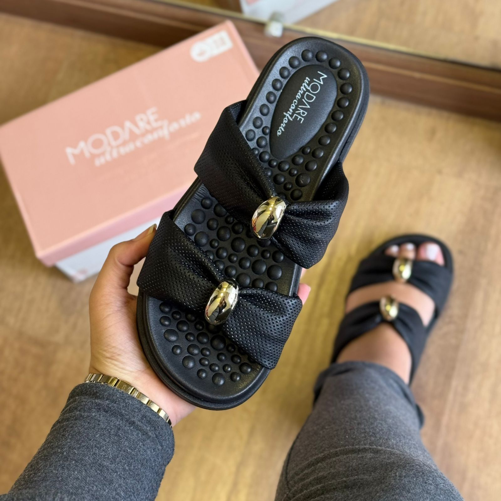 Chinelo feminino Modare desenvolvido para oferecer conforto absoluto com um toque de charme. Conta com palmilha massageadora com pontos de reflexologia que aliviam a pressão ao caminhar, promovendo bem-estar ao longo do dia. O destaque fica por conta dos laços amplos com aplicação metálica central, que valorizam o visual com delicadeza. O solado leve e antiderrapante garante estabilidade em diferentes superfícies. Perfeito para quem busca um calçado prático, elegante e confortável para o cotidiano.