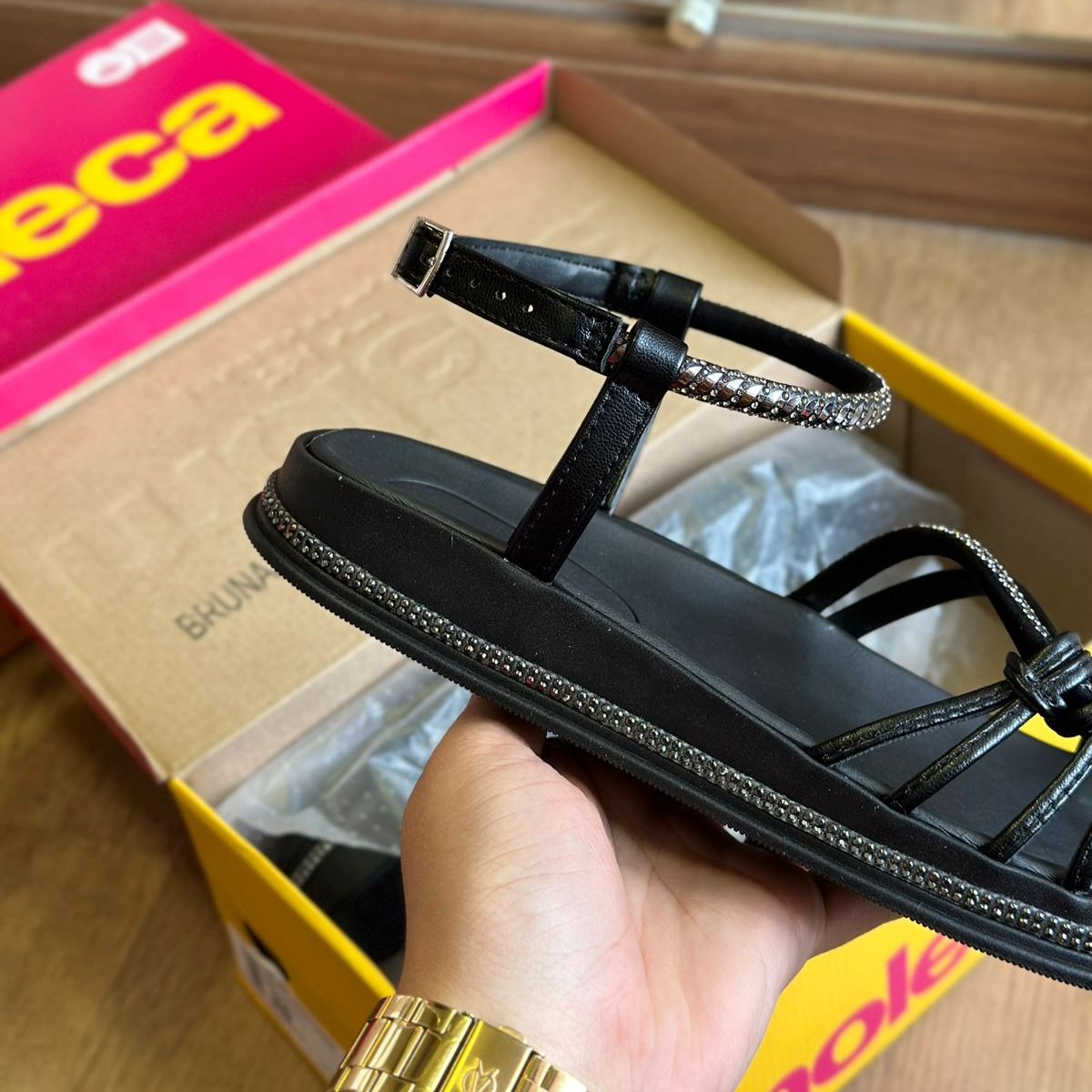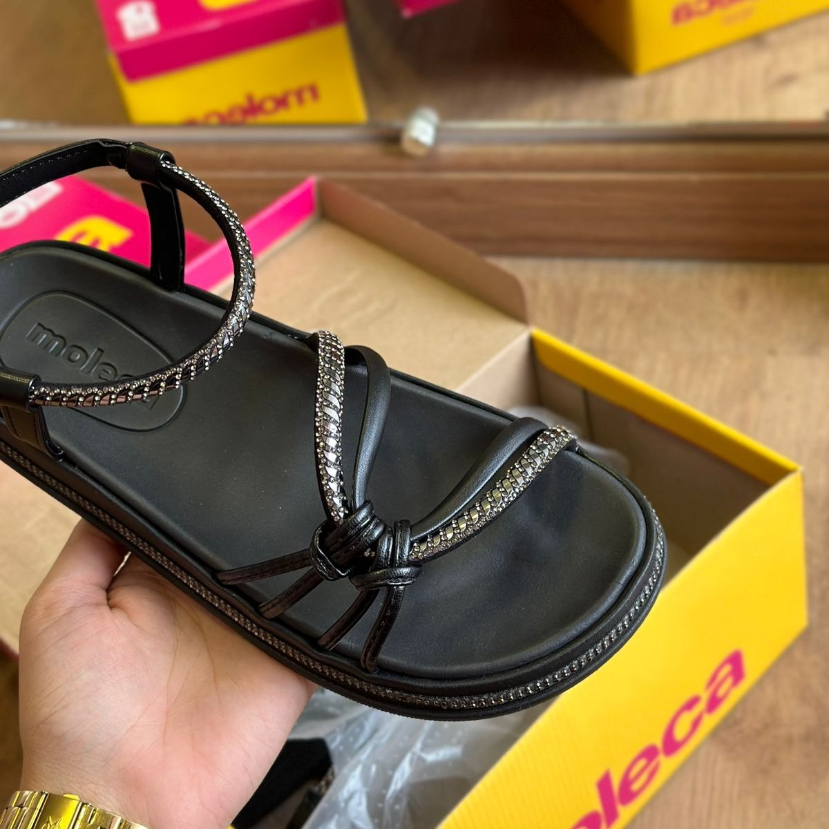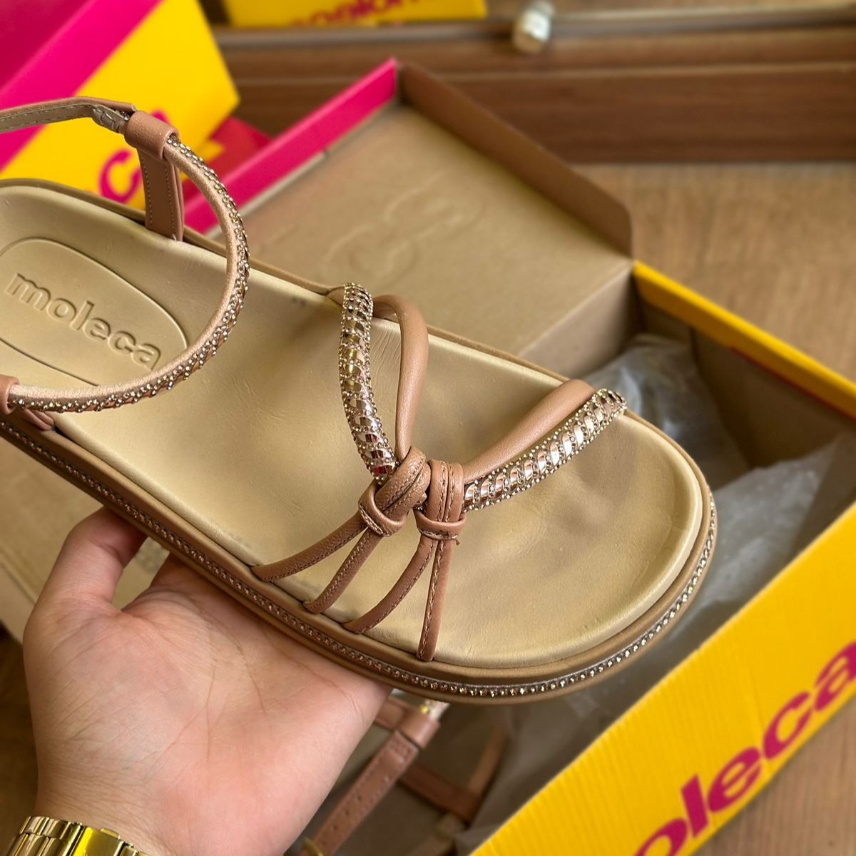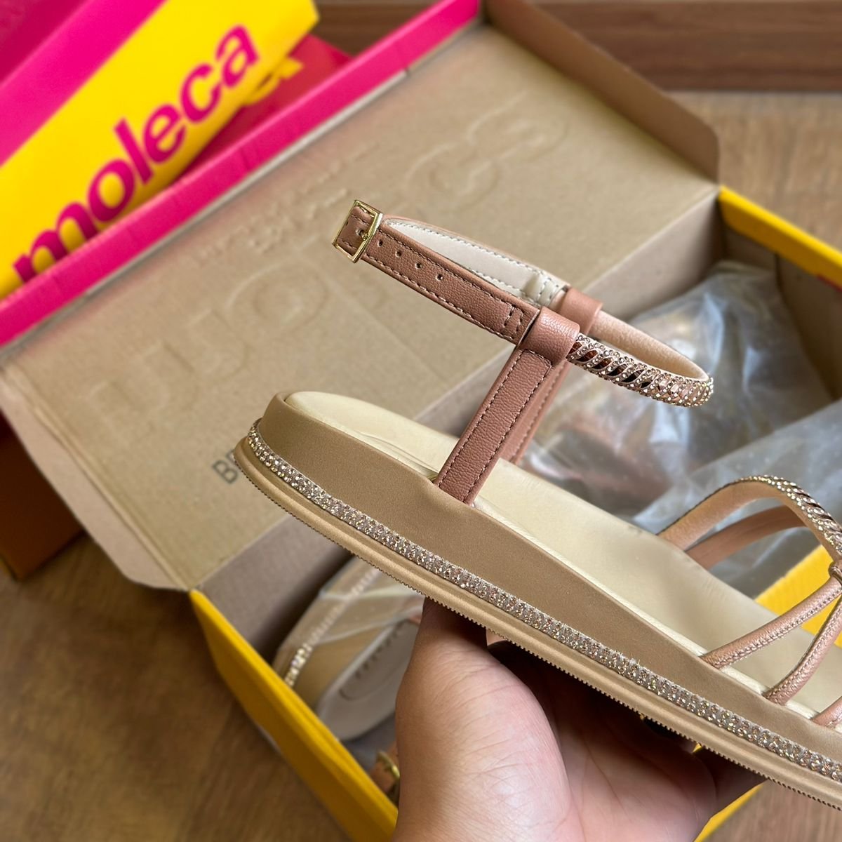 É uma peça versátil e confortável, com cabedal feito em material sintético e detalhes com tiras em strass, conferindo um toque de glamour ao design casual. A palmilha é acolchoada e super confortável, garantindo conforto ao longo do dia. O solado é emborrachado, proporcionando aderência e segurança. O bico arredondado assegura o conforto dos dedos, e o fechamento em fivela facilita o calce. Com acabamento cuidadoso e excelente respirabilidade, essa sandália é perfeita para quem busca estilo e funcionalidade em uma peça única. Altura da sola 2,5 cm.