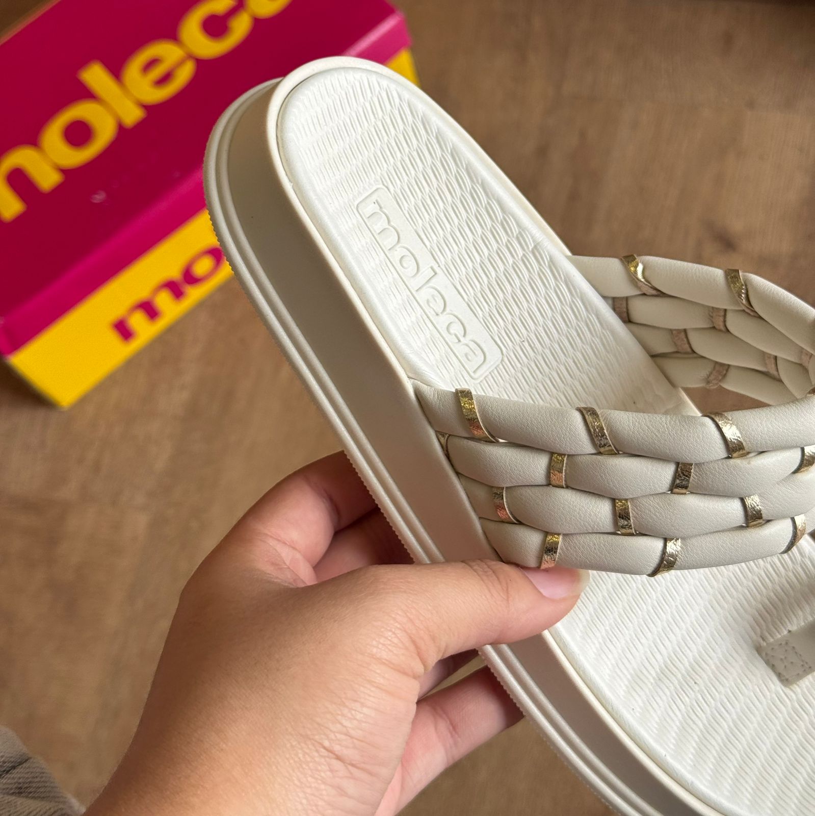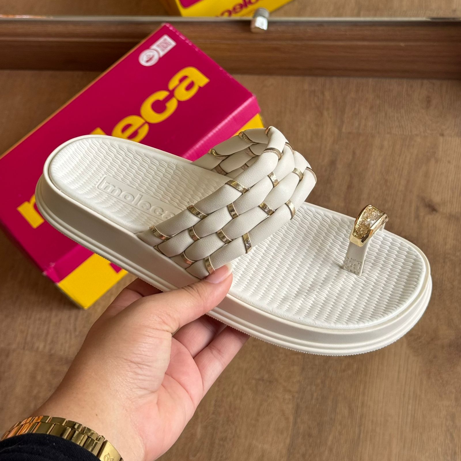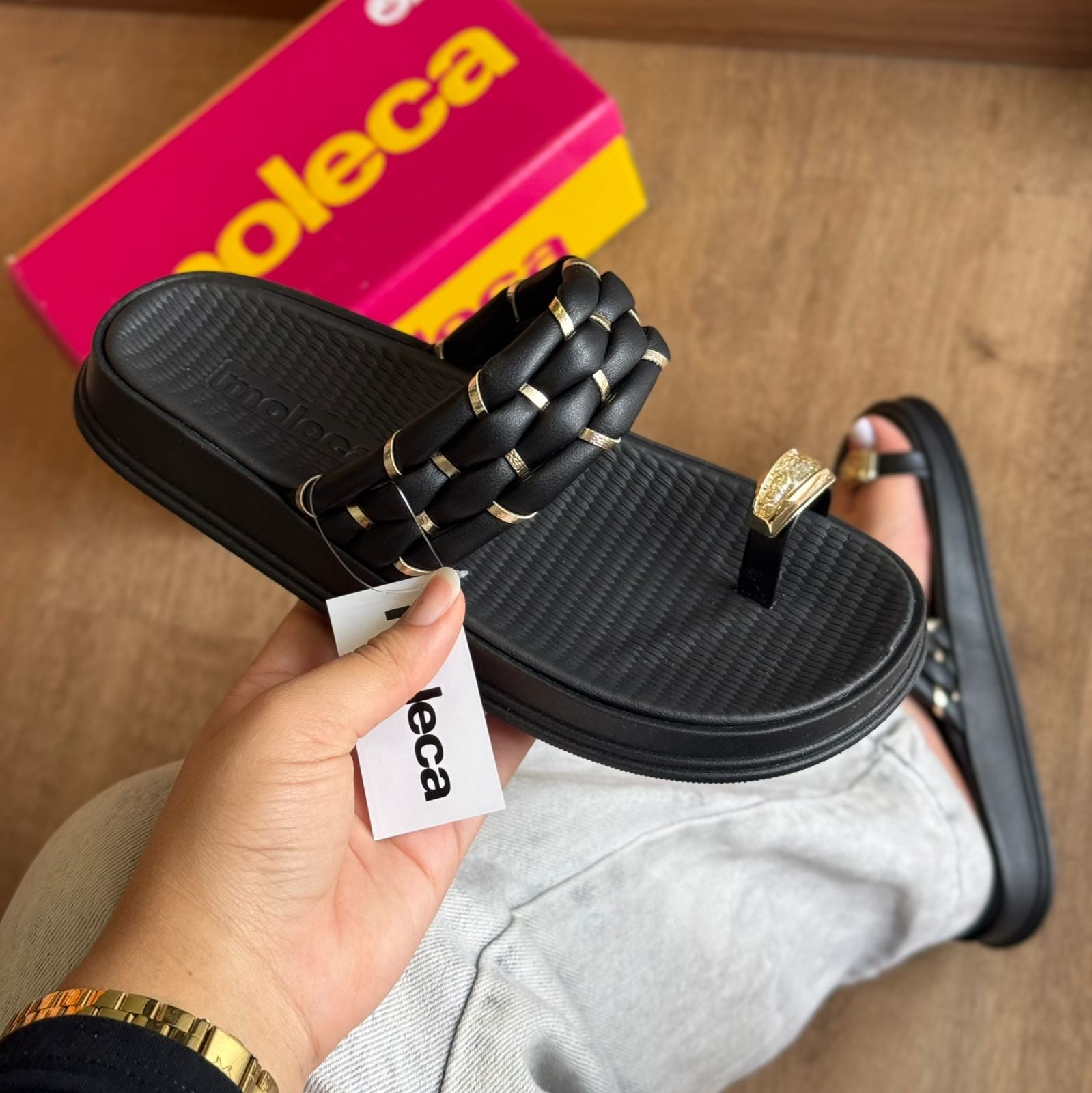 Sandália Moleca com acabamento em detalhes dourado que combina elegância e conforto. O modelo apresenta design versátil, ideal para uso casual ou em ocasiões especiais.