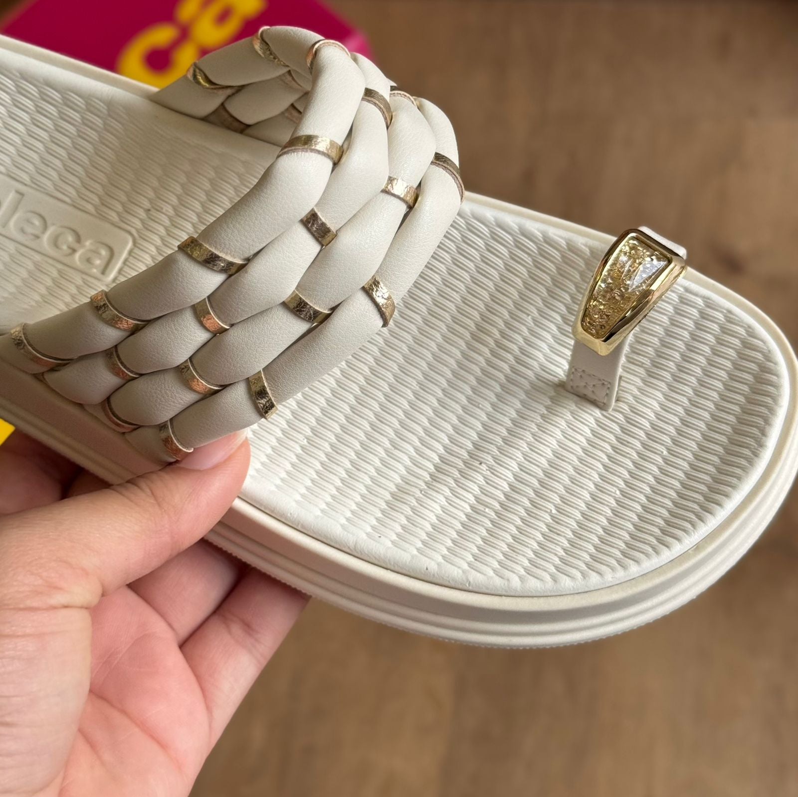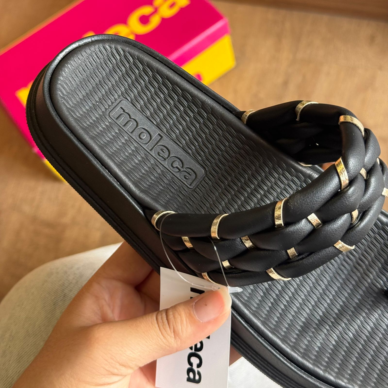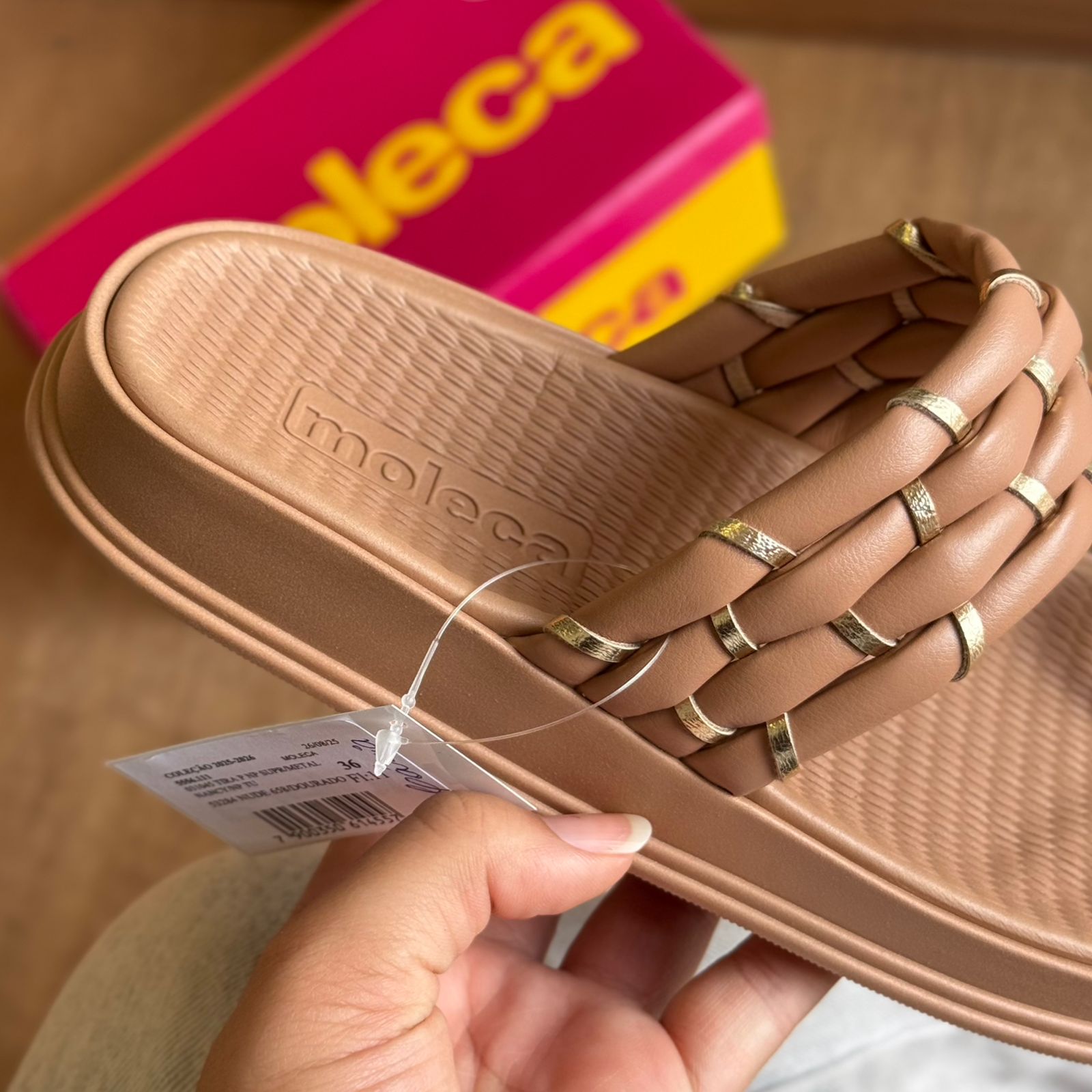 Sandália Moleca com acabamento em detalhes dourado que combina elegância e conforto. O modelo apresenta design versátil, ideal para uso casual ou em ocasiões especiais.
