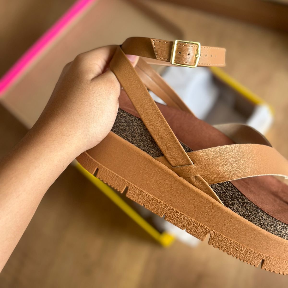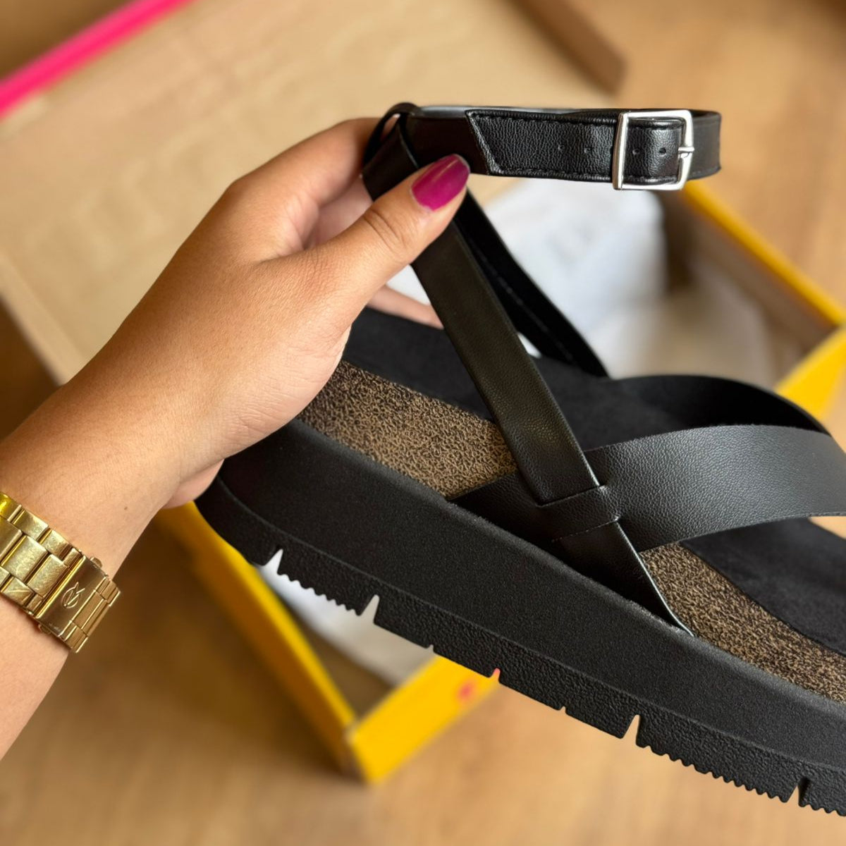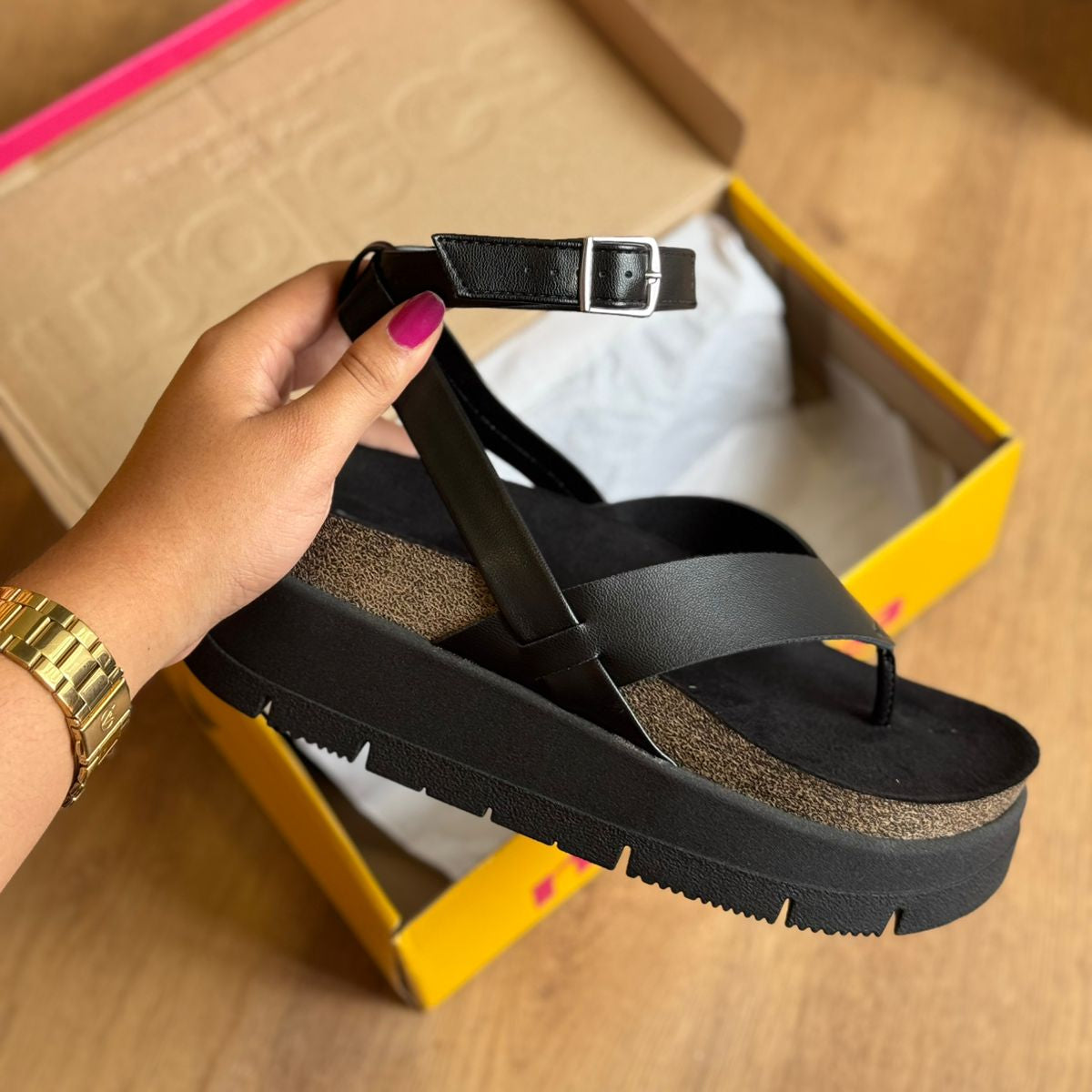 É confeccionada em napa, material de alta qualidade e durabilidade. Sua palmilha possui um forro macio e muito confortável. Seu fecho é através de ajustes de contato, ela é monocolor, e possui um solado levemente tratorado de 4 cm de altura.
