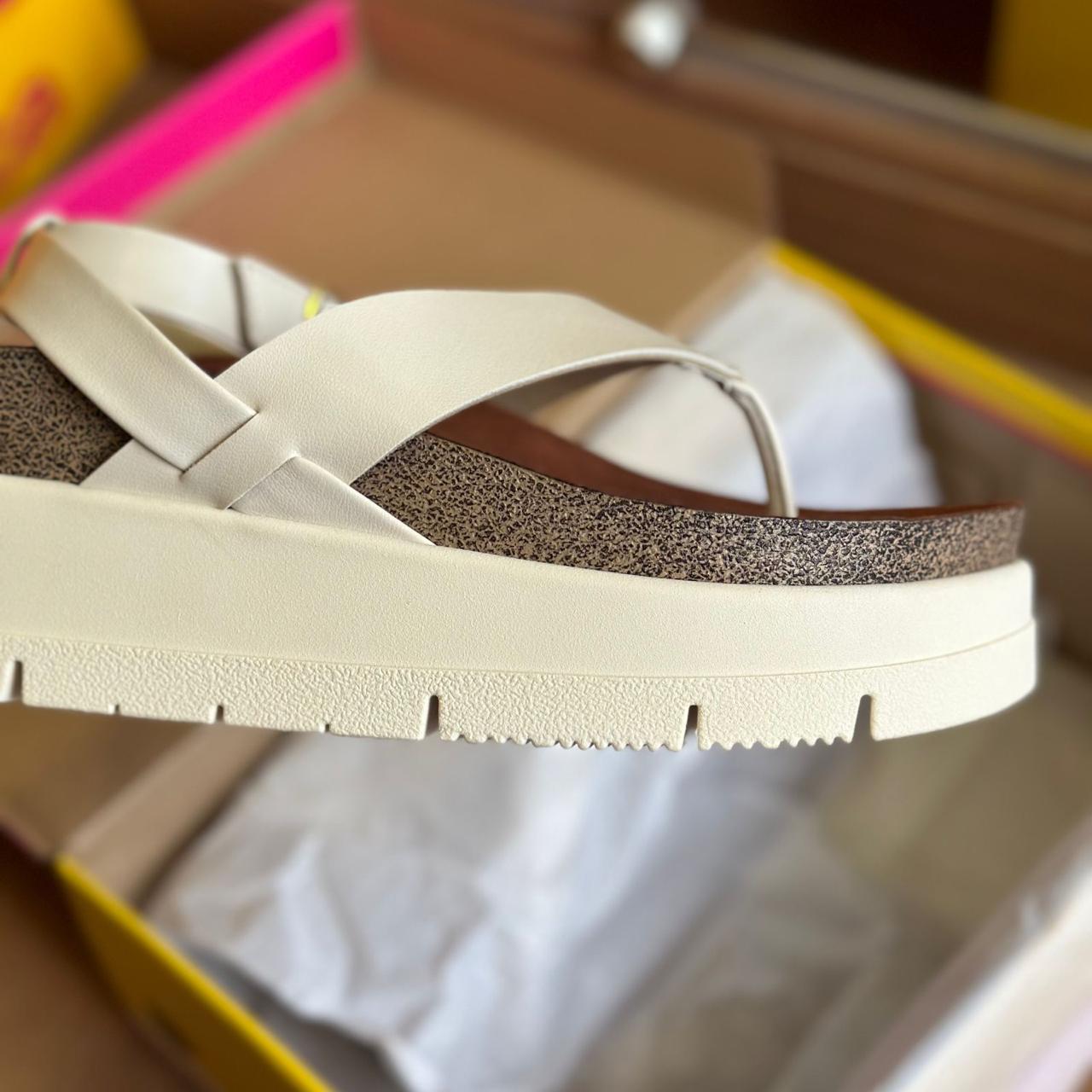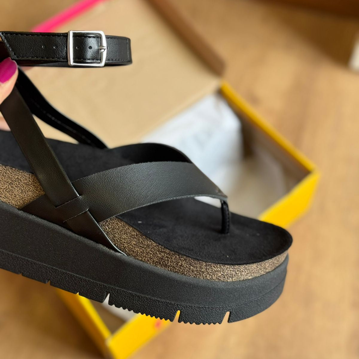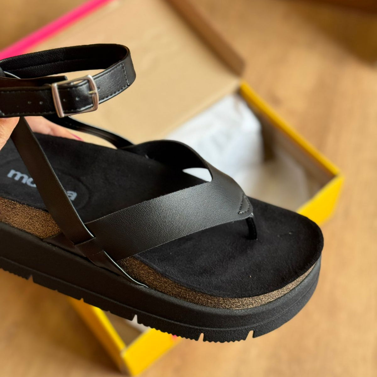 É confeccionada em napa, material de alta qualidade e durabilidade. Sua palmilha possui um forro macio e muito confortável. Seu fecho é através de ajustes de contato, ela é monocolor, e possui um solado levemente tratorado de 4 cm de altura.