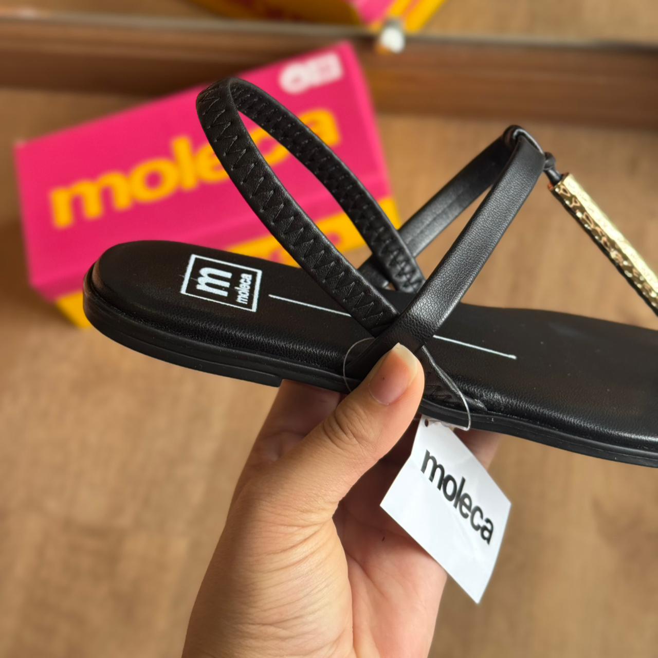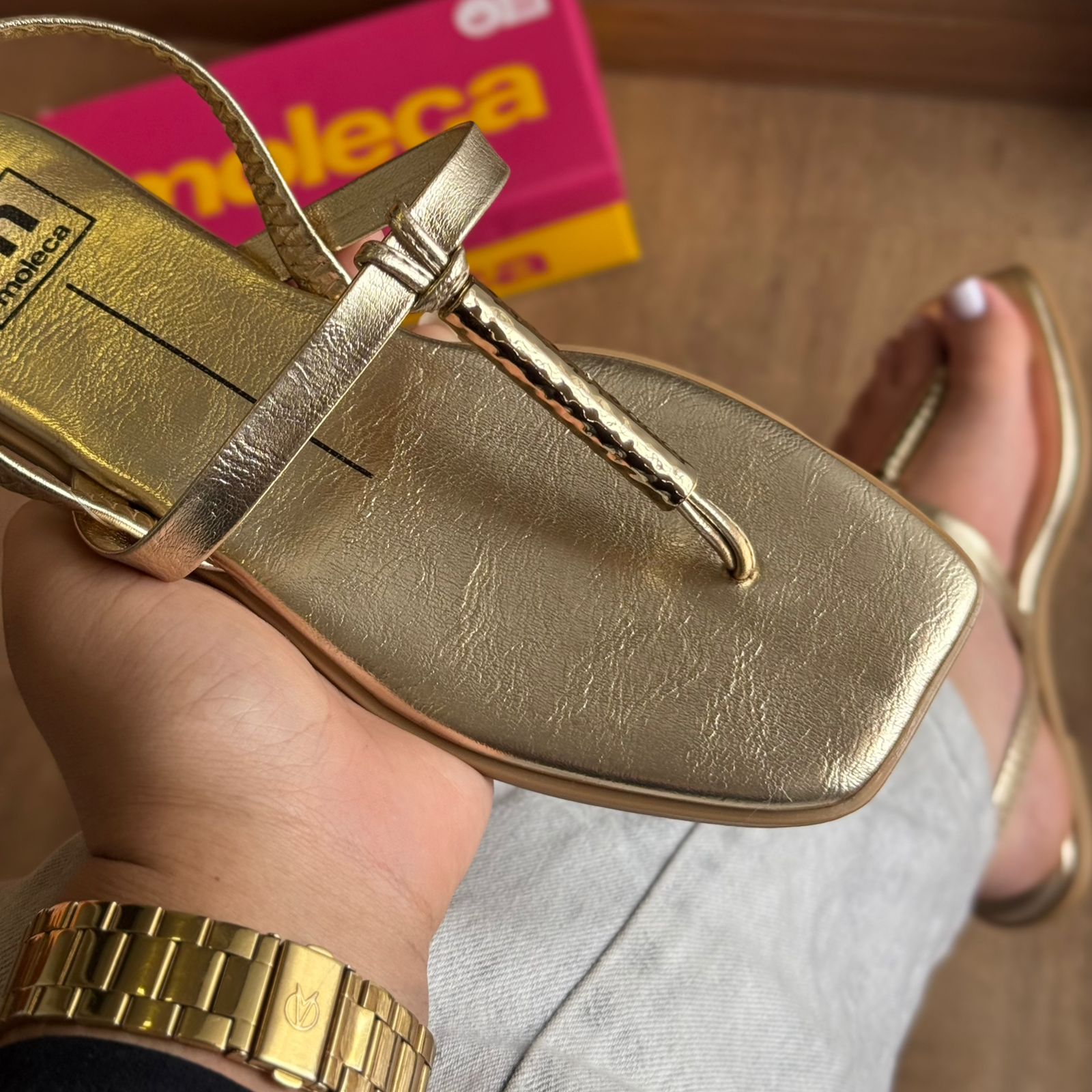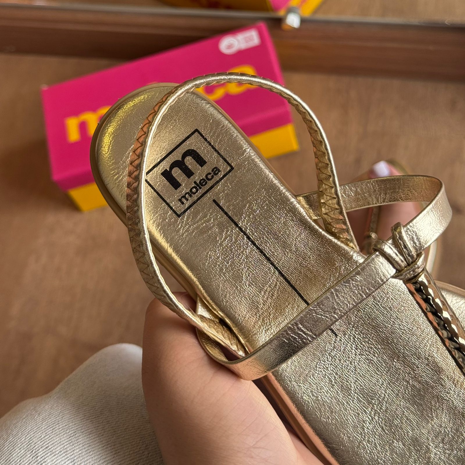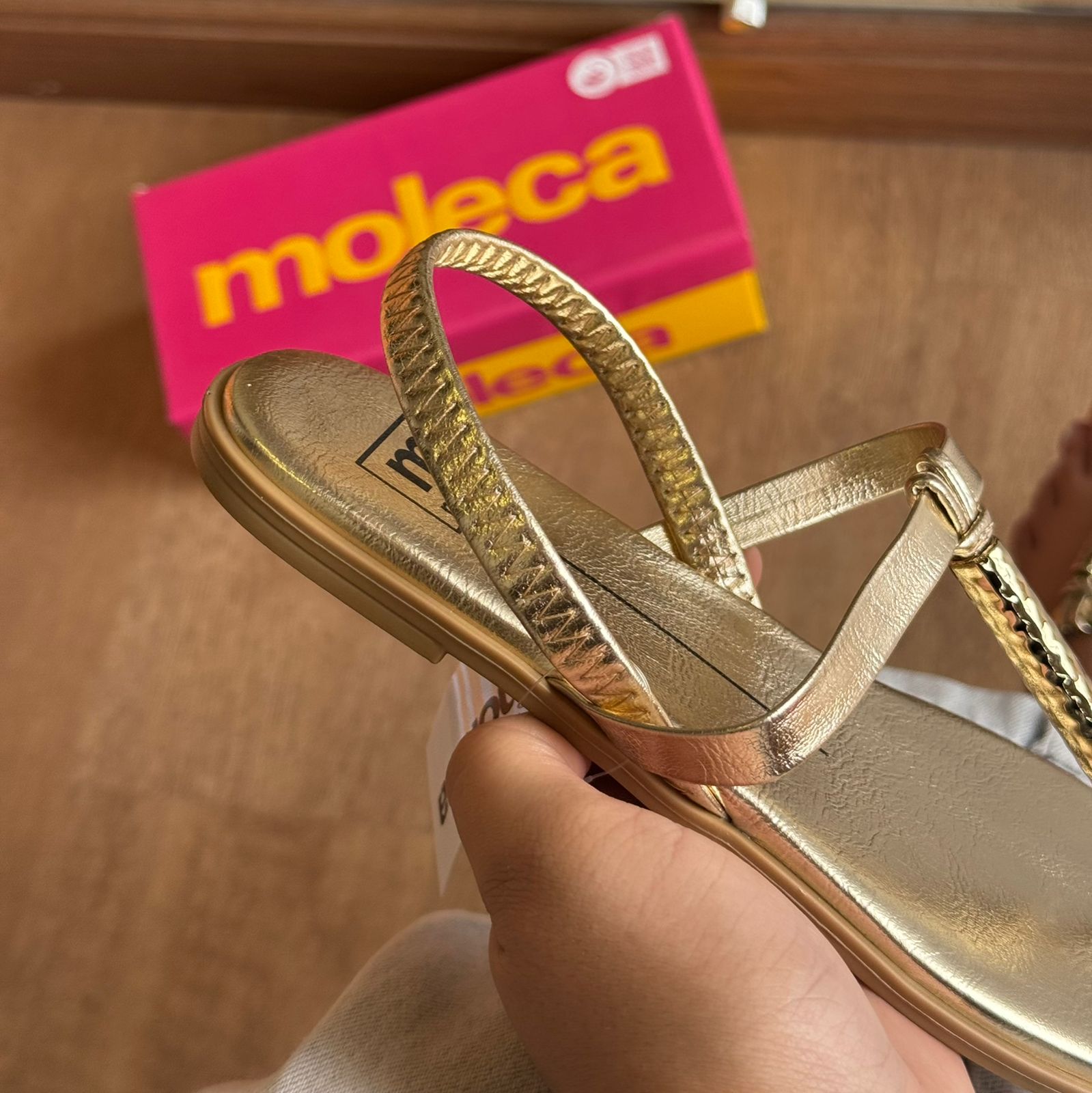 Sandália rasteirinha Moleca com acabamento sofisticado. O detalhe metálico na frente adiciona um toque de elegância ao design minimalista, tornando-a versátil para looks casuais e semi-formais. Construída com materiais de qualidade, oferece conforto o dia todo. Ideal para quem busca uma peça clássica que combina com praticamente qualquer guarda-roupa.