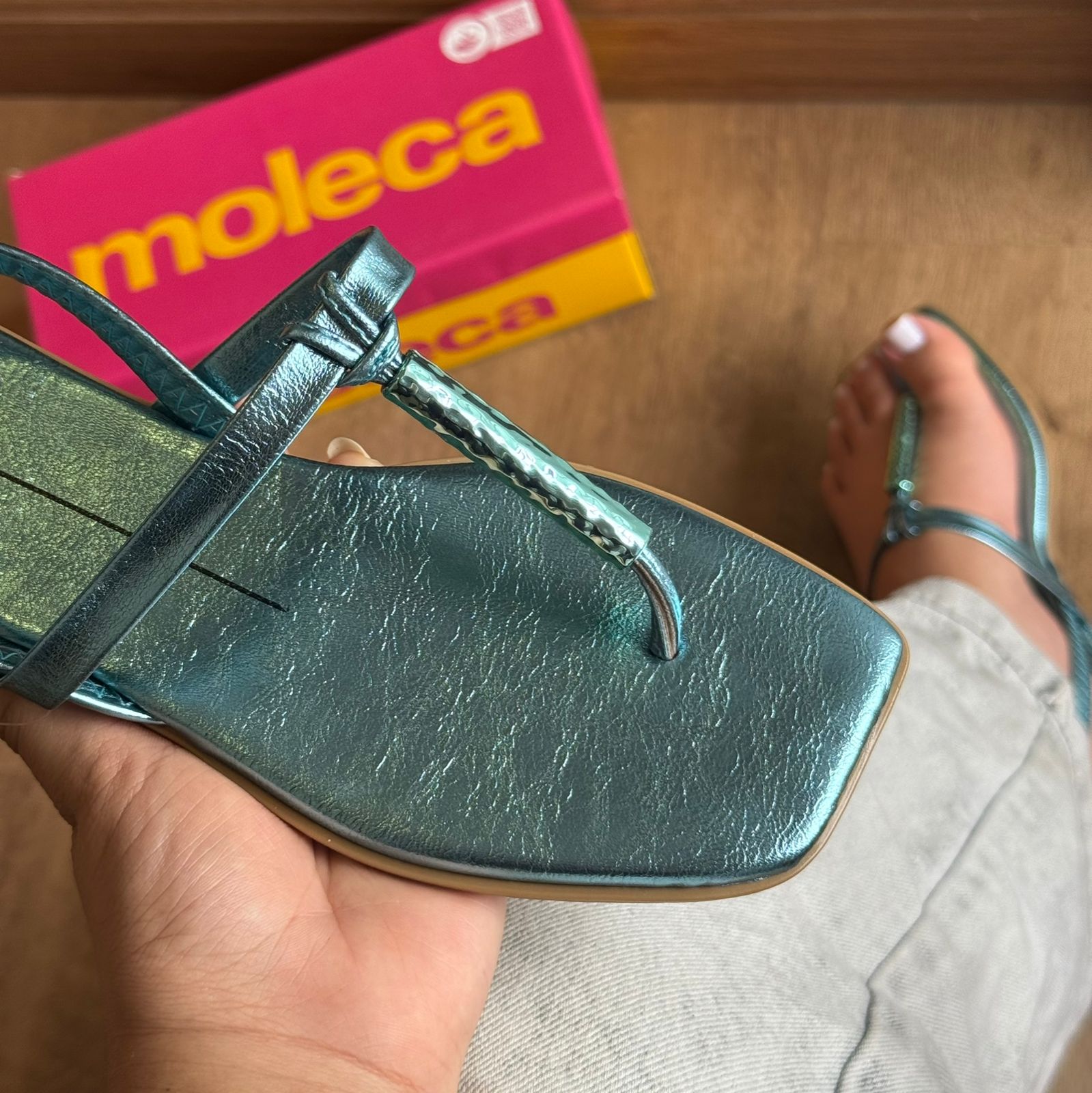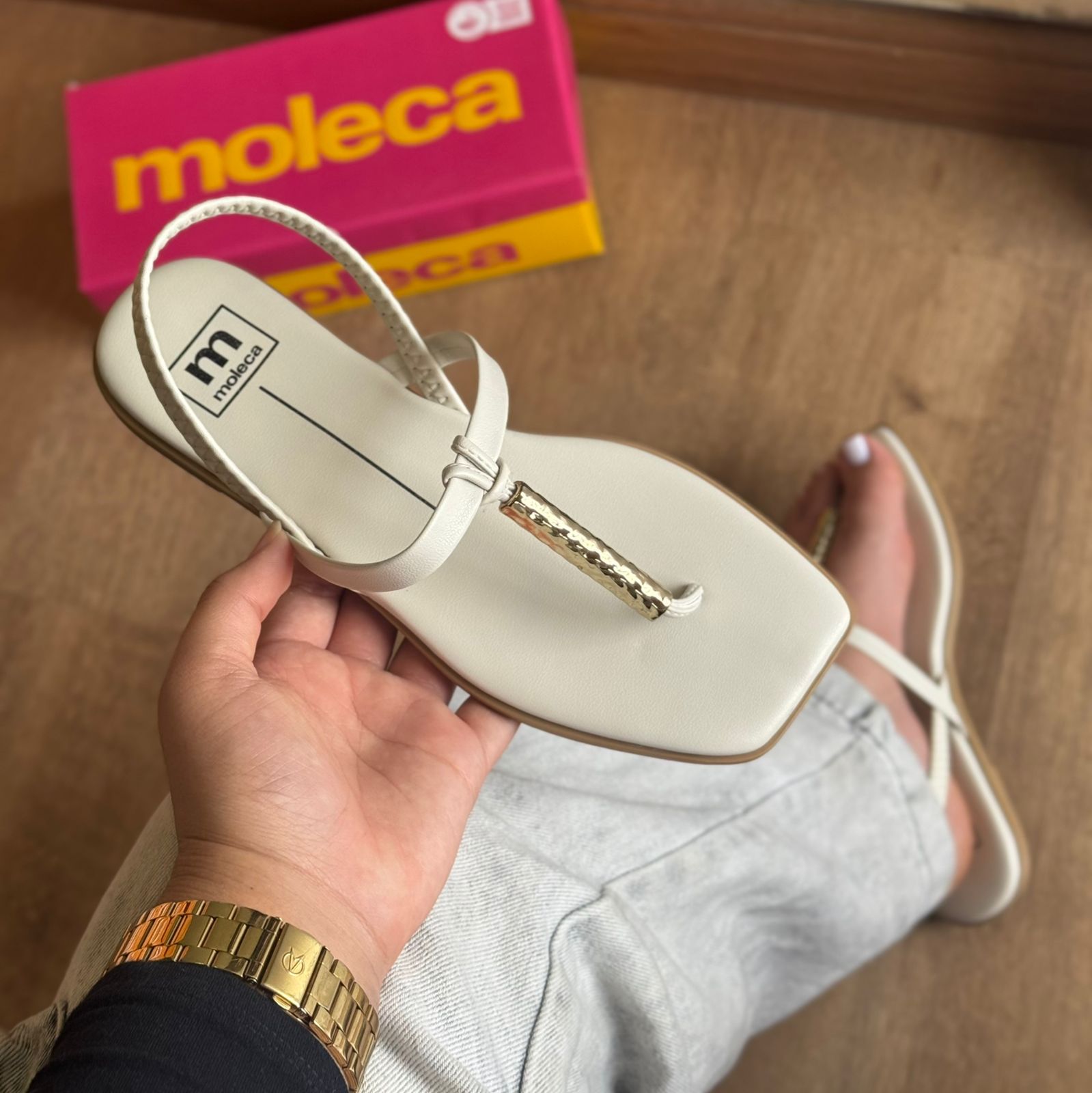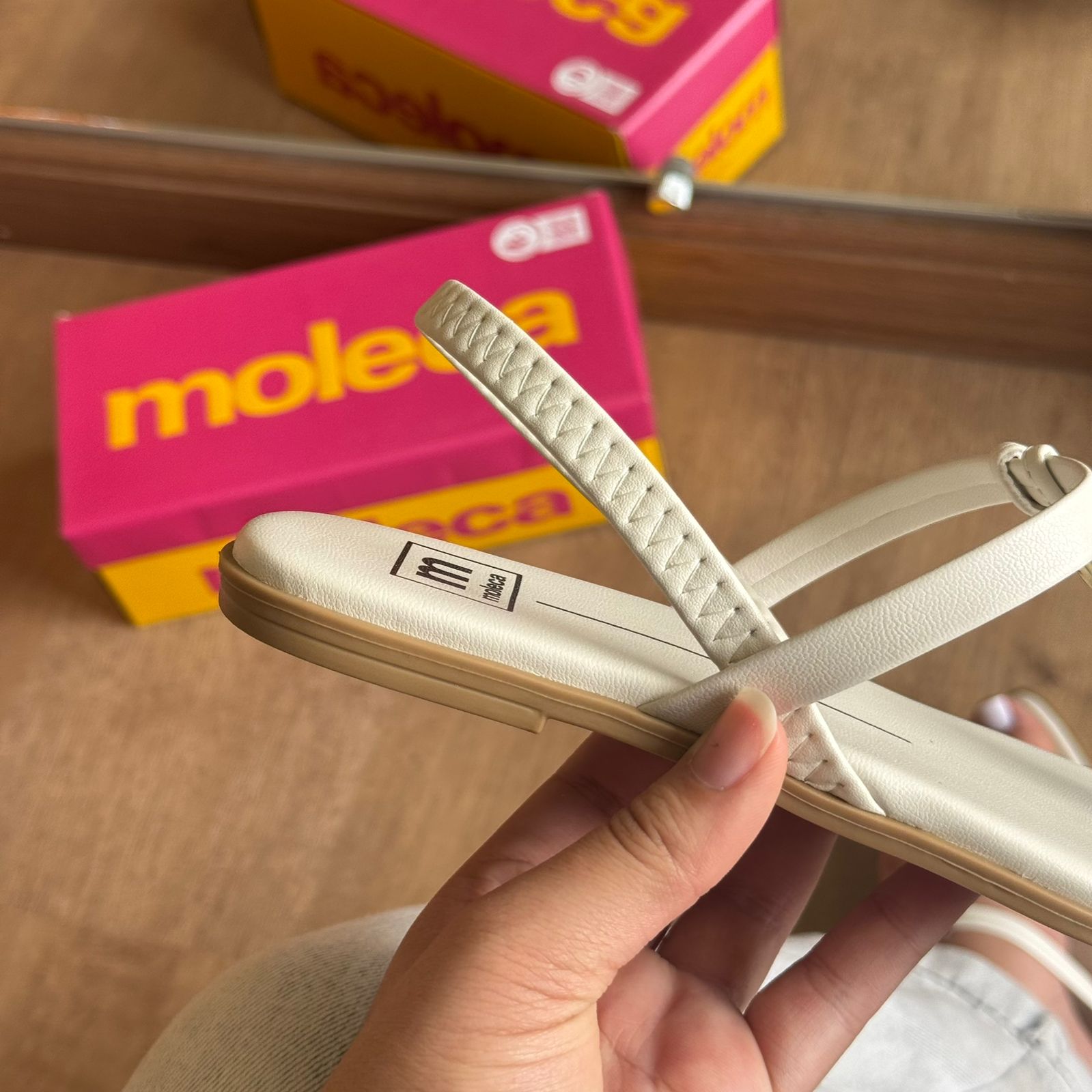 Sandália rasteirinha Moleca com acabamento sofisticado. O detalhe metálico na frente adiciona um toque de elegância ao design minimalista, tornando-a versátil para looks casuais e semi-formais. Construída com materiais de qualidade, oferece conforto o dia todo. Ideal para quem busca uma peça clássica que combina com praticamente qualquer guarda-roupa.