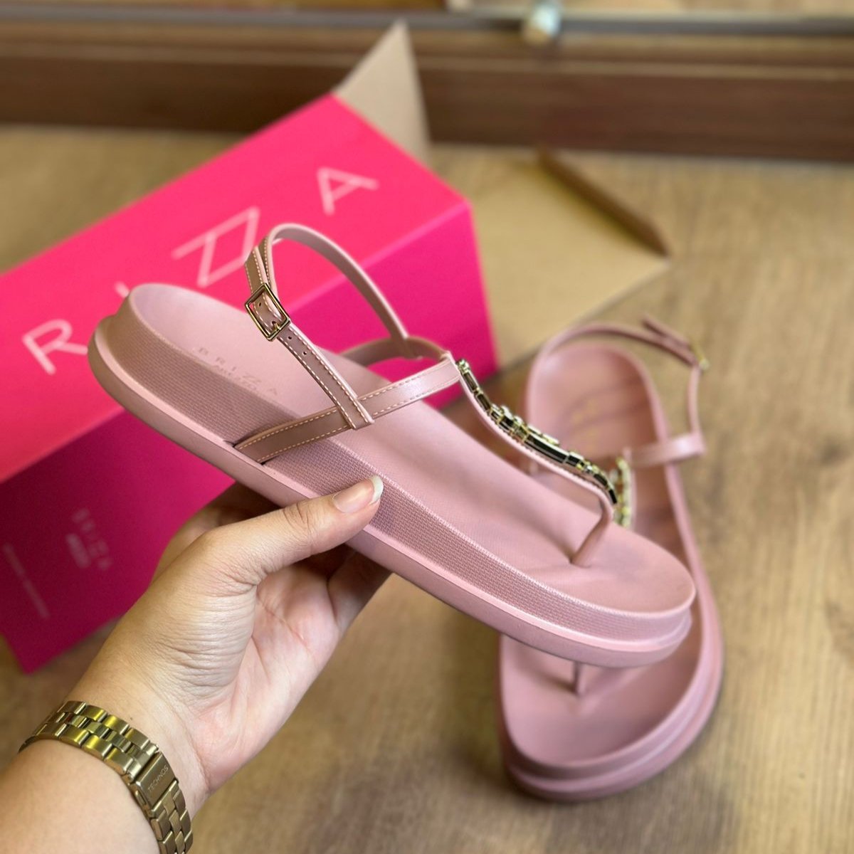 Descrição: O sapato tem salto rasteiro, palmilha com formato anatômico e inscrição do nome da marca. Possui solado em EVA e formato arredondado na ponta. Traz tira fina com strass que passa entre os dedos, conectada a mais uma tira fina na parte superior do pé. Possui ainda tira fina em torno do calcanhar com fecho em fivela metálica lateral. Deixa todo o pé à mostra.