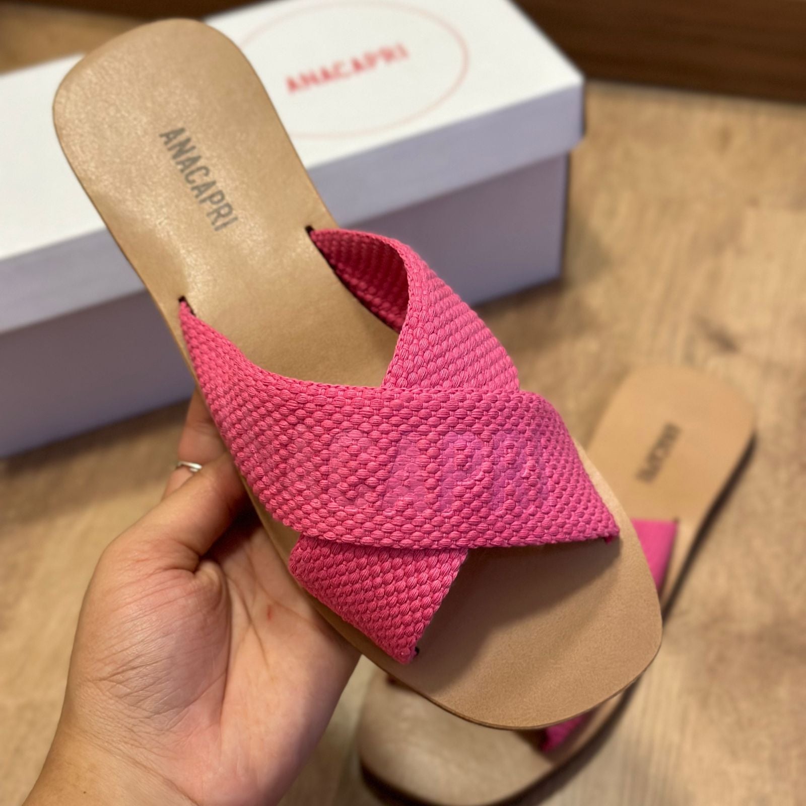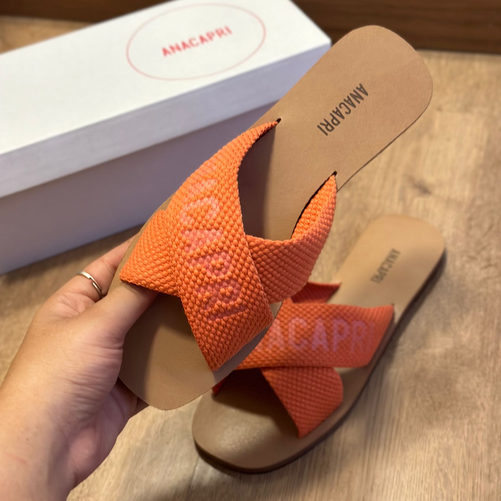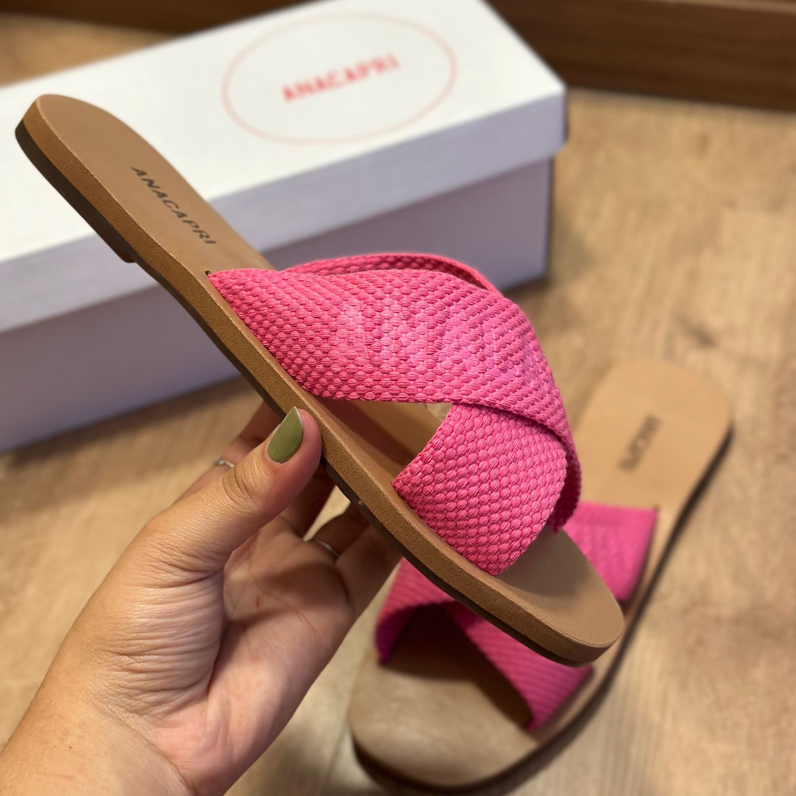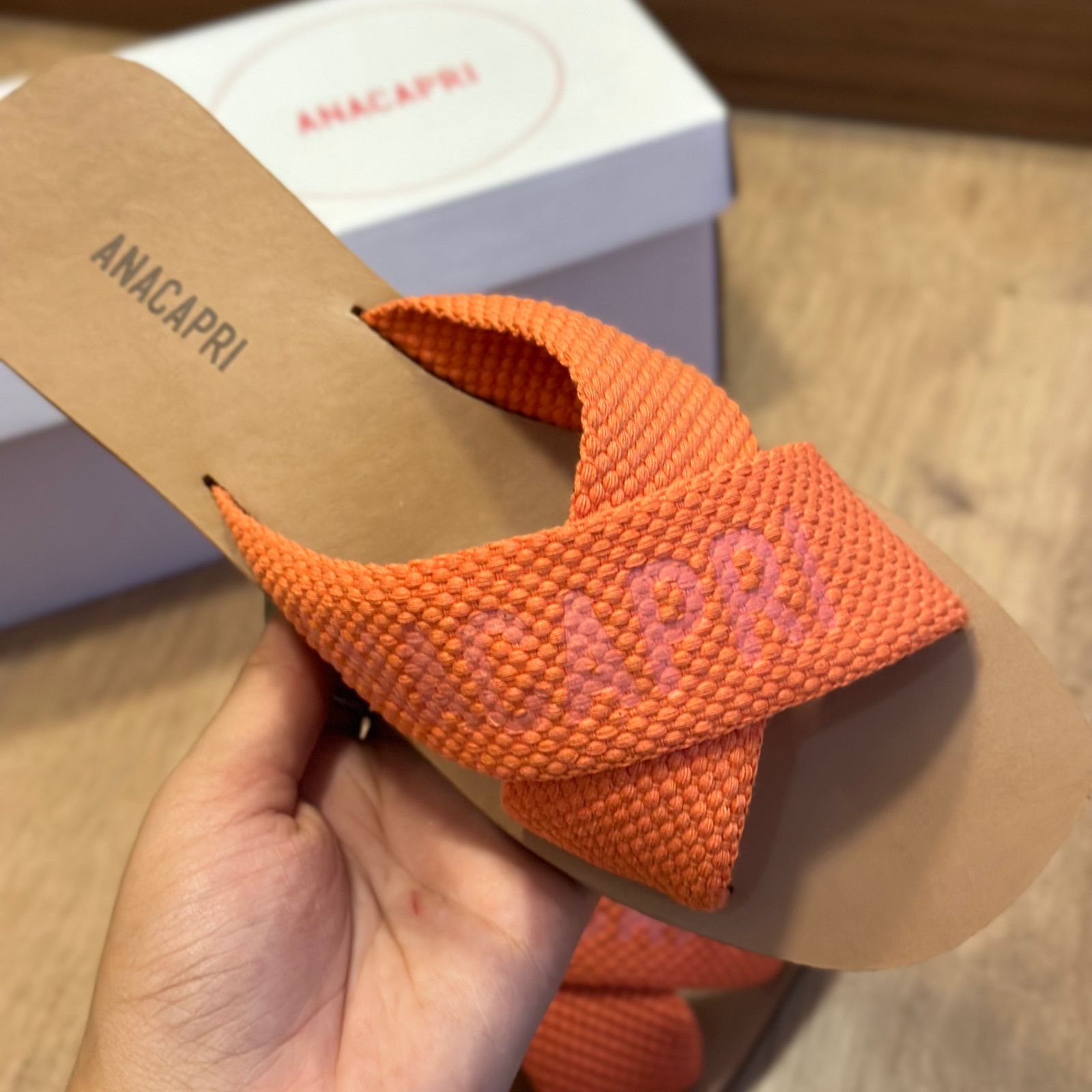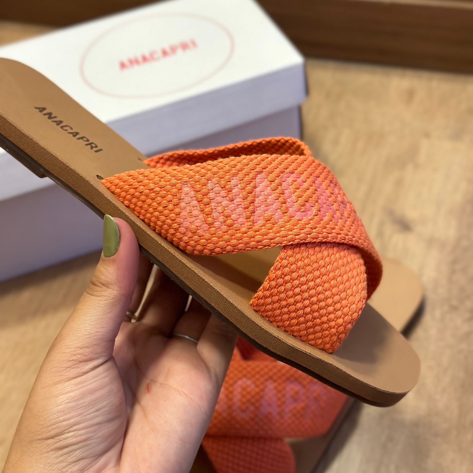 O modelo tem bico quadrado e palmilha marrom com nome da marca. Traz duas tiras largas em fita, cruzadas sobre o peito do pé, com inscrição ANACAPRI em branco. Deixa dedos e calcanhar à mostra.