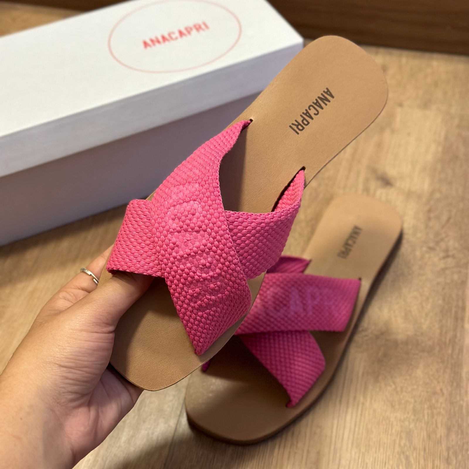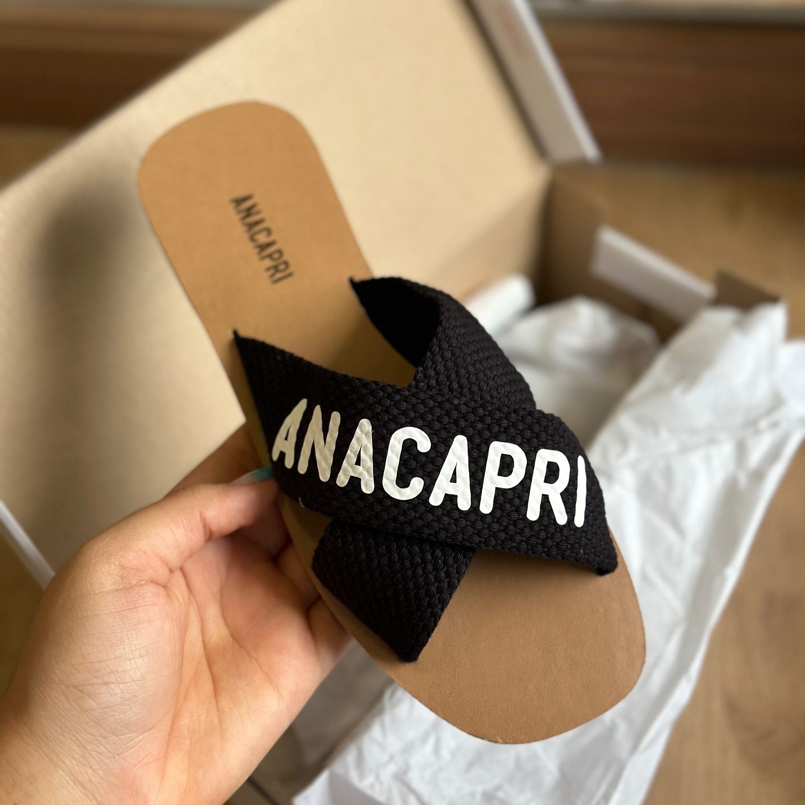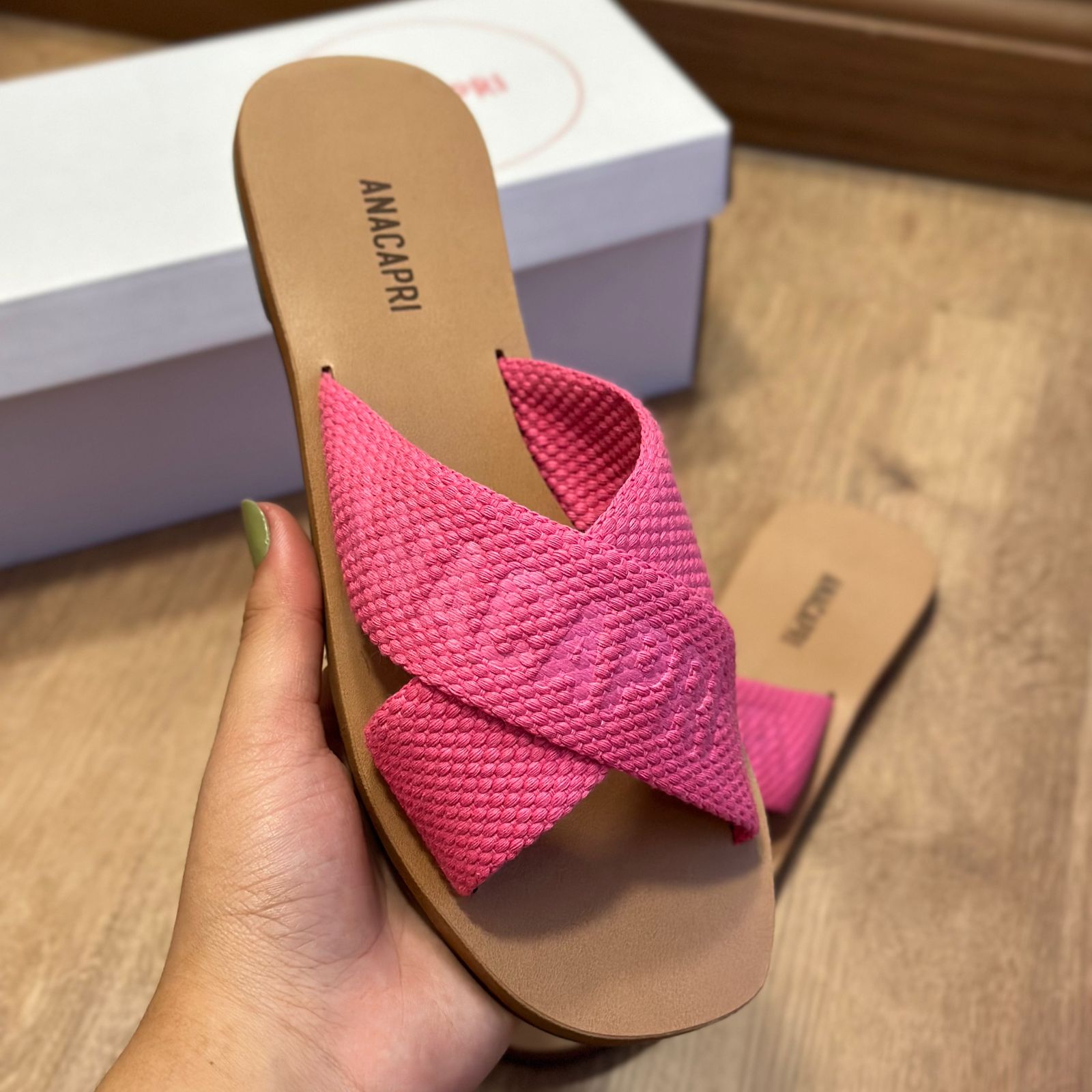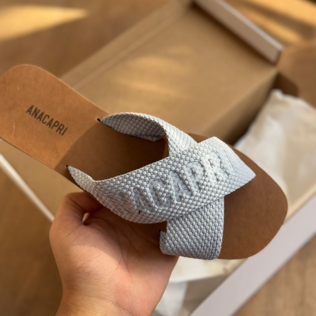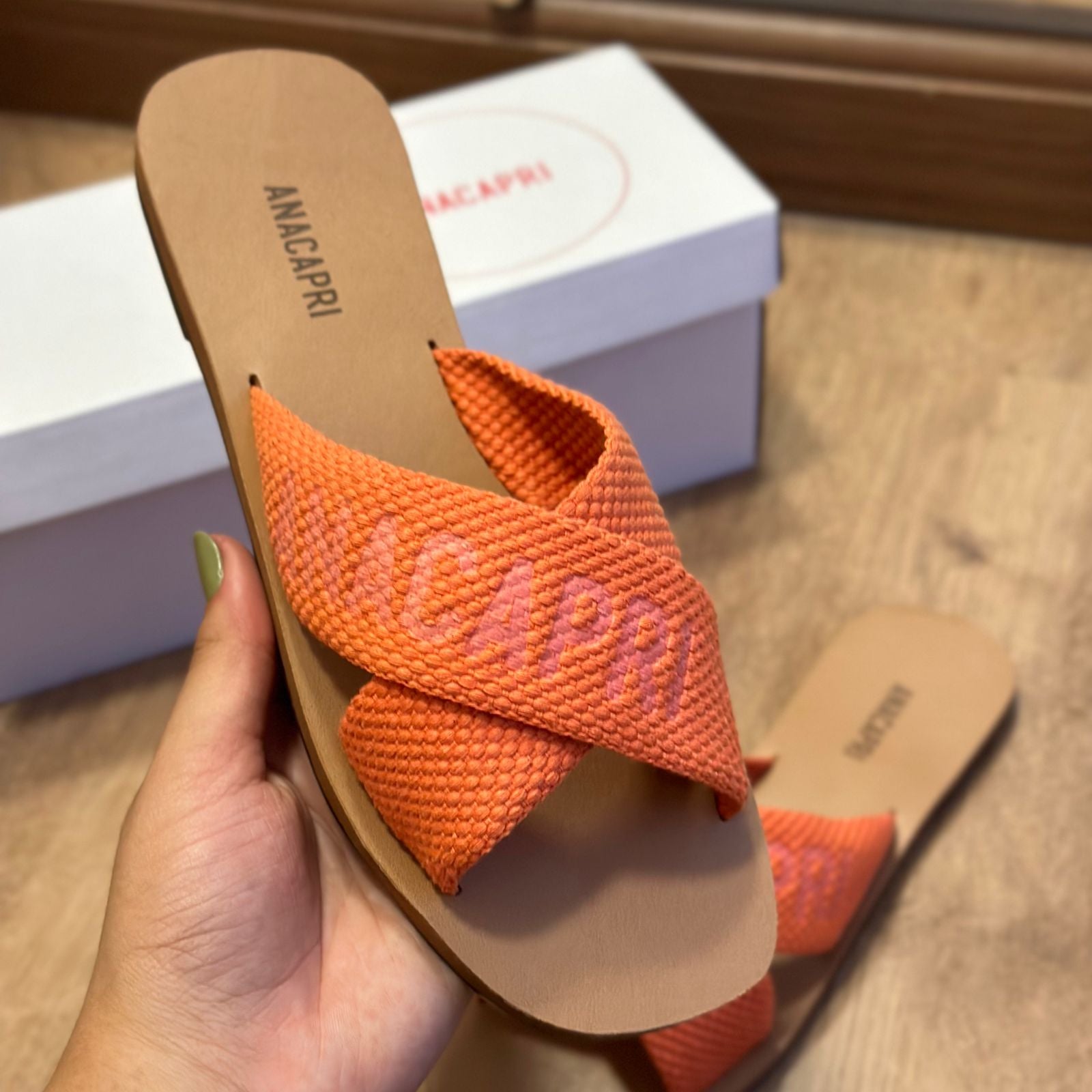 O modelo tem bico quadrado e palmilha marrom com nome da marca. Traz duas tiras largas em fita, cruzadas sobre o peito do pé, com inscrição ANACAPRI em branco. Deixa dedos e calcanhar à mostra.