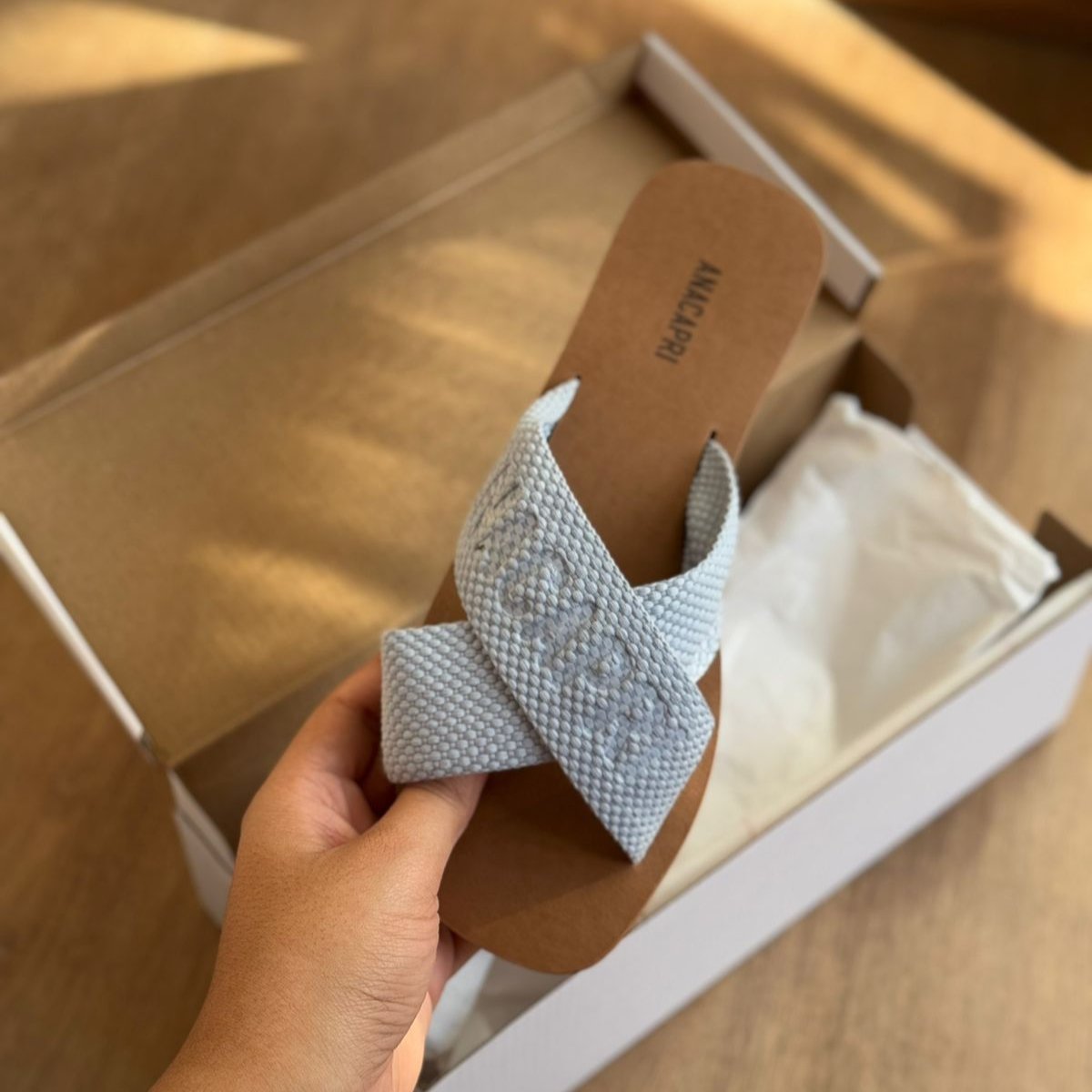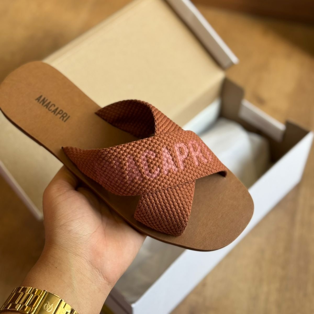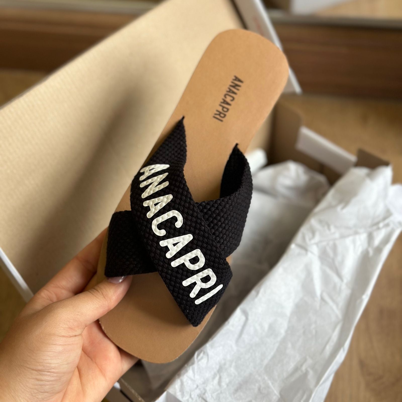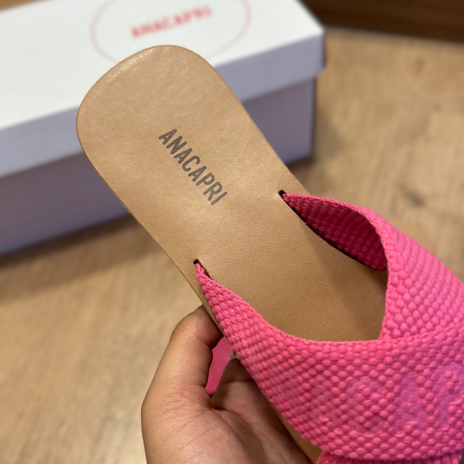 O modelo tem bico quadrado e palmilha marrom com nome da marca. Traz duas tiras largas em fita, cruzadas sobre o peito do pé, com inscrição ANACAPRI em branco. Deixa dedos e calcanhar à mostra.