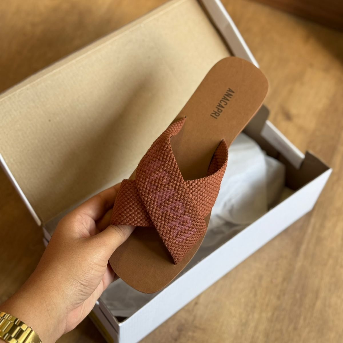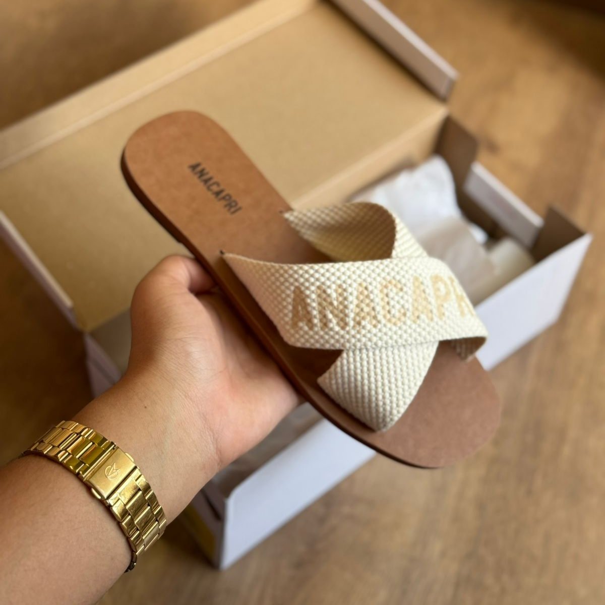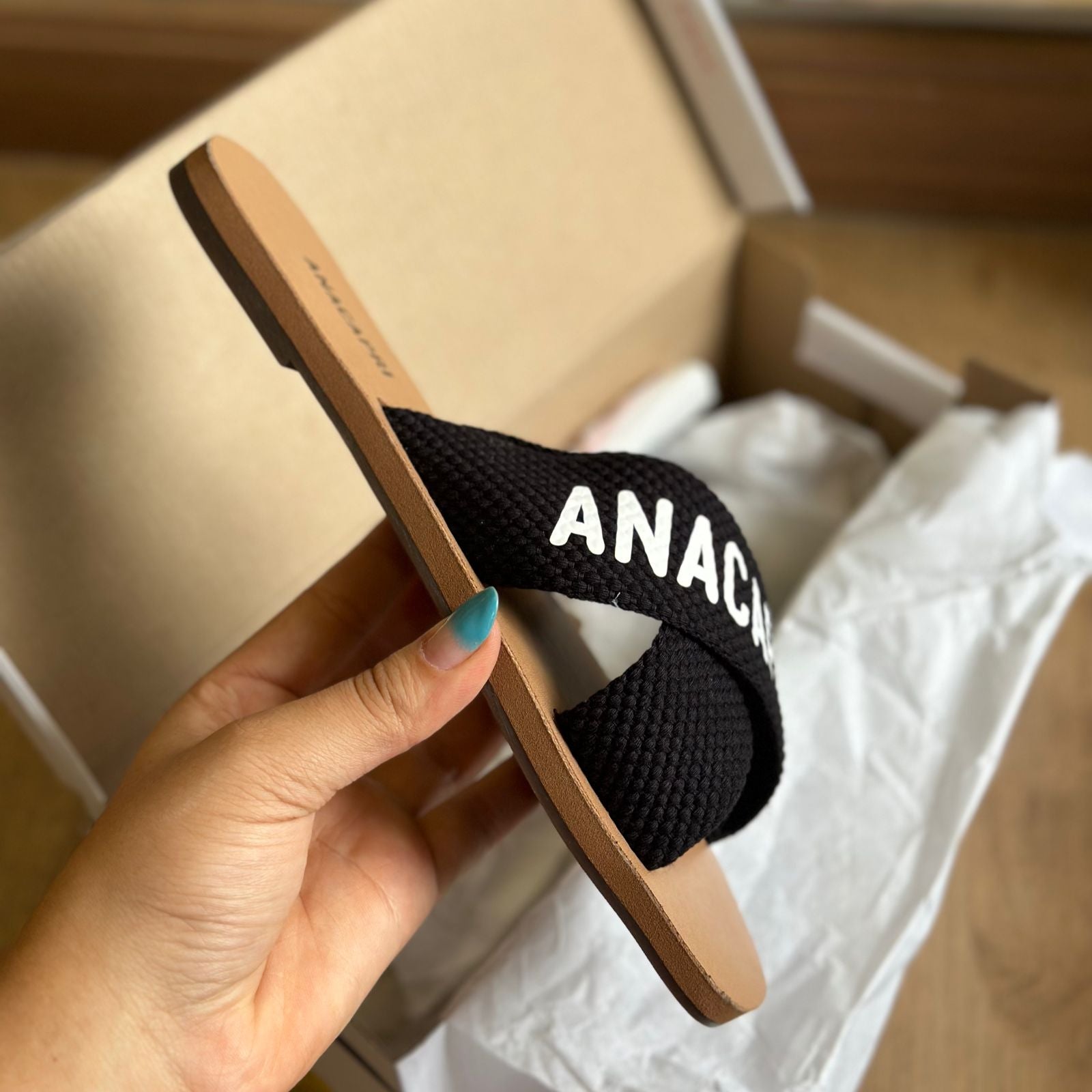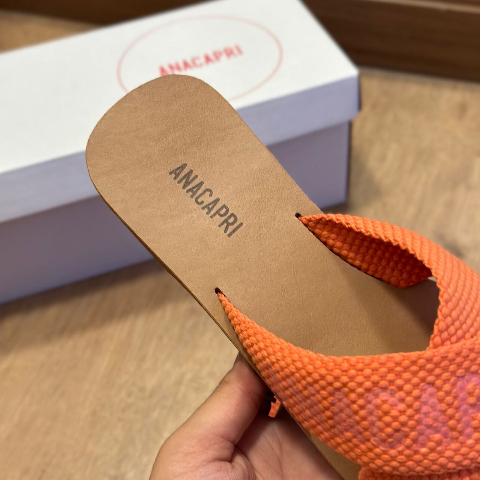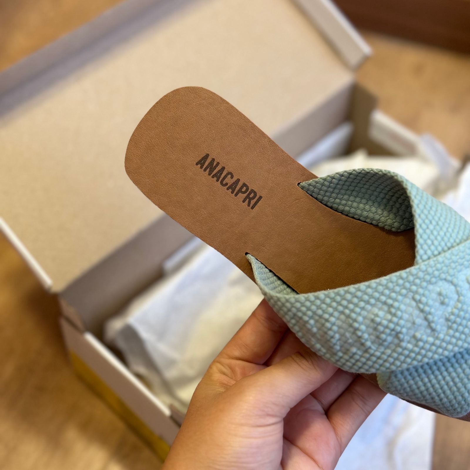 O modelo tem bico quadrado e palmilha marrom com nome da marca. Traz duas tiras largas em fita, cruzadas sobre o peito do pé, com inscrição ANACAPRI em branco. Deixa dedos e calcanhar à mostra.