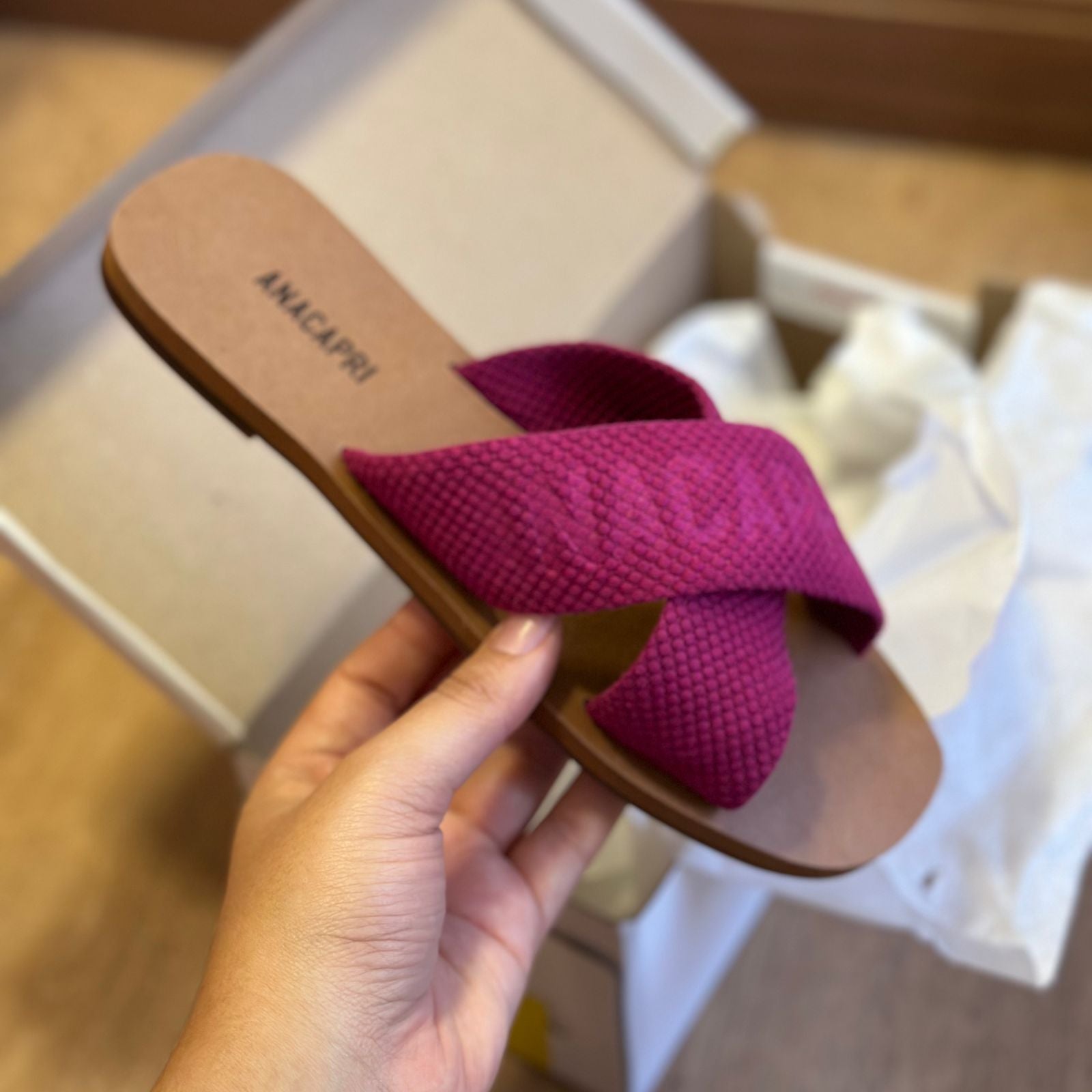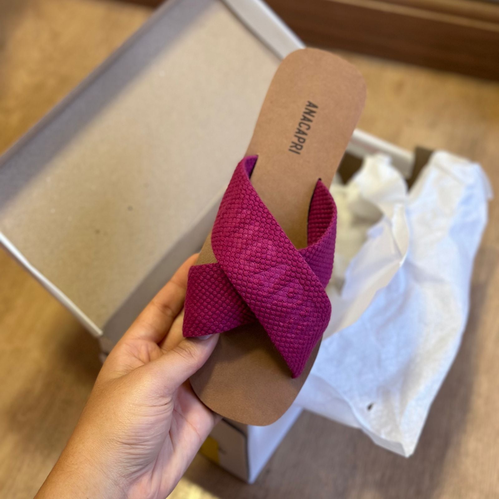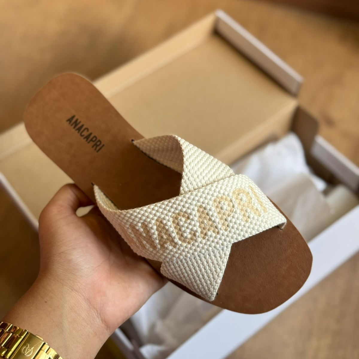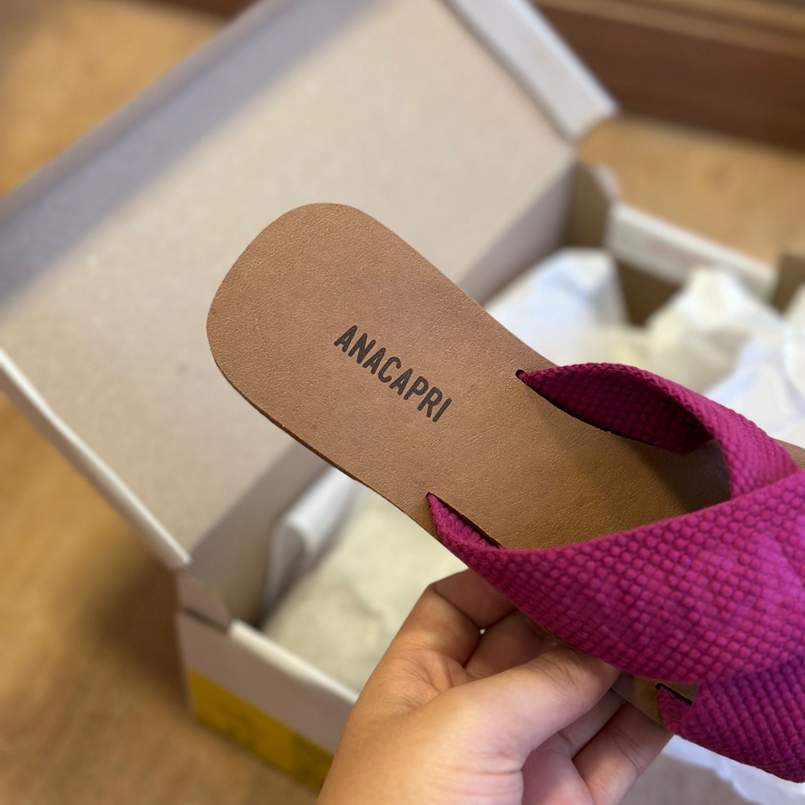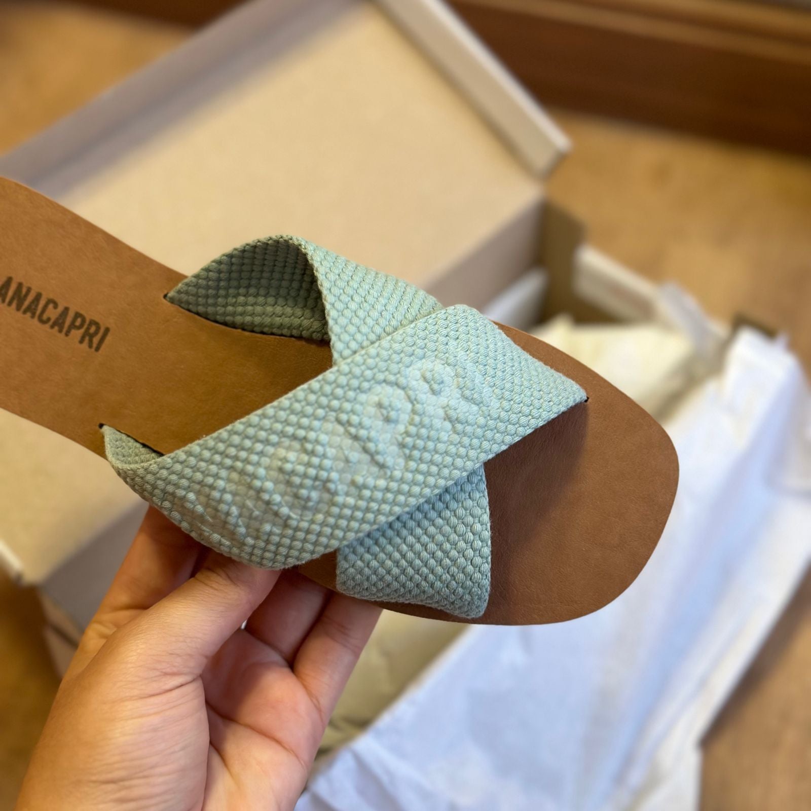 O modelo tem bico quadrado e palmilha marrom com nome da marca. Traz duas tiras largas em fita, cruzadas sobre o peito do pé, com inscrição ANACAPRI em branco. Deixa dedos e calcanhar à mostra.