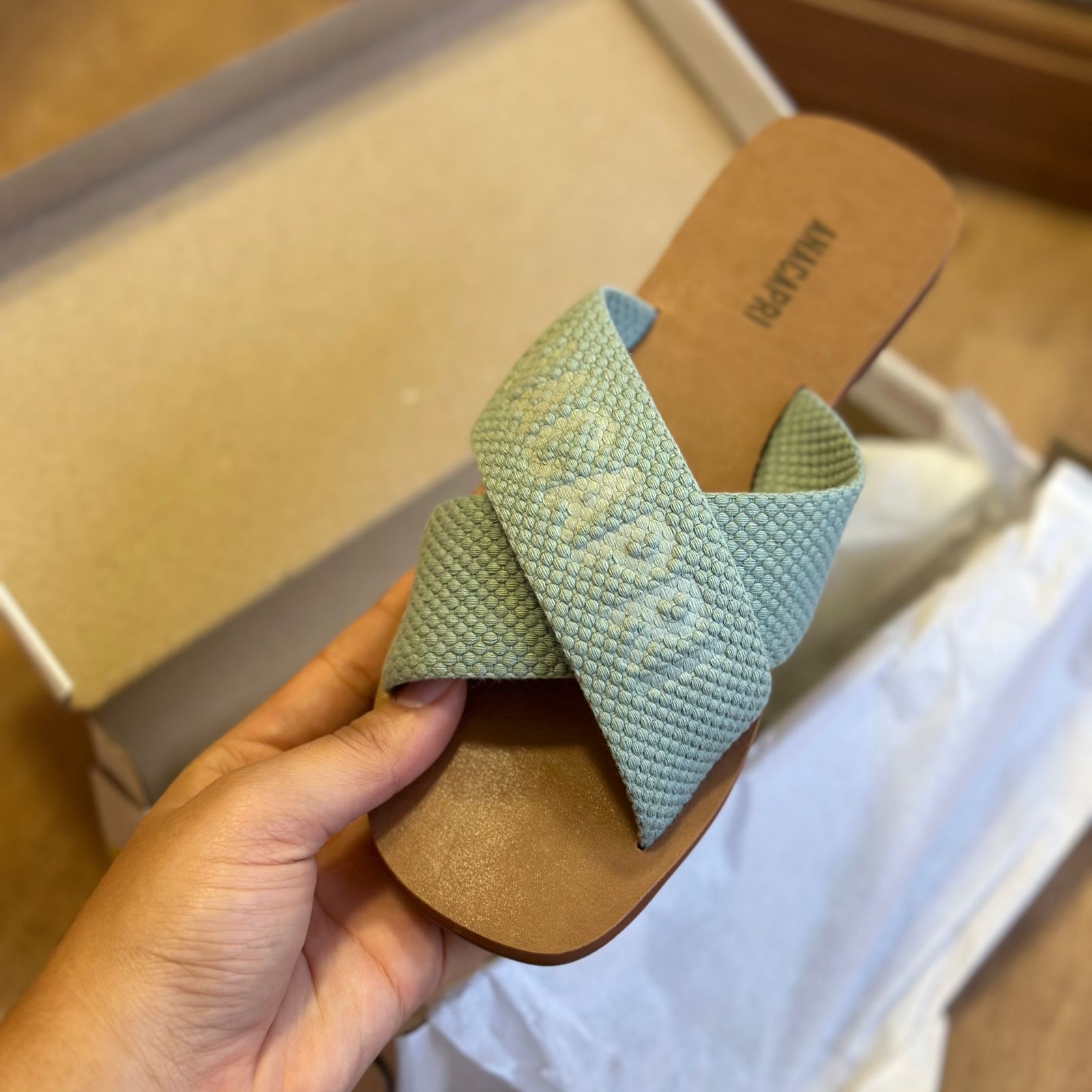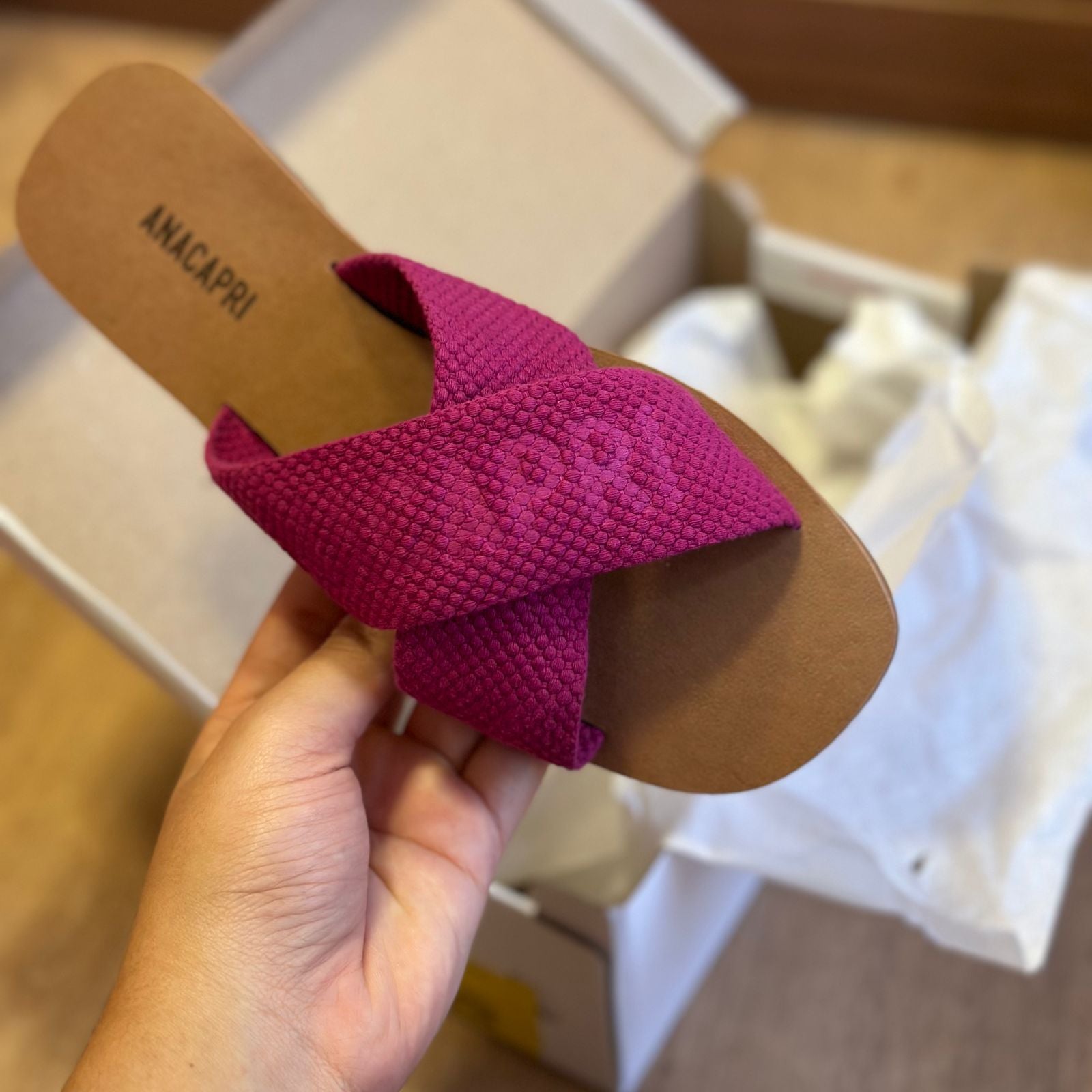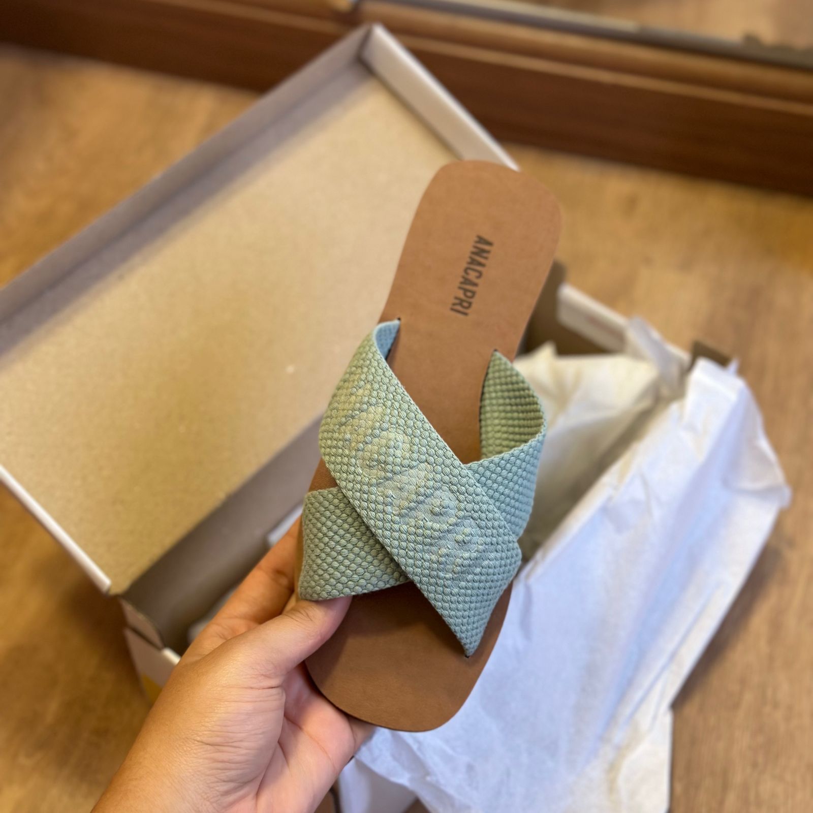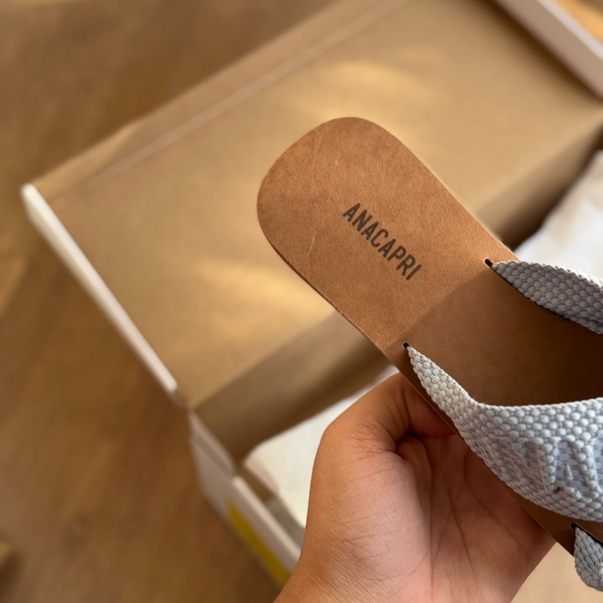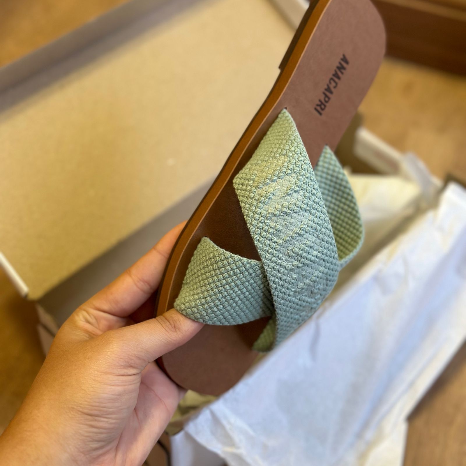 O modelo tem bico quadrado e palmilha marrom com nome da marca. Traz duas tiras largas em fita, cruzadas sobre o peito do pé, com inscrição ANACAPRI em branco. Deixa dedos e calcanhar à mostra.
