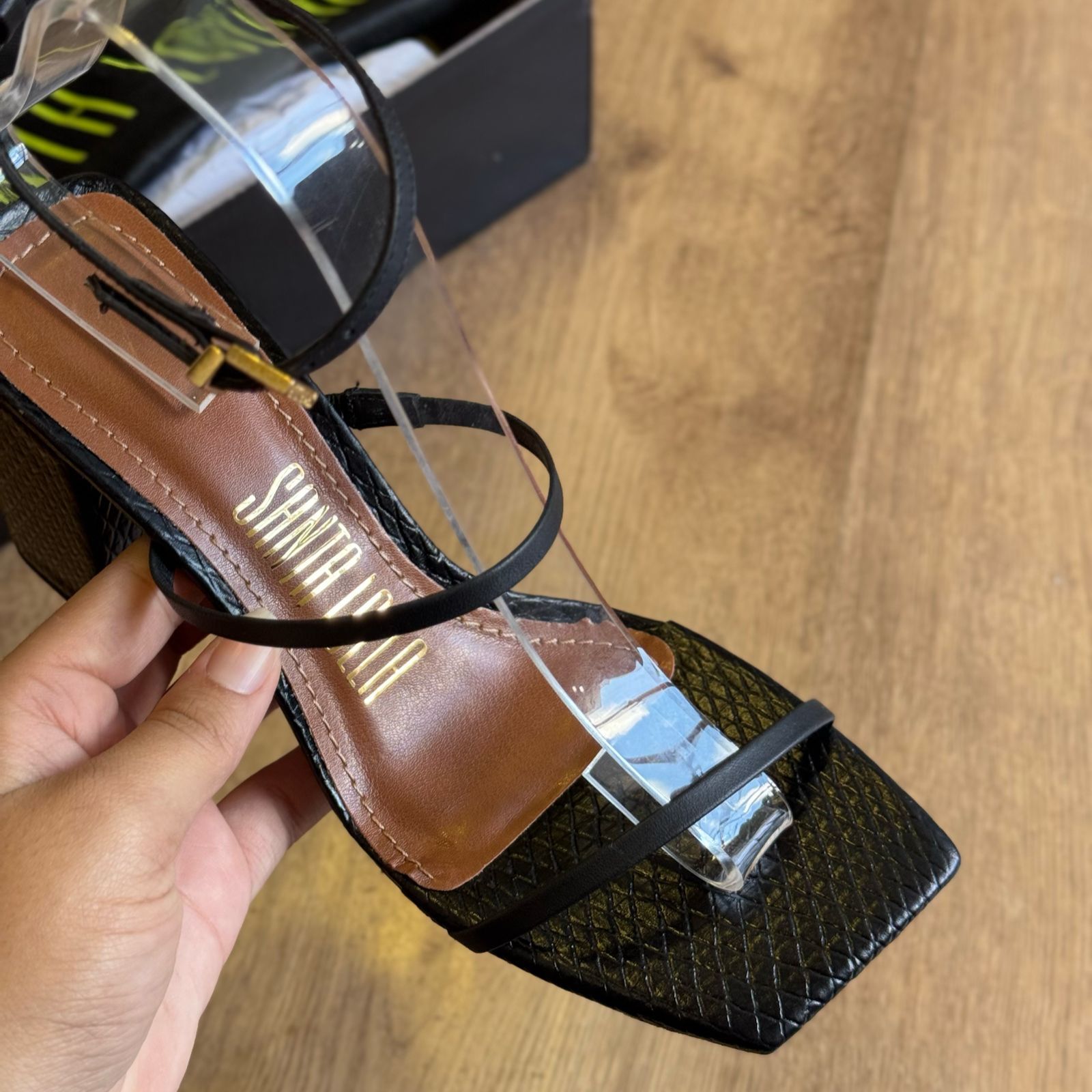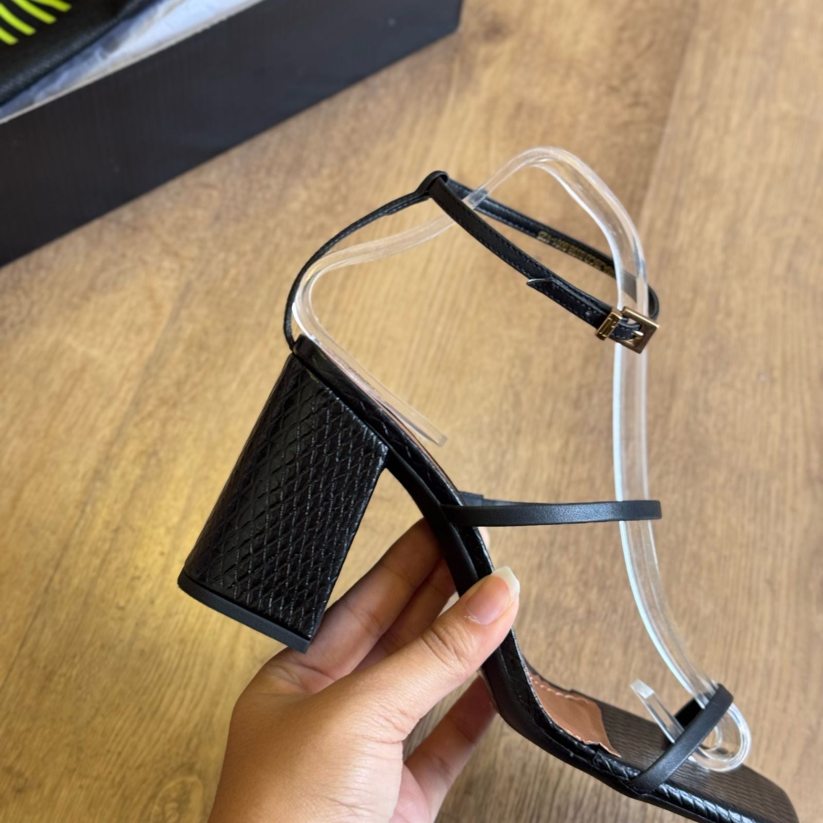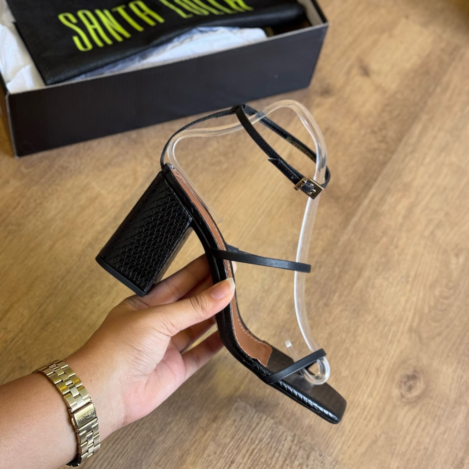Sandália salto alto bloco bico quadrado, confeccionada em couro confort. Este modelo possui tiras finas sobre os dedos e o peito do pé, além de uma tira que contorna o calcanhar e tornozelo, fechando em fivela. Este modelo é ideal para eventos especiais e ocasiões que pedem um toque de glamour e estilo.