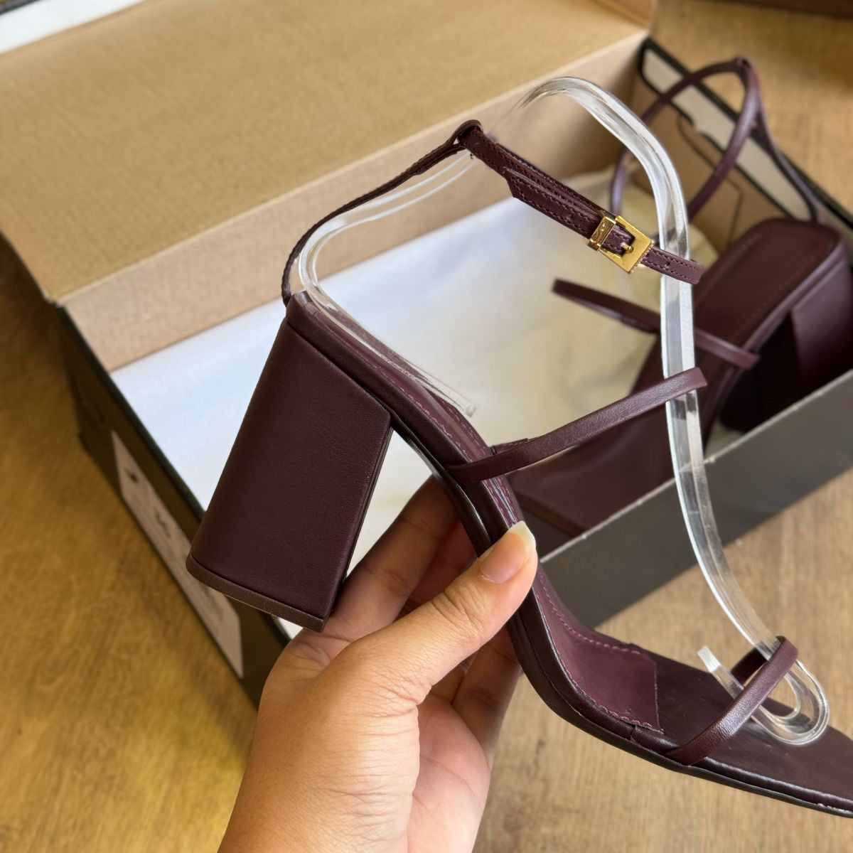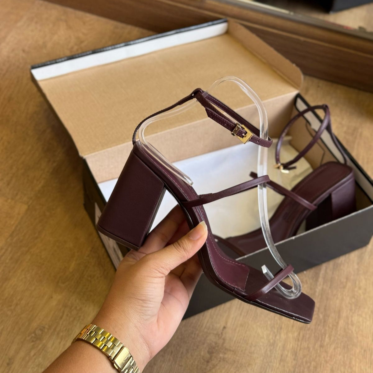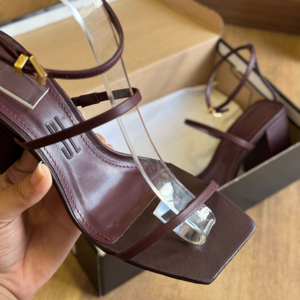 Sandália salto alto bloco bico quadrado, confeccionada em couro confort. Este modelo possui tiras finas sobre os dedos e o peito do pé, além de uma tira que contorna o calcanhar e tornozelo, fechando em fivela. Este modelo é ideal para eventos especiais e ocasiões que pedem um toque de glamour e estilo.