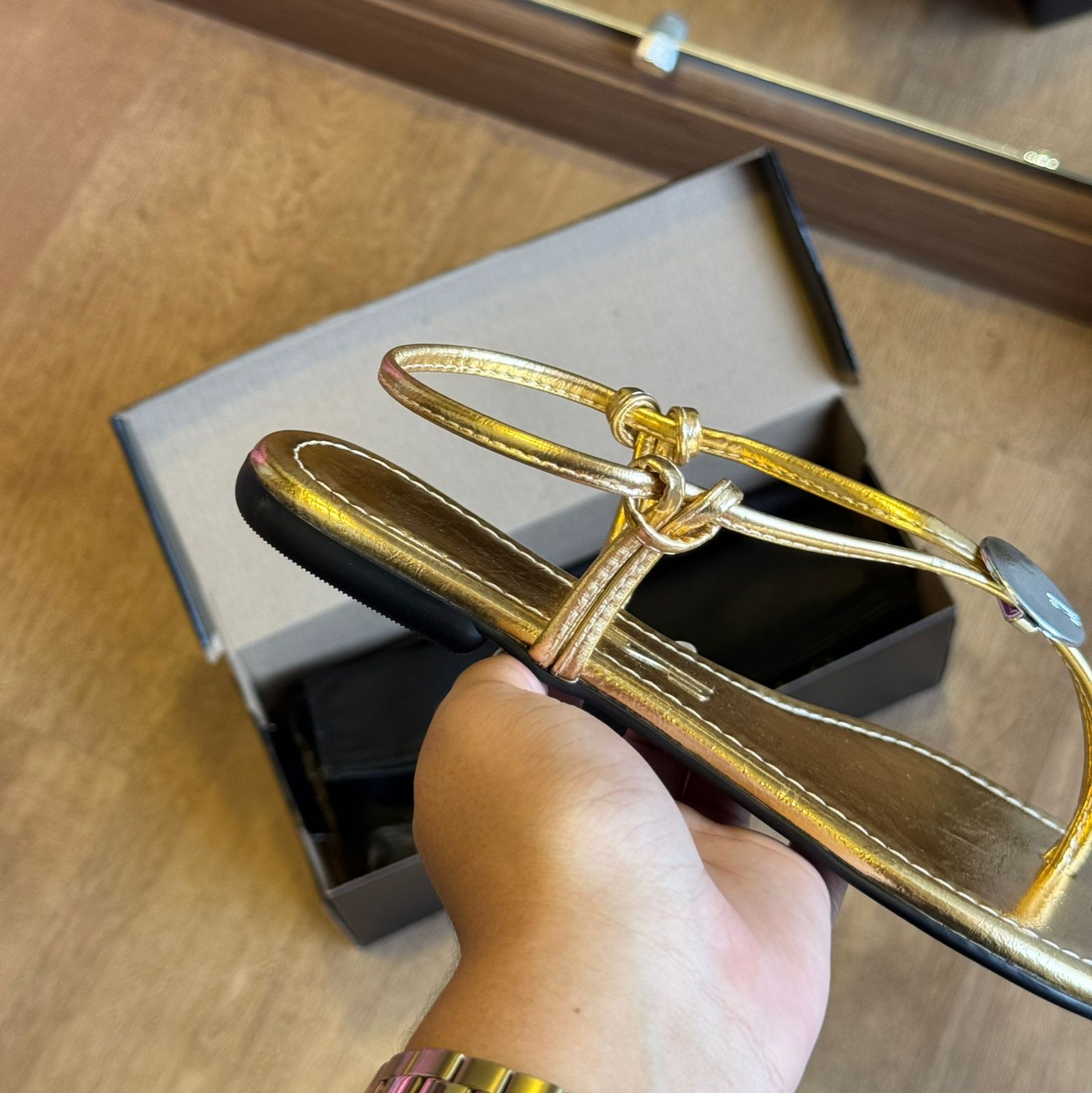 Leve brilho e sofisticação para os seus pés com a rasteira reflexo preta.
