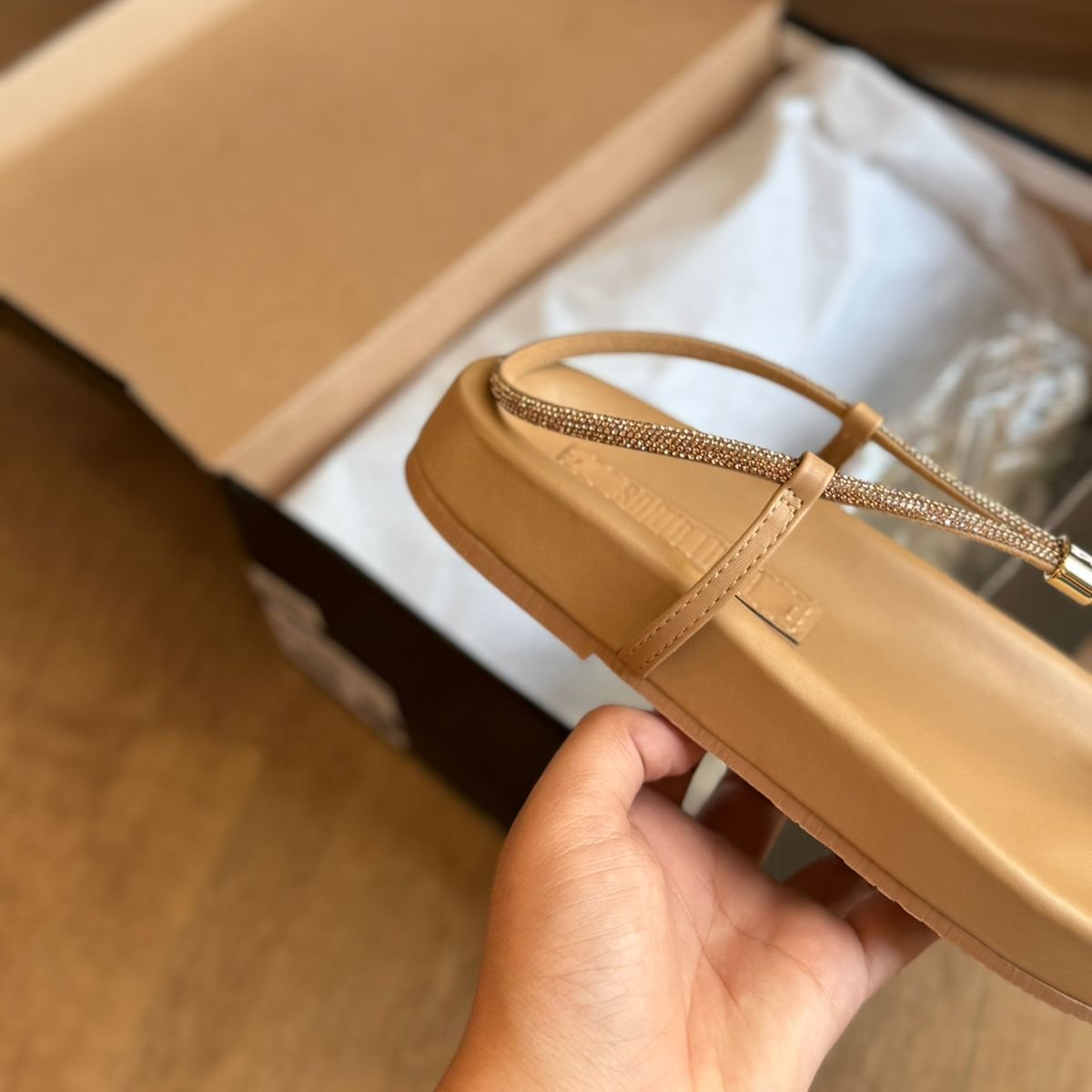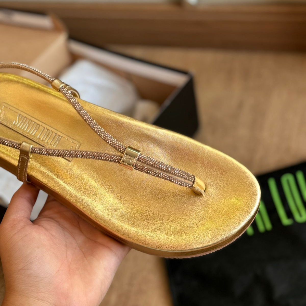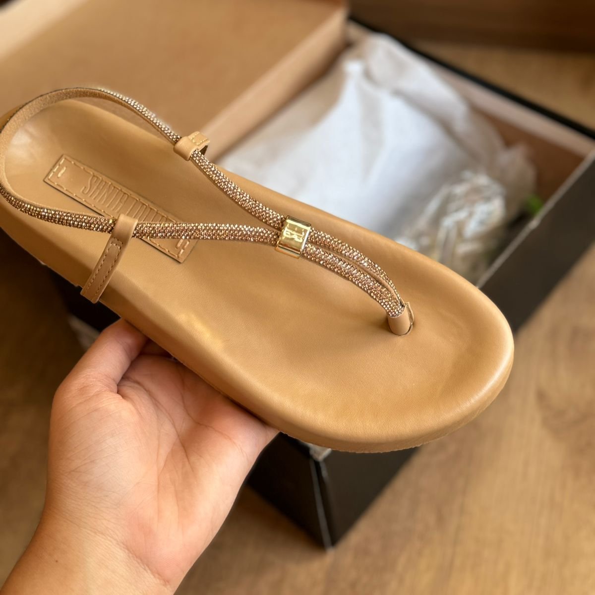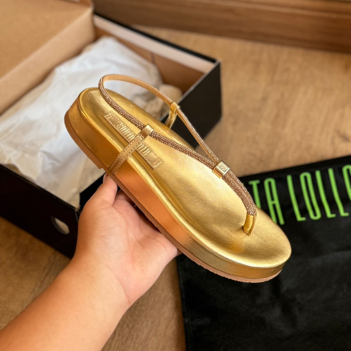 Sandália Papete metalizada confeccionada em material metallic soft. Possui salto flat, bico redondo e se destaca pelas tiras finas adornadas com brilhos em strass. Ideal para adicionar um toque de glamour a qualquer look.