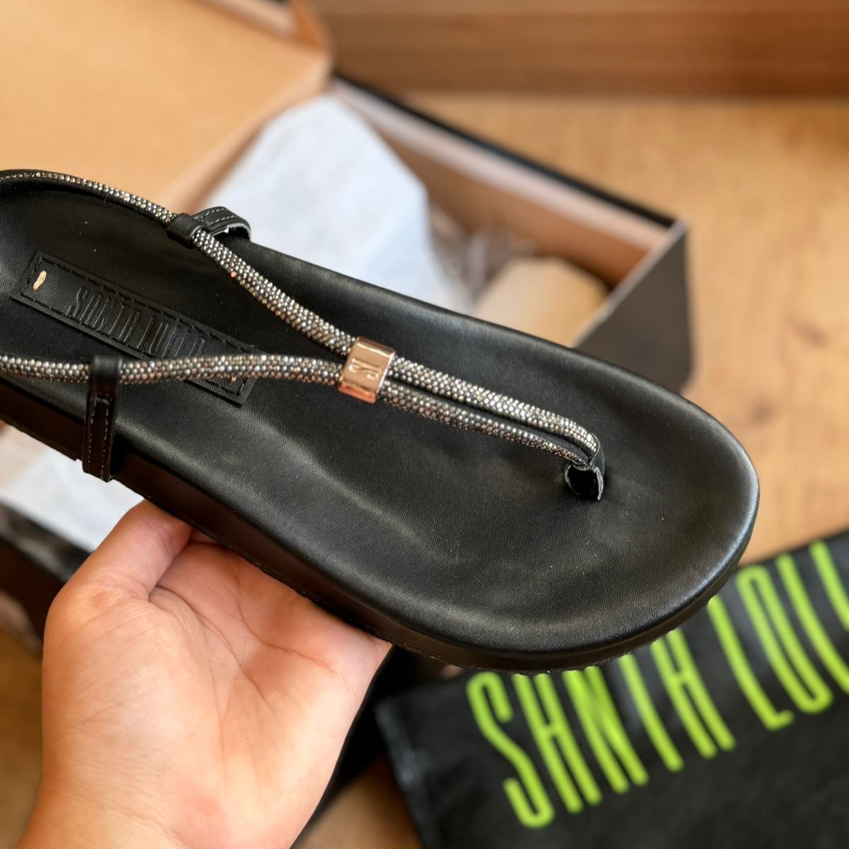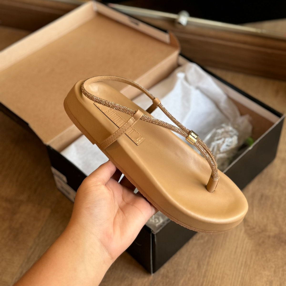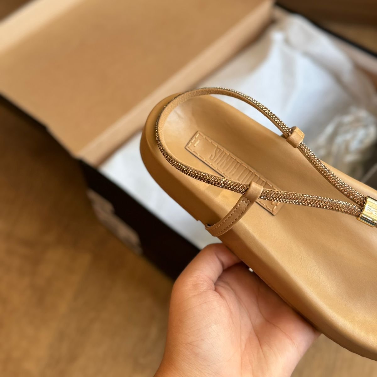 Sandália Papete metalizada confeccionada em material metallic soft. Possui salto flat, bico redondo e se destaca pelas tiras finas adornadas com brilhos em strass. Ideal para adicionar um toque de glamour a qualquer look.