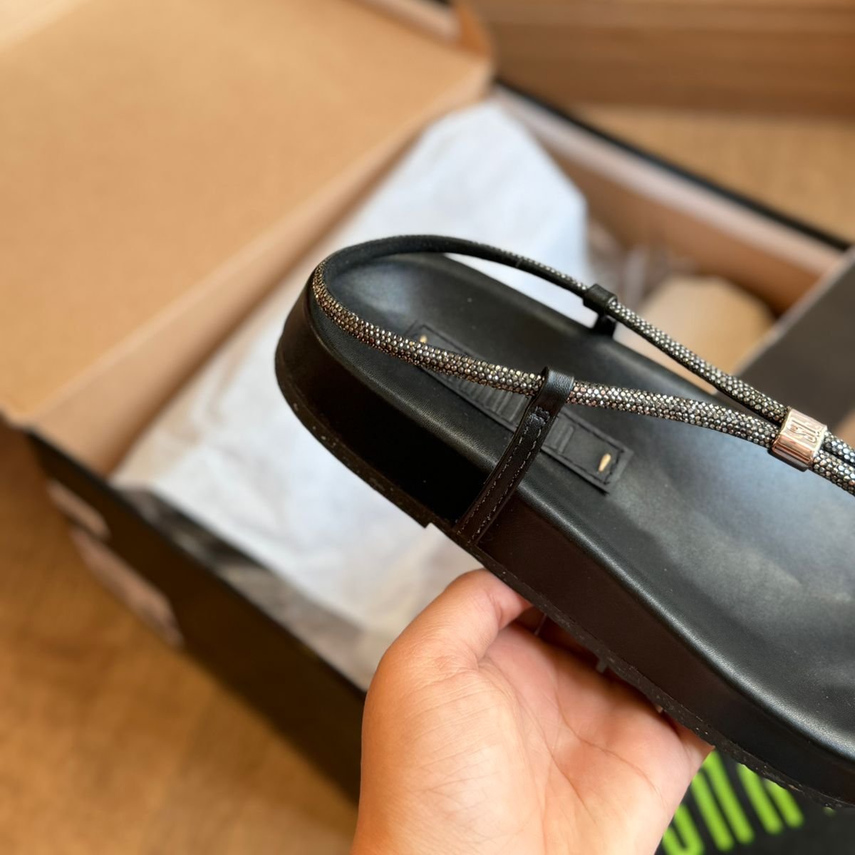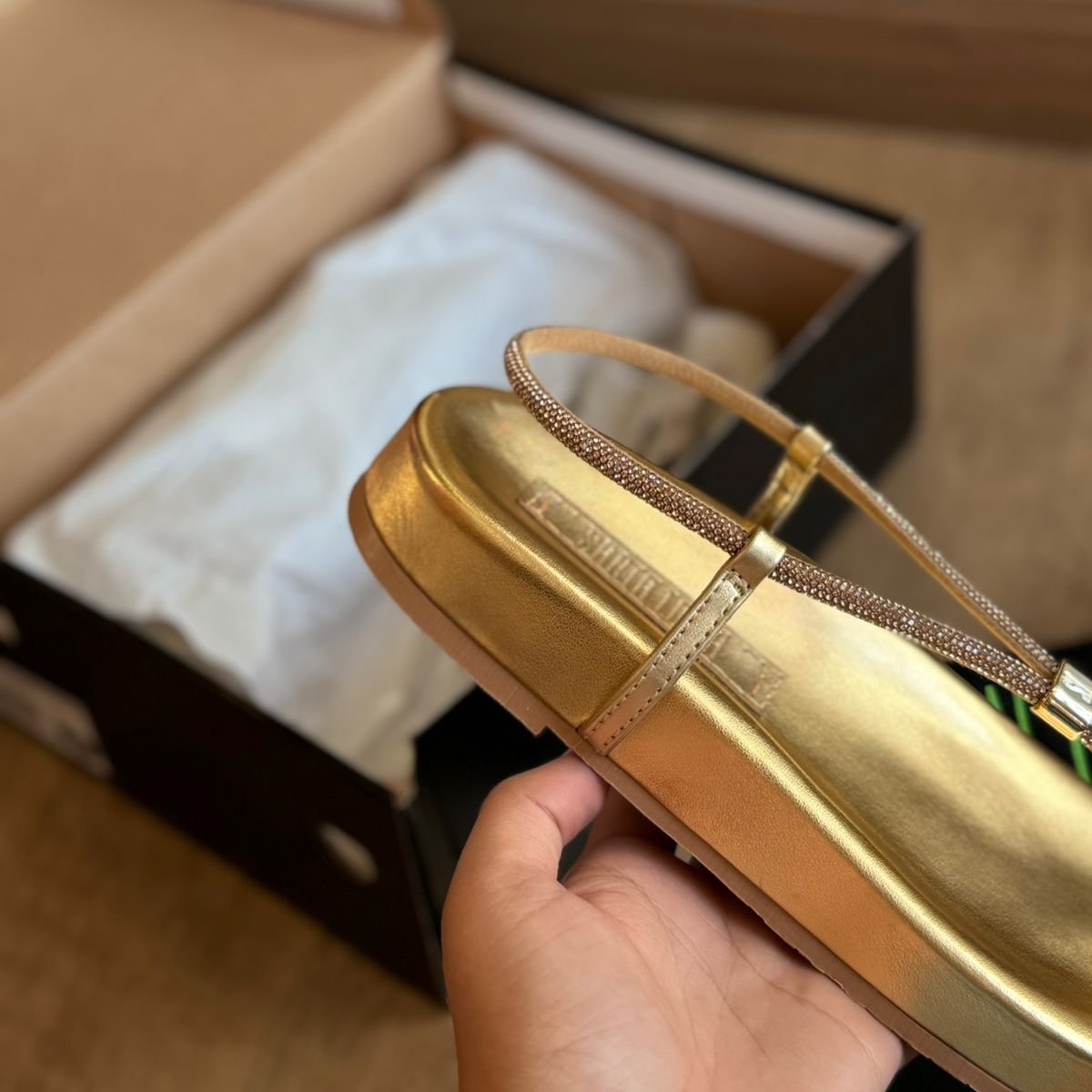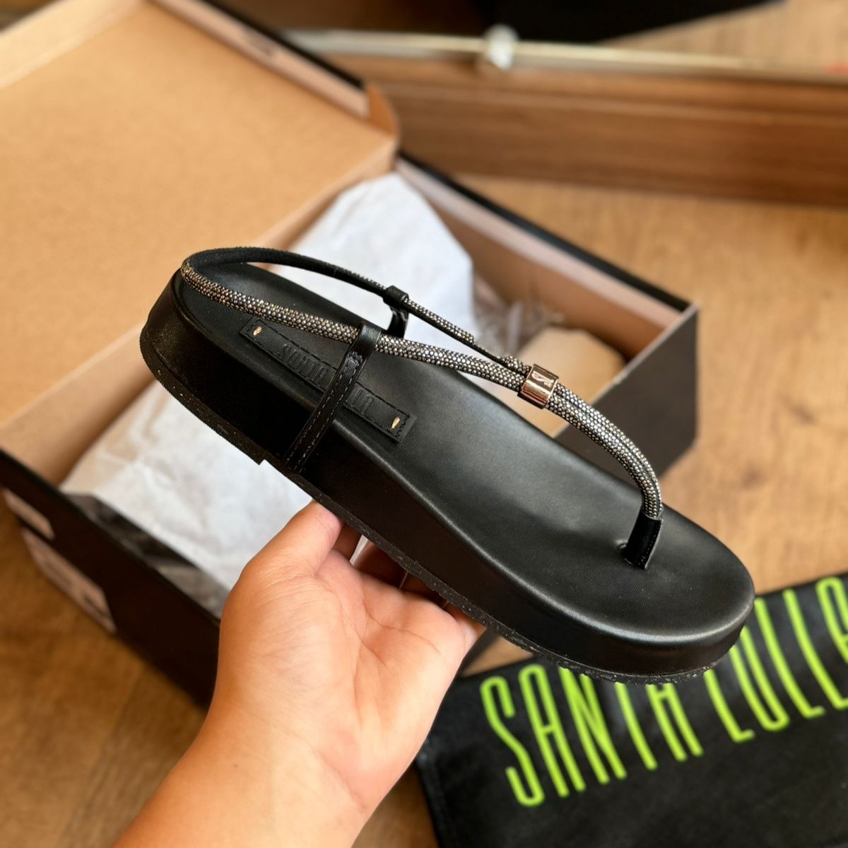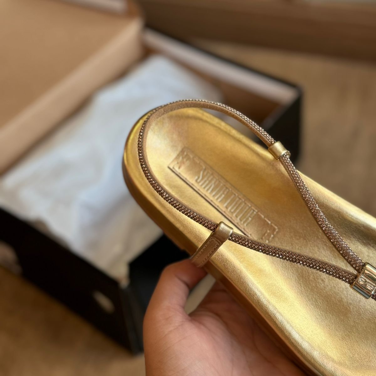 Sandália Papete metalizada confeccionada em material metallic soft. Possui salto flat, bico redondo e se destaca pelas tiras finas adornadas com brilhos em strass. Ideal para adicionar um toque de glamour a qualquer look.