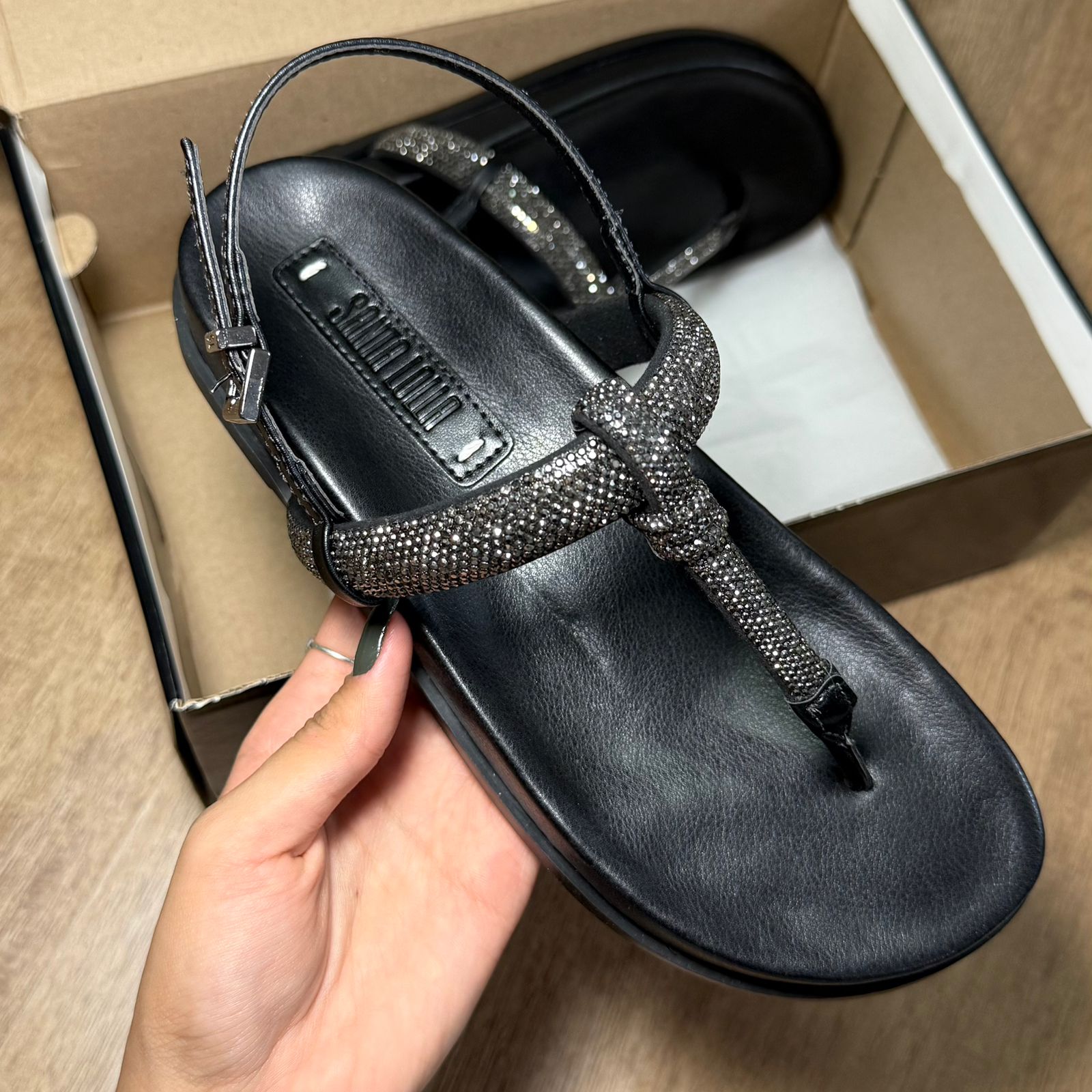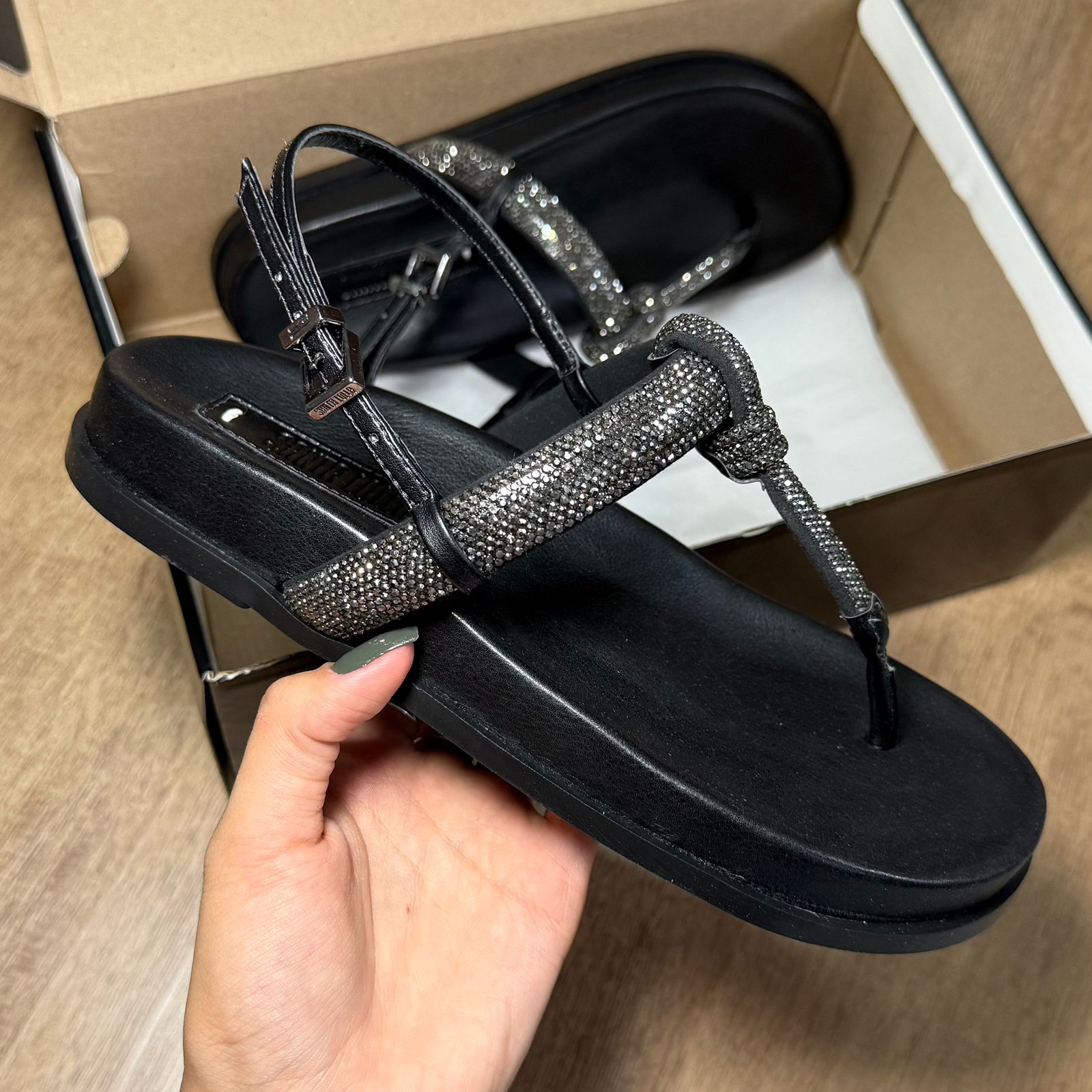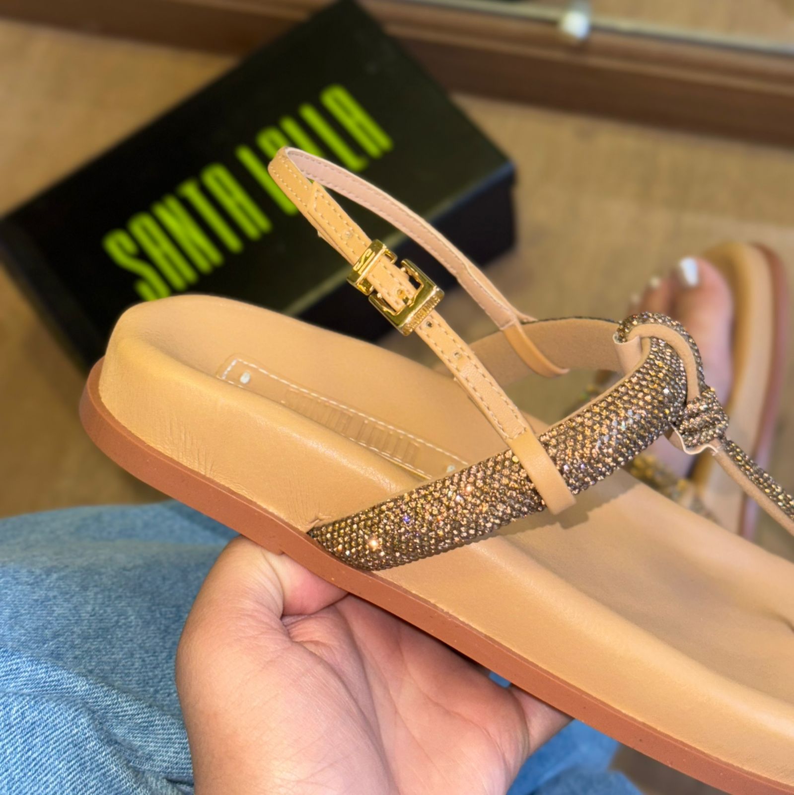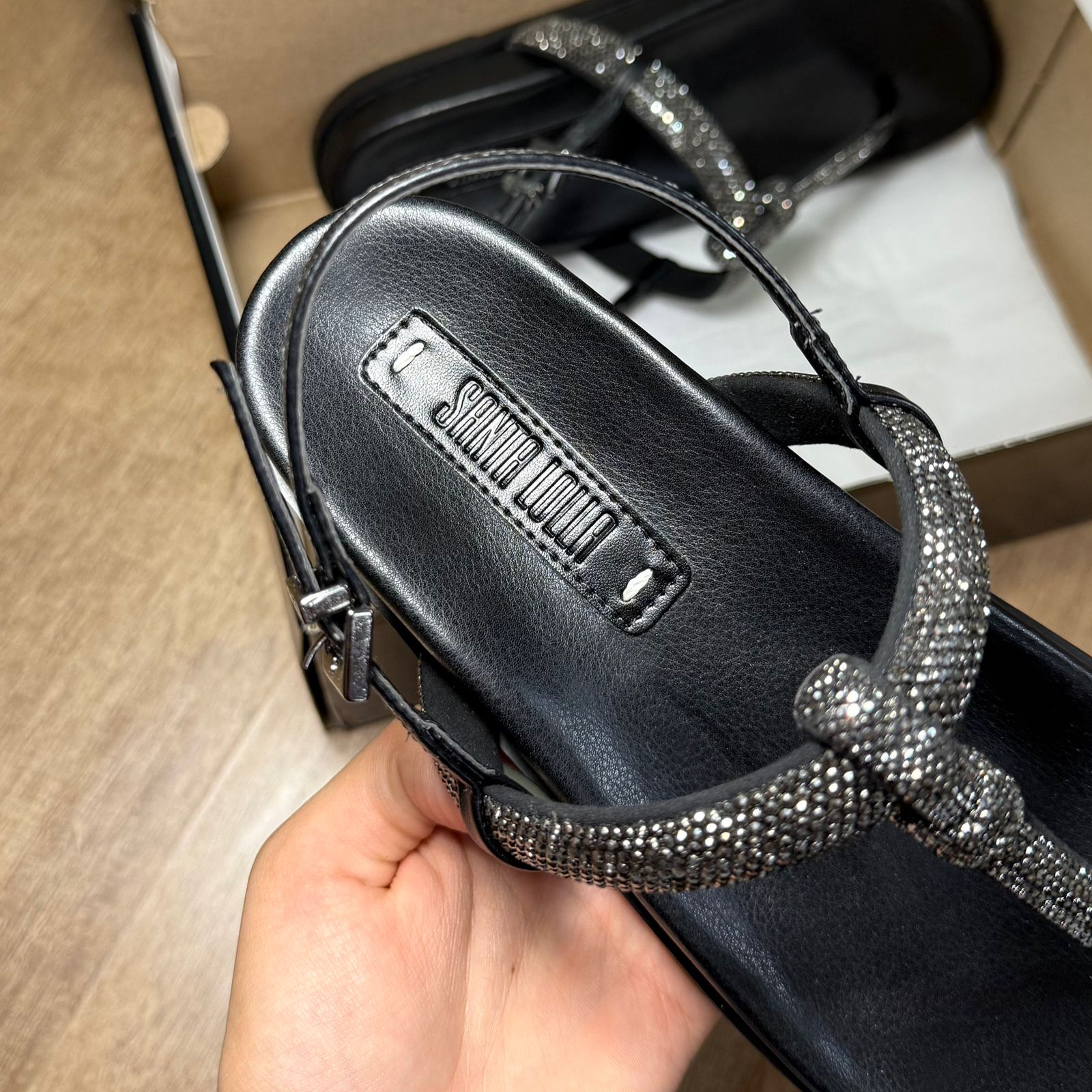 A Sandália Papete Santa Lolla é o equilíbrio perfeito entre conforto e glamour. Com design moderno e tiras adornadas com strass reluzentes, ela transforma qualquer look com um toque de elegância e brilho na medida certa.